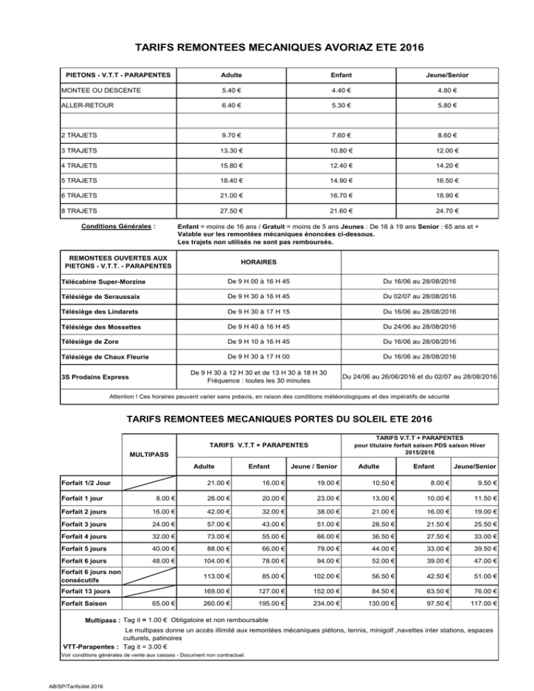TARIFS REMONTEES MECANIQUES AVORIAZ ETE 2016 PIETONS - V.T.T - PARAPENTES Adulte Enfant Jeune/Senior MONTEE OU DESCENTE 5.40 € 4.40 € 4.80 € ALLER-RETOUR 6.40 € 5.30 € 5.80 € 2 TRAJETS 9.70 € 7.60 € 8.60 € 3 TRAJETS 13.30 € 10.80 € 12.00 € 4 TRAJETS 15.80 € 12.40 € 14.20 € 5 TRAJETS 18.40 € 14.90 € 16.50 € 6 TRAJETS 21.00 € 16.70 € 18.90 € 8 TRAJETS 27.50 € 21.60 € 24.70 € Conditions Générales : Enfant = moins de 16 ans / Gratuit = moins de 5 ans Jeunes : De 16 à 19 ans Senior : 65 ans et + Valable sur les remontées mécaniques énoncées ci-dessous. Les trajets non utilisés ne sont pas remboursés. REMONTEES OUVERTES AUX PIETONS - V.T.T. - PARAPENTES HORAIRES Télécabine Super-Morzine De 9 H 00 à 16 H 45 Du 16/06 au 28/08/2016 Télésiège de Seraussaix De 9 H 30 à 16 H 45 Du 02/07 au 28/08/2016 Télésiège des Lindarets De 9 H 30 à 17 H 15 Du 16/06 au 28/08/2016 Télésiège des Mossettes De 9 H 40 à 16 H 45 Du 24/06 au 28/08/2016 Télésiège de Zore De 9 H 10 à 16 H 45 Du 16/06 au 28/08/2016 Télésiège de Chaux Fleurie De 9 H 30 à 17 H 00 Du 16/06 au 28/08/2016 De 9 H 30 à 12 H 30 et de 13 H 30 à 18 H 30 Fréquence : toutes les 30 minutes Du 24/06 au 26/06/2016 et du 02/07 au 28/08/2016 3S Prodains Express Attention ! Ces horaires peuvent varier sans préavis, en raison des conditions météorologiques et des impératifs de sécurité TARIFS REMONTEES MECANIQUES PORTES DU SOLEIL ETE 2016 TARIFS V.T.T + PARAPENTES pour titulaire forfait saison PDS saison Hiver 2015/2016 TARIFS V.T.T + PARAPENTES MULTIPASS Adulte Forfait 1/2 Jour Enfant Jeune / Senior Adulte Enfant Jeune/Senior 21.00 € 16.00 € 19.00 € 10.50 € 8.00 € 9.50 € Forfait 1 jour 8.00 € 26.00 € 20.00 € 23.00 € 13.00 € 10.00 € 11.50 € Forfait 2 jours 16.00 € 42.00 € 32.00 € 38.00 € 21.00 € 16.00 € 19.00 € Forfait 3 jours 24.00 € 57.00 € 43.00 € 51.00 € 28.50 € 21.50 € 25.50 € Forfait 4 jours 32.00 € 73.00 € 55.00 € 66.00 € 36.50 € 27.50 € 33.00 € Forfait 5 jours 40.00 € 88.00 € 66.00 € 79.00 € 44.00 € 33.00 € 39.50 € Forfait 6 jours 48.00 € 104.00 € 78.00 € 94.00 € 52.00 € 39.00 € 47.00 € Forfait 6 jours non consécutifs 113.00 € 85.00 € 102.00 € 56.50 € 42.50 € 51.00 € Forfait 13 jours 169.00 € 127.00 € 152.00 € 84.50 € 63.50 € 76.00 € 260.00 € 195.00 € 234.00 € 130.00 € 97.50 € 117.00 € Forfait Saison 65.00 € Multipass : Tag it = 1.00 € Obligatoire et non remboursable Le multipass donne un accès illimité aux remontées mécaniques piétons, tennis, minigolf ,navettes inter stations, espaces culturels, patinoires VTT-Parapentes : Tag it = 3.00 € Voir conditions générales de vente aux caisses - Document non contractuel. AB/SP/Tarifs/été 2016