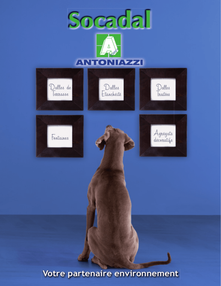 fra nc e Socadal ANTONIAZZI Dalles de Terrasse Fontaines Dalles Etanchéité Dalles Traitées Agrégats décoratifs Votre partenaire environnement Champagne Art. 481 Grenaillées 40x40 cm Structurées 40x40 cm L’éclat de ces dalles est obtenu par une maîtrise du procédé de fabrication. La douceur des revêtements est réalisée par la projection de petites billes d’acier sur la dalle. Grenaillée Le grenaillage des dalles de la série permet de faire ressortir l’éclat des pierres qui l’a constitue tout en les rendant très douce et antidérapantes à la fois. Produit résistant au gel et antidérapant. Usage: Allée, terrasse, piscine. Format Epaisseur Poids Conditionnement Blanc Cassé Rustique Art. 478 Rustiques Les dalles son déclinés dans des tons chauds qui s’adaptent à toutes les régions. 40x40 cm 3,7 cm env. 80 kg/m2 env. 19,20 m2/palette soit 120 dalles Produit résistant au gel et antidérapant. Usage: Allée, terrasse, piscine. Saumon Rustique Art. 473 Gris Rustique Art. 474 Blanc Cassé Art. 482 Format Epaisseur Poids Conditionnement 40x40 cm 3,7 cm env. 80 Kg/m2 env. 19,20 m2/palette soit 120 dalles Champagne Rustique Art. 472 Granit Gris Rose Art. 486 Saumon Grenaillée Art. 471 Granit des Alpes Art. 488 Champagne Grenaillée Art. 470 Granit Rose Moucheté Art. 484 Gris Grenaillée Art. 476 Saumon Art. 485 Granit Gris Art. 441 2 Blanc Cassé Grenaillée Art. 479 3 Lisse Béton Gris Art. 410 Lisse Béton 40x40 cm Gravillons Lavés 40x40 cm Gravillons Concassés 40x40 cm La variété des coloris vous autorise des associations harmonieuses qui participeront à la beauté de votre ouvrage. Une sélection rigoureuse des granulats naturels utilisés permet de faire ressortir l’éclat originel de la roche. Lisse Béton Ces dalles sont dotées de caractéristiques étonnantes qui allient beauté des couleurs et confort d’utilisation. Produit résistant au gel et antidérapant. Usage: Allée, terrasse, piscine. Gravillons Lavés Une sélection rigoureuse des granulats naturels utilisés, permet à toutes les dalles de cette série de faire ressortir l’éclat originel de la roche. Format Epaisseur Poids Conditionnement Produits résistant au gel et antidérapant. Usage: Allée, terrasse, piscine. Format Epaisseur Poids Conditionnement Lisse Béton Blanc Cassè Art. 412 40x40 cm 3,7 cm env. 80 Kg/m2 env. 19,20 m2/palette soit 120 dalles 40x40 cm 3,7 cm env. 80 kg/m2 env. 19,20 m2/palette soit 120 dalles Lisse Béton Rose Orangé Art. 416 Rose et Blanc Fin Art. 462 Jaune et Blanc Fin Art. 463 Gravillon Lavé Beige sur fond Gris Art. 496 Coloris suivants régions Rose et Blanc Art. 455 Gravillon Lavé Art. 494 Crème sur fond gris 4 Jaune et Blanc Art. 454 5 Gamme étanchéité 50x50x5 cm Gravillon Lavé Beige sur fond Gris Art. 596 existe sur fond Blanc Art. 597 Gamme étanchéité 50x50x5 cm Nos dalles 50×50 cm épaisseur 5 cm, peuvent être posées en toiture ou en terrasse pour permettre le séjour ou la circulation des piétons de manière privative ou intensive. Cette gamme peut être posée sur plot. Des contrôles Journaliers de nos agrégats, ainsi que de nos dalles (essais de résistance à la rupture et de porosité dans notre laboratoire) nous permettent de répondre aux caractéristiques de la norme EN 1339. En choisissant nos dalles 50x50, vous pourrez influer sur l’esthétisme et la personnalité de votre terrasse. Grenaillée Champagne empreinte Multi Format Art. 531 Grenaillée Marron Art. 589 Gravillon Concassé Rose et Blanc Fin Art. 562 Gravillon concassé Rose et Blanc Art. 555 Grenaillée Champagne empreinte Lauze Art. 521 Gravillon Concassé Jaune et Blanc Fin Art. 563 Grenaillée Noire moucheté Blanc Art. 542 Gravillon Concassé Jaune et Blanc Art. 554 Grenaillée Gris Art. 580 existe en 50x50x4 Art. 580.4 Grenaillée Saumon Art. 571 Grenaillée Champagne Art. 570 6 7 Granit Gris Rose Art. 586 Gamme étanchéité 50x50x5 cm Decoratives et Grenaillées 40x40 cm Format Epaisseur Poids Conditionnement Ces produits sont de très haute gamme. Tous les dalles sont d’abord adoucies pour exalter la noble matière et après grenaillées ou décorées. Les arêtes sont chanfreinées avec un outil á tête diamantée. 50x50 cm 5 cm env. 115 kg/m2 env. 11,00 m2/palette soit 44 dalles Produit résistant au gel et antidérapant. Usage: Allée, terrasse, piscine. Résistance à la rupture et charge de rupture Classe d’appelation Résistance à la flexion Charge de rupture T11 4,0 11 Véhicule de charges par roue < 2,5 t Pose sur sable ou sur mortier Blanc Cassé Moucheté Art. 583 Format Epaisseur Poids Conditionnement 40x40 cm Slim 3,2 cm env.; Deco 3,5 cm env. Slim 69 kg/m2; Deco 83 kg/m2 env. Slim 21,12 m2/palette soit 132 dalles; Deco 18,56 m2/palette soit 116 dalles Circulation occasionelle et à vitesse réduite Accès piétons exclusivement Pose sur plot Usage collectif ou public Résistance à l’usure par abrasion Granit Rose Moucheté Art. 584 Classe Marquage Prescription 3 H <_ 23 cm Absorption d’eau Champagne Art. 581 existe en 50x50x4 Art. 581.4 Deco Gala Crema Art. 316.2 Classe Marquage Prescription 1 B <_ 6 en moyenne Slim Sirocco Beige Art. 315.2 Granit des Alpes Art. 588 existe en 50x50x4 Art. 588.4 Saumon Art. 585 existe en 50x50x4 Art. 585.4 Rose Orangée Art. 587 8 Granit Gris Art. 541 existe en 50x50x4 Art. 541.4 Slim Gothique Beige Art. 312.13 9 Les Anti-Tache 40x40 cm Decoratives 40x40 cm Deco Granit Gris Art. 402.4 Rose Pourpre Art. 452.1 Les dalles de cette série sont très innovantes. Elles font l’objet d’un traitement anti-tache en usine. Ce traitement augmente le niveau de résistance de la dalle aux éventuelles taches. Le traitement n’altère ni l’aspect, ni les caractéristiques naturelles de la dalle. Produit résistant au gel et antidérapant. Usage: Allée, terrasse, piscine. Format Epaisseur Poids Conditionnement 40x40 cm 3,8 cm env. 87 kg/m2 env. 16,64 m2/palette soit 104 dalles Blanc Art. 452.2 Dec