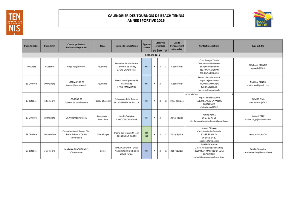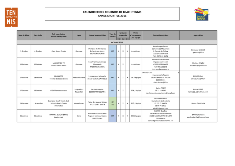 CALENDRIER DES TOURNOIS DE BEACH TENNIS ANNEE SPORTIVE 2016 Date de début Date de fin Club organisateur Intitulé de l'épreuve Ligue Lieu de la compétition Epreuves organisés Type de tournoi DD DM DX Droits d'engagement par équipe Contact inscriptions Juge-arbitre A confirmer Coqs Rouges Tennis Domaine de Moulerens 2 Chemin de Pichey 33170 GRADIGNAN Tél : 05 56 89 64 74 Stéphane GERVAIS [email protected] A confirmer Tennis club Marmande Impasse jean bouin 47200 MARMANDE Tel: 0553208678 [email protected] Mathieu RENOU [email protected] OCTOBRE 2015 3 Octobre 4 Octobre Coqs Rouge Tennis Guyenne Domaine de Moulerens 2 chemin de pichey 33170 GRADIGNAN Guyenne beach tennis piscine de Marmande 47200 MARMANDE FFT X X FFT X X 10 Octobre MARMANDE TC tournoi beach tennis 17 octobre 18 octobre COGNAC TC Tournoi de beach tennis Poitou-Charente 3 Impasse de la Rouche 16130 GENSAC LA PALLUE 17 Octobre 18 Octobre CIS Villlemoustaussou LanguedocRoussillon Lac de Cavayère 11000 CARCASSONNE 1 Novembre Ouanalao Beach Tennis Club St Barth Beach Tennis in Paradise 31 octobre MARANA BEACH TENNIS L'automnale 10 Octobre FFT FFT X X X X X DUMAS Chris 29 Octobre 31 octobre Guadeloupe Plaine des jeux de St Jean 97133 SAINT BARTH Corse MARANA BEACH TENNIS Plage de tombulu biancu 20600 furiani ITF G2 FFT X X X X X X X 10€ / équipes impasse de la Rouche 16130 GENSAC LA PALLUE 0682285661 [email protected] 3 DUMAS Chris [email protected] 20 € / équipe Karine PEREZ 06 21 12 41 05 [email protected] Karine PEREZ [email protected] 70 $ / équipe Laurent DELAVAL Capitainerie de Gustavia 97133 ST BARTH 06 90 75 14 32 [email protected] Hector FIGUEROA 20€ /équipes BARTHE Caroline 28 Ter Route de San Martino 20200 SAN MARTINO DI LOTA 0670350054 [email protected] BARTHE Caroline [email protected] Date de début Date de fin Club organisateur Intitulé de l'épreuve Ligue Lieu de la compétition Epreuves organisés Type de tournoi DD DM DX Droits d'engagement par équipe Contact inscriptions Juge-arbitre 70 $ / équipe Julie LABRIT Cul de Sac 97150 SAINT MARTIN 06 90 57 83 92 [email protected] Hector FIGUEROA NOVEMBRE 2015 6 Novembre 8 Novembre Banana Boat Beach Tennis Guadeloupe Orient Beach / Waikiki Plage de la Baie Orientale 97150 SAINT MARTIN 13 Novembre 14 Novembre Friendly Caribbean Beach Tennis Open de Saint Martin Guadeloupe Palm Beach Orient Bay 97150 SAINT MARTIN ITF G3 X X 40 € / équipe Jérémy NEDELEC 06 90 55 64 84 [email protected] Jérémy NEDELEC [email protected] 13 Novembre 15 Novembre Bourbon Brisant Beach Tennis Open 3B Réunion Plage des Brisants 97434 SAINT GILLES LES BAINS ITF G3 X X 26 € / équipe Bourbon Brisants Beach Tennis 62 Chemin Summer 97434 SAINT GILLES LES BAINS [email protected] Jonathan RALITE [email protected] A confirmer TC du Nord le complexe sportif du carbet 97221 Carbet 0596784750 [email protected] 22 Novembre 22 Novembre 27 Novembre 22 novembre TC du Nord 22 novembre OLYMPIQUE GRANDE-SYNTHE 1ere édition tournoi de beach tennis indoor 29 Novembre Gwada Beach Tennis Karukera ITF G4 Le Moule ITF G2 X X Martinique A confirmer FFT Flandres Haras de Jusin, Route des dunes 59229 UXEM FFT Guadeloupe Plaine de Beach Tennis du Moule 97160 LE MOULE ITF G4 x X X x X 10€ / équipes X LARANGE Christophe [email protected] Gwada Beach Tennis Maison Fauchery, Lauréal 97160 LE MOULE 06 90 69 82 08 [email protected] Mathieu ANDREOLETTI [email protected] A confirmer TSC KOUROU av. des Roches 97388 KOUROU CEDEX 0694204030 [email protected] N'GUYEN VAN KY Boris [email protected] 40 € / équipe Sud Beach Tennis Club 53 Impasse Georges Brassens 97430 TAMPON [email protected] Harry NUNDLOLL [email protected] 35 € / équipe pour le DD et DM X Deconinck Kevin 59240 dunkerque 0668160068 [email protected] MUHEL Jacques [email protected] X 25 € / équipe pour le DX DECEMBRE 2015 12 Décembre 12 Décembre TSC KOUROU Beach Tennis TSCK 17 Décembre 20 Décembre Sud Beach Tennis Club Trophée SBTC ITF G1 Guyanne A confirmer FFT X X Réunion Beach Stadium de la Ravine Blanche 97410 SAINT PIERRE ITF G1 X X X Date de début Date de fin Club organisateur Intitulé de l'épreuve Ligue Lieu de la compétition Epreuves organisés Type de tournoi DD DM DX Droits d'engagement par équipe Contact inscriptions Juge-arbitre A confirmer Beach Tennis Martinique Bourg de Schoelcher 97233 SCHOELCHER [email protected] 06 96 71 10 10 Lionel GRANGENOIS [email protected] Claude SAY [email protected] JANVIER 2016 24 Janvier 24 Janvier Beach Tennis Martinique Beach Kolor Martinique A confirmer FFT X X FEVRIER 2016 20 Février 21 Février Open Peugeaot SBTC Tournament 28 Février 28 Février Gwada Beach Tennis Happy open Beach Tennis Réunion Beach Stadium de la Ravine Blanche 97410 SAINT PIERRE ITF 0$ X X 20 € / équipe Matthieu COULET 34 Rue des Mariniers 97432 RAVINE DES CABRIS [email protected] 0262 692 21 01 57 Guadeloupe A confirmer FFT X X A confirmer A confirmer Mathieu ANDREOLETTI [email protected] 30 € / équipes Tennis Club de Saint François Les Raisons Clairs 97118 Saint François 05 90 88 75 61 [email protected] Julie SESE [email protected] 15 € / équipe LYONNETTE Johan 1 chemin de la Bouvarderie 45450 Fay aux Loges 0648702323 [email protected] PAREY Xavier [email protected] Philippe GROS [email protected] Philippe GROS [email protected] MARS 2016 5 Mars 6 Mars TENNIS CLUB DE SAINT FRANCOIS Open Beach Tennis BNP Paribas 6 Mars BEACH TENNIS CLUB ORLEANS Tournoi hivernal du BTCO 17 Mars 24 Mars 5 Mars Guadeloupe Plage des Raisins Clairs - Saint François FFT X X Centre Base de loisir de l'Ile Charlemagne FFT 20 Mars Open International des Brisants Réunion Plage des Brisants 97434 SAINT GILLES LES BAINS ITF 10 000 $ X X X 55 $ / équipe Bourbon Brisants Beach Tennis 62 Chemin Summer 97434 SAINT GILLES LES BAINS [email protected] 262 692 91 80 11 27 Mars Gwada Beach Tennis International Guadeloupe Plaine de Beach Tennis du Moule 97160 LE MOULE ITF 10 000 $ X X X 55 $ / équipe Gwada Beach Ten