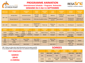 PROGRAMME ANIMATION Entertainment Schedule – Programa Animación SEMAINE DU 3 AU 11 SEPTEMBRE SAMEDI 3 SEPT DIMANCHE 4 SEPT MARDI 6 SEPT MERCREDI 7 SEPT JEUDI 8 SEPT VENDREDI 9 SEPT SAMEDI 10 SEPT DIMANCHE 11 SEPT Attrape-Reve Guirlande colorée Ma carte postale Crée ton masque Mémory Création de jumelles Maya L'abeille Guirlande colorée De quoi rèves-tu? Tomate Ketchup Parcours du combattant Petits jeux du globe trotteur 16H - 18H Olympiades Koh Lanta Concours de Château de sable Time's Up Chasse au trésor Circus Time Fort Boyard Loup Garou SPORT SAMEDI 3 SEPT DIMANCHE 4 SEPT MARDI 6 SEPT MERCREDI 7 SEPT JEUDI 8 SEPT VENDREDI 9 SEPT SAMEDI 10 SEPT DIMANCHE 11 SEPT Foot Abdos fessiers Ping Pong Cross Fit Circuit training Abdos Fessiers Aquagym Basket Aquagym Water Polo MINI CLUB 10H - 12H 10H30 11H30 12H40 Circuit training Aquagym Abdos Fessiers Hockey Aquagym CRAZY SIGNS Volley Beach Soccer Hand ball Danse du papier Jeux collectif journal Petits jeux du globe trotteur 15H 16H 17H45 Water Polo Foot Zumba Aqua Volley Basket Aqua Volley Ping Pong 18H15 18h45 : Pot d'accueil MINI DISCO MINI DISCO Football Aquagym Water Polo Basket MINI DISCO Beach Volley Zumba 18h45 : Pot d'accueil Aquagym Basket MINI DISCO SOIREES RDV : Fitness au show anim, Sport directement sur les espaces sportifs. En cas de pluie, RDV au show anim pour une activité de remplacement. SAMEDI 3 SEPT MERCREDI 7 SEPT 20H30 MINI DISCO MINI DISCO 21H Mini Show Quiz 21H30 LOTO BOYS AND GIRLS 22H30 DANCEFLOOR POT D’ACCUEIL SAMEDI 18h45 A L’ARENA Pétanque Aquagym Aquagym CRAZY SIGNS JEUDI 8 SEPT TOURNOI NOCTURNE VENDREDI 9 SEPT SAMEDI 10 SEPT MINI DISCO MINI DISCO Quiz QUIZ TIERCE DE LA DANSE KARAOKE DANCEFLOOR