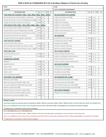 TARIF et BON de COMMANDE 2013 de la Boutique Upignac à Frasnes-lez-Anvaing NOM: GSM: COURRIEL: DATE SOUHAITEE D'ENLEVEMENT: LES PRODUITS FRAIS €/U U Tél FOIE GRAS DE CANARD (100g; 150g ;200g; 300g; 500g; 1000g) Bloc de foie gras de canard "Prestige" à la découpe 95,00 € /kg Foie gras de canard au torchon "Prestige"pièce de 250gr 32,50 € Foie gras de canard au torchon à la découpe /p Magret fumé entier 29,00 € /kg Magret farci au foie gras 40,00 € /kg Magret en croûte d’herbes 29,00 € /kg * Magret à la toscane (prin-été) 29,00 € /kg * 29,00 € /kg * /p * Magret aux fruits des bois (aut - hiv) Ficelle de bloc de foie gras de canard, pièce de 150gr 12,50 € /p * Saucisson de canard * FOIE CRU DE CANARD * /p * Escalopes de canard (20 x 50gr) 45,00 € /kg * Escalopes de canard (6 x 50gr) 16,50 € /p 12,95 € /p 9,90 € Lobe entier de foie de canard cru 60,00 € /kg * Escalopes d'oie (4x50gr) Duo d’escalopes de foie gras de canard cru (frais) 70,00 € /kg * Raviole au foie gras (12 pièces) 9,90 € /p Foie gras de canard cru dénervé (par sous-vide +- 500gr) 75,00 € /kg * Raviole au homard (12 pièces) 9,90 € /p FOIE CRU D'OIE * LES CAILLES FARCIES Lobe entier de foie d’oie cru 75,00 € /kg * Caille au foie gras (automne-hiver) 7,50 € /p * Foie gras fumé 70,00 € /kg * Caille aux champignons (automne/hiver) 7,50 € /p * Caille aux raisins (automne-hiver) 7,50 € /p * 7,50 € /p * Cassoulet de Castelnaudary 760gr 6,90 € /p Parmentier de canard 400gr 7,55 € /p * Moussaka de canard 400gr 10,70 € /p * Canard à la Basquaise 400gr 10,70 € /p * VIANDE DE CANARD Magret cru 18,90 € /kg * Caille à la tomate confite (printemps-été) Aiguillettes fraîches 20,50 € /kg * LES PLATS CUISINES Cuisse confite Cuisse confite et fumée Q LES SURGELES 130,00 € /kg 99,00 € /kg /p * 35,00 € Foie gras d'oie Apicius (aux figues) à la découpe 5,50 € Tél LES SALAISONS DE CANARD Foie gras d'oie au torchon "Prestige",pièce de 250gr Foie gras d'oie au torchon à la découpe U Magret fumé prétranché (100g) 120,00 € /kg 105,00 € /kg €/U * FOIE GRAS D'OIE (100g; 150g ;200g; 300g; 500g; 1000g) Bloc de foie gras d'oie "Prestige" à la découpe LES PRODUITS FRAIS Q 9,90 € /kg 12,95 € /kg Gésiers confits 4,50 € p Ravier de graisse de canard 1,89 € p * * LES PATES & LES TERRINES LES PRODUITS DE LA MER Rillettes de canard 200gr 3,75 € /p Poche de mousse de saumon fumé 250gr ** 6,95 € /p * Rillette de canard AU FOIE GRAS 200gr NEW 6,95 € /p Poche de mousse de crabe 250gr ** 6,95 € /p * Mousse de magret fumé 200gr (terrine operculée) 5,50 € /p Terrine de Saint-Jacques au cerfeuil 500gr 14,95 € /p * Pâté de canard nature 250gr 6,00 € /p Terrine de mousse de homard au basilic 500gr 14,95 € /p * Pâté de canard au foie gras et cognac 250gr 9,90 € /p LES COLIS CADEAUX Pâté de chevreuil au foie gras 250gr (en saison) 9,90 € /p Réalisation de colis cadeaux "A la Carte" Pâté de faisan au foie gras 250gr(en saison) 9,90 € /p * DURANT L'ANNEE Ouvert toute l'année les mercredis, jeudis et vendredis de 10h00 à 18h00 et le samedi de 10h00 à 12h00 - FERME du 02/01/14 au 07/01/2014 et du 23/07/14 au 05/08/14 incl. Nous vous conseillons de nous envoyer votre commande avant le mardi 11h30 afin de vérifier la disponibilité de nos produits en les ateliers d'Upignac. * Uniquement sur commande ou selon le stock en Boutique DU 16 DECEMBRE 2013 au 31 DECEMBRE 2013, Ouvert tous les jours de 10h00 à 19h00. FERME à 16h00 le 21 décembre 2013 (Réception de Mariage) et, toute la journée le 25 décembre 2013 Nous vous conseillons de nous envoyer votre commande au plus tard 72 heures avant la date d'enlèvement afin de vérifier la disponibilité de nos produits en les ateliers. * Uniquement sur commande ou selon le stock en Boutique Téléphone: +32 (0)69 859449 - Fax: +32 (0)69859039 - [email protected] - www.upignac.net TARIF et BON de COMMANDE 2013 de la Boutique Upignac à Frasnes-lez-Anvaing NOM: GSM: COURRIEL: DATE SOUHAITEE D'ENLEVEMENT: L'EPICERIE FINE €/U U Tél LES TRUFFES FRAÎCHES Q L'EPICERIE FINE €/U U Tél * LES CONFITS & GELEES La truffe de printemps prix jour /g * Gelée à l’armagnac fraîche 200g 2,50 € /p La truffe d'été prix jour /g * Gelée au porto 135 g 3,90 € /p La truffe d'automne prix jour /g * Gelée au muscat 135 g 3,90 € /p La truffe d'hiver prix jour /g * Confiture oignons 290gr 4,95 € /p Confit d'oignons 135g 3,90 € /p LES TRUFFES LONGUES CONSERVATIONS Truffes été bocal 25g 7,50 € /p Confit de figues au pain d’épices 135gr 3,90 € /p Truffes hiver bocal 15g 25,00 € /p Confit de pommes poires speculoos 135gr 3,90 € /p Carpaccio truffes 45g 10,90 € /p Gelée d'Hypocras 50gr 2,65 € /p Jus truffe 100g 25,10 € /p * Gelée d'Hypocras 110gr 4,50 € /p Sauce champignons et truffes été (tartufata) 80g 5,70 € /p * Gelée d'Hypocras 200gr 6,00 € /p Tagliatelles à la truffe 250g 9,90 € /p * Gelée de Floc de Gascogne blanc ou rouge 6,00 € /p * Tortellinis à la truffe 9,90 € /p * Gelée de Coquelicots 125 g 3,50 € /p * Huile truffe noire 55ml 6,50 € /p Gelée de Fleur de Violette 125 g 4,00 € /p * Huile truffe noire 250ml 18,90 € /p Gelée de pétale de Rose 125 g 4,00 € /p * Huile truffe blanche 55ml 7,20 € /p Gelée de piment d'Espelette 100 g 4,50 € /p * Huile truffe blanche 250ml 19,90 € /p Confit de banane flambée 125 g 4,00 € /p * Confit de Clémentines au pain d'épices 125 g 4,00 € /p * * * LES FOIES GRAS EN VERRINES Verrines à la fleur de sel 50 g 6,90 € /p Confit de mi-figues mi-raisin 125 g 4,00 € /p * Verrines à la figue 50 g 6,90 € /p Confit de pommes caramelisées au Calvados 125 g 5,50 € /p * Verrines au poivre 50 g 6,90 € /p Confit de Sauternes 125 g 6,00 € /p * Verrines au Sauternes 50 g 6,90 € /p Crème de Chataigne au foie gras et Cèpes 110 g 4,20 € /p * 13,90 € /p Confit d'oignons de Mulhouse