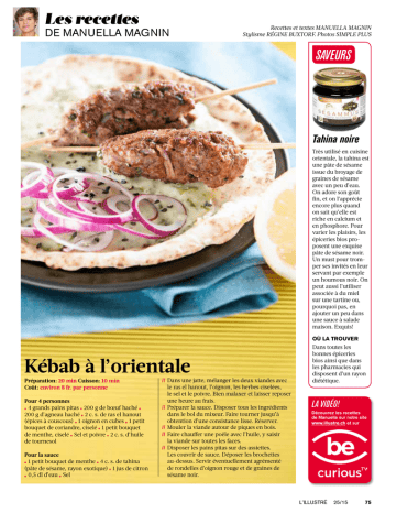 Les recettes DE MANUELLA MAGNIN Recettes et textes MANUELLA MAGNIN Stylisme RÉGINE BUXTORF. Photos SIMPLE PLUS SAVEURS Tahina noire Très utilisé en cuisine orientale, la tahina est une pâte de sésame issue du broyage de graines de sésame avec un peu d’eau. On adore son goût fin, et on l’apprécie encore plus quand on sait qu’elle est riche en calcium et en phosphore. Pour varier les plaisirs, les épiceries bios proposent une exquise pâte de sésame noir. Un must pour tromper ses invités en leur servant par exemple un houmous noir. On peut aussi l’utiliser associée à du miel sur une tartine ou, pourquoi pas, en ajouter un peu dans une sauce à salade maison. Exquis! OÙ LA TROUVER Kébab à l’orientale Préparation: 20 min Cuisson: 10 min Coût: environ 8 fr. par personne Pour 4 personnes • 4 grands pains pitas • 200 g de bœuf haché • 200 g d’agneau haché • 2 c. s. de ras el hanout (épices à couscous) • 1 oignon en cubes • 1 petit bouquet de coriandre, ciselé • 1 petit bouquet de menthe, ciselé • Sel et poivre • 2 c. s. d’huile de tournesol Pour la sauce • 1 petit bouquet de menthe • 4 c. s. de tahina (pâte de sésame, rayon exotique) • 1 jus de citron • 0,5 dl d’eau • Sel //Dans une jatte, mélanger les deux viandes avec le ras el hanout, l’oignon, les herbes ciselées, le sel et le poivre. Bien malaxer et laisser reposer une heure au frais. //Préparer la sauce. Disposer tous les ingrédients dans le bol du mixeur. Faire tourner jusqu’à obtention d’une consistance lisse. Réserver. //Mouler la viande autour de piques en bois. //Faire chauffer une poêle avec l’huile, y saisir la viande sur toutes les faces. //Disposer les pains pitas sur des assiettes. Les couvrir de sauce. Déposer les brochettes au-dessus. Servir éventuellement agrémenté de rondelles d’oignon rouge et de graines de sésame noir. Dans toutes les bonnes épiceries bios ainsi que dans les pharmacies qui disposent d’un rayon diététique. LA VIDÉO! Découvrez les recettes de Manuella sur notre site www.illustre.ch et sur L’ILLUSTRÉ 25/15 75 Les recettes DE MANUELLA MAGNIN EN EXCLUSIVITÉ Par Knut Schwander Terrasse de rêve 13/20 Kébab de féra Préparation: 15 min Cuisson: 6 min Coût: environ 6 fr. par personne Pour 4 personnes • 2 filets de féra de 150 g environ • 1 c. s. de paprika • 1 c. s. de curry • 1 cm de gingembre râpé finement • 3 c. s. de vinaigre • 6 c. s. d’huile d’olive • 1 poignée de salade verte • 1 tomate • 1 oignon rouge • 4 petits pains pitas Pour la sauce • ½ yogourt à la grecque • 1 filet de jus de citron • 10 feuilles de menthe • 1 gousse d’ail • Sel • Poivre //Mélanger le curry, le paprika, le gingembre, le vinaigre et l’huile d’olive. En enduire 76 L’ILLUSTRÉ 25/15 Si vous êtes amateur de croquant, n’hésitez pas à glisser quelques cubes de concombre dans la sauce qui accompagne le kébab de féra! Et, si vous avez la chance d’avoir un barbecue, vous pouvez y griller votre poisson et vos brochettes en plein air. le poisson à l’aide d’un pinceau. Réserver au réfrigérateur durant une heure. //Ciseler la menthe. Hacher l’ail. Ajouter au yogourt avec le jus de citron. Saler et poivrer. //Huiler une poêle. Couper chaque filet de féra en deux. Saisir le poisson côté peau. Le retourner au bout de cinq minutes. Poursuivre la cuisson une minute côté chair. Pendant que le poisson cuit, faire chauffer le pain au four à 200 °C durant cinq minutes. //Couper le pain pita. Laisser la vapeur s’échapper. Y disposer la salade, du poisson, les rondelles d’oignon et un peu de tomate. Servir avec la sauce au yogourt. Pour les amateurs de sensations fortes, ajouter un peu de sauce piquante. // LE CHÂTEAU D’OUCHY Place du Port 2 021 331 32 32 www.chateaudouchy.ch Ouvert tous les jours Prix: de 50 à 79 fr. // POINTS GAULTMILLAU 19/20 Cuisine hors norme 18/20 Très grande cuisine 17/20 Grande cuisine 16-15/20 Cuisine remarquable 14-13/20 Cuisine recherchée 12/20 Bonne cuisine simple STYLISME: RÉGINE BUXTORF, PHOTOS: SIMPLE PLUS L’ASTUCE Dans ce château à l’architecture néomédiévale prolongé d’un restaurant en verrière et d’un deck au charme maritime, on déguste une cuisine méditerranéenne de qualité teintée de produits locaux sous la houlette du chef du Lausanne Palace, Edgard Bovier. Le carpaccio de SaintJacques au combava est une pure merveille d’équilibre et de fraîcheur où la chair fondante du mollusque, juste saisie par l’acidité de l’agrume indonésien, est tendrement adoucie par un coulis de mangue tout en légèreté. Encore un peu d’exotisme avec ces belles crevettes parfaitement saisies et sublimées par de délicieuses épices tandoori. L’épaule d’agneau confite aux herbes sauvages, fondante, arrive accompagnée de pommes de terre et d’artichauts croquants aux tomates séchées rappelant le Sud. Les desserts sont classiques mais bien réalisés, à l’image de ce vacherin glacé revisité aux fruits exotiques, léger et très gourmand. Carte des vins courte mais bien construite. Service aimable et professionnel, mais souvent débordé aux heures de grande affluence.