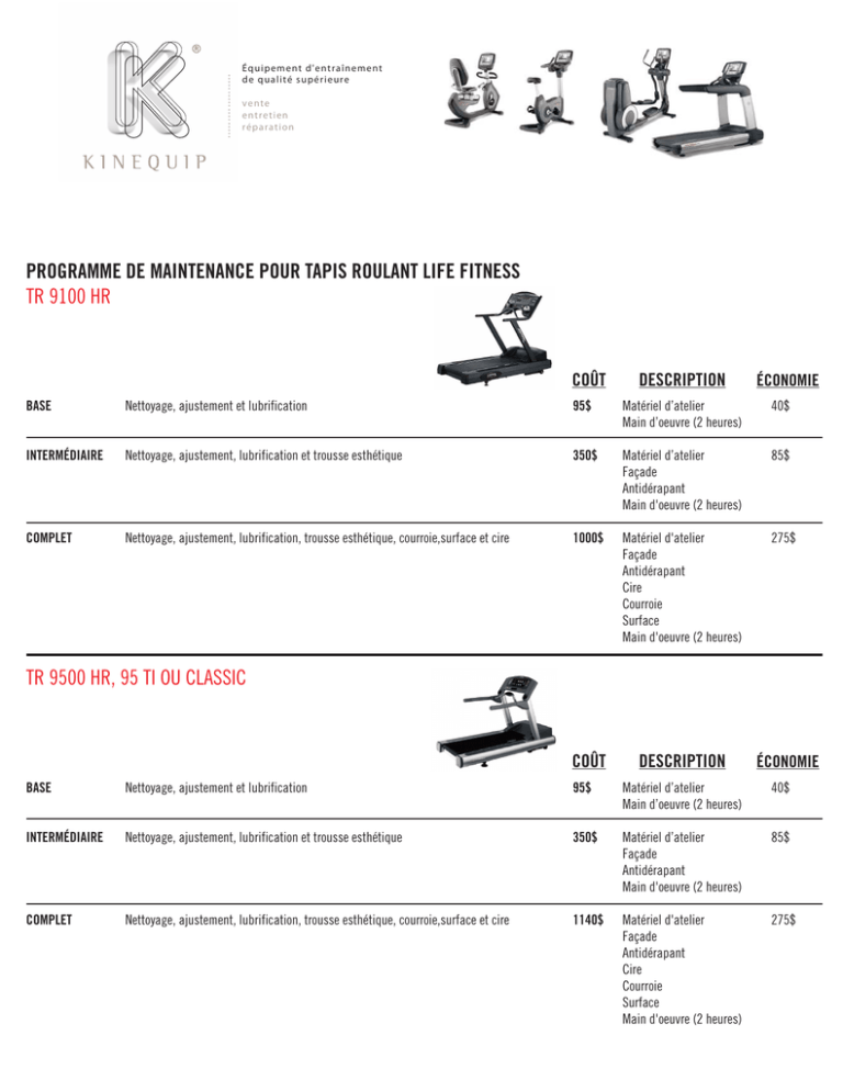 ................... Équipement d'entraîne m e n t de qualité supérieure vente entretien réparation PROGRAMME DE MAINTENANCE POUR TAPIS ROULANT LIFE FITNESS TR 9100 HR COÛT DESCRIPTION ÉCONOMIE BASE Nettoyage, ajustement et lubrification 95$ Matériel d’atelier Main d’oeuvre (2 heures) 40$ INTERMÉDIAIRE Nettoyage, ajustement, lubrification et trousse esthétique 350$ Matériel d’atelier Façade Antidérapant Main d'oeuvre (2 heures) 85$ COMPLET Nettoyage, ajustement, lubrification, trousse esthétique, courroie,surface et cire 1000$ Matériel d'atelier Façade Antidérapant Cire Courroie Surface Main d'oeuvre (2 heures) 275$ COÛT DESCRIPTION TR 9500 HR, 95 TI OU CLASSIC ÉCONOMIE BASE Nettoyage, ajustement et lubrification 95$ Matériel d’atelier Main d’oeuvre (2 heures) 40$ INTERMÉDIAIRE Nettoyage, ajustement, lubrification et trousse esthétique 350$ Matériel d’atelier Façade Antidérapant Main d'oeuvre (2 heures) 85$ COMPLET Nettoyage, ajustement, lubrification, trousse esthétique, courroie,surface et cire 1140$ Matériel d'atelier Façade Antidérapant Cire Courroie Surface Main d'oeuvre (2 heures) 275$ PROGRAMME DE MAINTENANCE POUR VÉLO LIFE FITNESS COÛT DESCRIPTION ÉCONOMIE BASE Nettoyage, ajustement et lubrification 55$ Matériel d’atelier Main d’oeuvre (1 heure) 15$ INTERMÉDIAIRE Nettoyage, ajustement, lubrification et trousse esthétique 125$ Matériel d’atelier Façade Kit de pédale Main d'oeuvre (1 heure) 40,34$ COMPLET Nettoyage, ajustement, lubrification, trousse esthétique et pédalier 345$ Matériel d'atelier Façade Kit de pédalier Chaine ou courroie Kit de pédale Main d'oeuvre (2 heures) 134,99$ COÛT DESCRIPTION ÉCONOMIE PROGRAMME DE MAINTENANCE POUR ÉLLIPTIQUE LIFE FITNESS BASE Nettoyage, ajustement et lubrification 65$ Matériel d’atelier Main d’oeuvre (2 heures) 10$ INTERMÉDIAIRE Nettoyage, ajustement, lubrification et trousse esthétique 145$ Matériel d’atelier Façade Kit de pédale Main d'oeuvre (2 heures) 85,34$ COMPLET Nettoyage, ajustement, lubrification, trousse esthétique et roulement 345$ Matériel d'atelier Façade Kit de tige Kit de linckage Main d'oeuvre (2 heures) 134,99$ 3550, 1e Rue Saint-Hubert, Québec J3Y 8Y5 | Tel: (514) 525-3332 ou 1 (888) 525-3332 | Fax: (514) 666-5815 | www.kinequip.ca