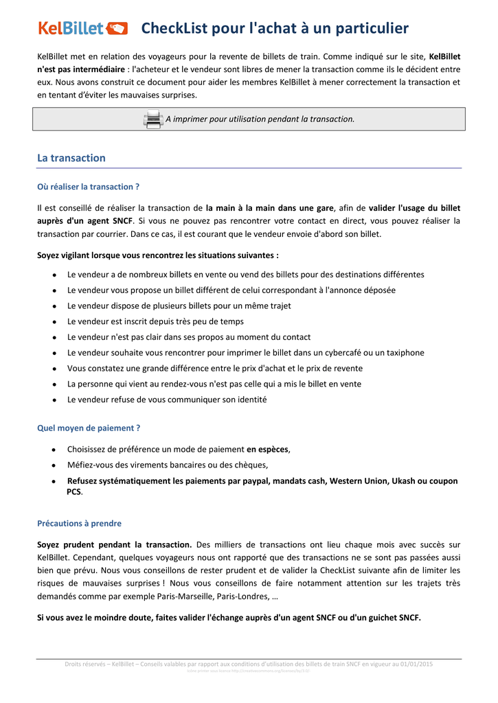 CheckList pour l'achat à un particulier KelBillet met en relation des voyageurs pour la revente de billets de train. Comme indiqué sur le site, KelBillet n'est pas intermédiaire : l'acheteur et le vendeur sont libres de mener la transaction comme ils le décident entre eux. Nous avons construit ce document pour aider les membres KelBillet à mener correctement la transaction et en tentant d’éviter les mauvaises surprises. A imprimer pour utilisation pendant la transaction. La transaction Où réaliser la transaction ? Il est conseillé de réaliser la transaction de la main à la main dans une gare, afin de valider l'usage du billet auprès d'un agent SNCF. Si vous ne pouvez pas rencontrer votre contact en direct, vous pouvez réaliser la transaction par courrier. Dans ce cas, il est courant que le vendeur envoie d'abord son billet. Soyez vigilant lorsque vous rencontrez les situations suivantes : Le vendeur a de nombreux billets en vente ou vend des billets pour des destinations différentes Le vendeur vous propose un billet différent de celui correspondant à l'annonce déposée Le vendeur dispose de plusieurs billets pour un même trajet Le vendeur est inscrit depuis très peu de temps Le vendeur n'est pas clair dans ses propos au moment du contact Le vendeur souhaite vous rencontrer pour imprimer le billet dans un cybercafé ou un taxiphone Vous constatez une grande différence entre le prix d'achat et le prix de revente La personne qui vient au rendez-vous n'est pas celle qui a mis le billet en vente Le vendeur refuse de vous communiquer son identité Quel moyen de paiement ? Choisissez de préférence un mode de paiement en espèces, Méfiez-vous des virements bancaires ou des chèques, Refusez systématiquement les paiements par paypal, mandats cash, Western Union, Ukash ou coupon PCS. Précautions à prendre Soyez prudent pendant la transaction. Des milliers de transactions ont lieu chaque mois avec succès sur KelBillet. Cependant, quelques voyageurs nous ont rapporté que des transactions ne se sont pas passées aussi bien que prévu. Nous vous conseillons de rester prudent et de valider la CheckList suivante afin de limiter les risques de mauvaises surprises ! Nous vous conseillons de faire notamment attention sur les trajets très demandés comme par exemple Paris-Marseille, Paris-Londres, … Si vous avez le moindre doute, faites valider l'échange auprès d'un agent SNCF ou d'un guichet SNCF. Droits réservés – KelBillet – Conseils valables par rapport aux conditions d’utilisation des billets de train SNCF en vigueur au 01/01/2015 Icône printer sous licence http://creativecommons.org/licenses/by/3.0/- La check-list de KelBillet Étape 1 : Le billet est-il conforme à l’annonce ? Vérifiez que les informations suivantes correspondent à l’annonce du billet sur KelBillet Le tarif : Prem’s, iDTGV, Loisir, No-Flex, Standard, Non Flex, Ouigo, ... Le format : billet classique cartonné (20*8 cm), billet imprimé© (A4 21*29.7cm), billet Eurostar, billet iDTGV, billet Ouigo, billet Thello Le prix, le prix auquel vous achetez le billet ne doit pas être supérieur au prix indiqué sur le billet La date et l’heure La classe : 1ère ou 2nde Si vous avez coché les 5 cases, passez à l’étape 2. Sinon, faites valider l'échange et l’usage du billet à un guichet SNCF, puis passez à la troisième étape Étape 2 : Pouvez-vous utiliser ce billet ? Pour les billets de train, consultez les points 1 à 1.9 Pour les billets de bus, consultez le point 2 Pour les billets d'avion, consultez le point 3 Train 1. Quel est le format du billet ? Format Classique cartonné, allez en 1.1 Format Billet Imprimé® SNCF, allez en 1.2 Format Billet Imprimé® Eurostar, allez en 1.3 Format Billet Imprimé iDTGV, allez en 1.4 Format Billet Imprimé Ouigo, allez en 1.5 Format Billet Imprimé Thello, allez en 1.6 Format E-Billet, allez en 1.7 Format Ticketless, allez en 1.8 Autre, allez en 1.9 1.1. Le billet est de format classique cartonné (20cm x 8cm) ? Billet au tarif prem’s / No-Flex : même si un autre nom que le vôtre est indiqué sur le billet, vous pouvez voyager avec ce billet. Le nom indiqué sur le billet ne fait référence qu'au dossier. Billet au tarif carte Jeune, Senior +, Enfant +, week-end : vous pouvez utiliser ce billet si vous disposez d’une carte commerciale, valide et à votre nom, qui correspond au tarif. Elle sera à présenter lors du contrôle dans le train. Vérifiez aussi que le billet n’est pas soumis à d'autres conditions particulières (ex : aller/retour obligatoire,…) Billet au tarif Loisir Réduit / Semi-Flex : les billets au tarif Loisir réduit ou Semi-Flex sont échangeables et remboursables sous conditions. Billet au tarif Plein Tarif Loisir / Flex : Les billets Plein Tarif Loisir / Flex ne sont pas acceptés sur KelBillet et sont à refuser. Droits réservés – KelBillet – Conseils valables par rapport aux conditions d’utilisation des billets de train SNCF en vigueur au 01/01/2015 Icône printer sous licence http://creativecommons.org/licenses/by/3.0/- Billet au tarif Pro : ces billets sont remboursables intégralement et échangeables. Ils ne doivent pas être achetés, le vendeur peut se faire rembourser le billet même après le départ du train. Les billets Pro ne sont pas acceptés sur KelBillet. Billet Eurostar : Ces billets sont nominatifs, des contrôles sont parfois effectués mais il semble y avoir une tolérance. Si le nom sur le billet ne correspond pas à celui qui figure sur la pièce d’identité du voyageur, il peut se voir refuser l'accès au train et devra acheter un nouveau billet. Il est conseillé de faire également attention aux conditions particulières du billet, par exemple les billets – de 26 ans. A noter : l’ensemble des billets Standard Eurostar sont échangeables sous conditions. Les billets Business Premier sont entièrement remboursables et échangeables sans frais. Si le billet Eurostar e