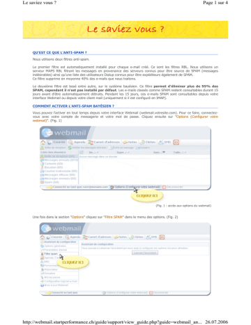 Le saviez vous ? Page 1 sur 4 QU'EST CE QUE L'ANTI-SPAM ? Nous utilisons deux filtres anti-spam. Le premier filtre est automatiquement installé pour chaque e-mail créé. Ce sont les filtres RBL. Nous utilisons un serveur MAPS RBL filtrant les messages en provenance des serveurs connus pour être source de SPAM (messages indésirables) ainsi qu'une liste des utilisateurs Dialup connus pour être expéditeurs également de SPAM. Ce filtre supprime en moyenne 40% des e-mails que nous traitons. Le deuxième filtre est basé entre autre, sur le système bayésien. Ce filtre permet d'éliminer plus de 95% des SPAM, cependant il n'est pas installé par défaut. Les e-mails classés comme SPAM restent consultables durant 15 jours avant d'être automatiquement détruits. Pendant les 15 jours, ces e-mails SPAM sont consultables depuis votre interface Webmail ou depuis votre client mail (uniquement si il est configuré en IMAP). COMMENT ACTIVER L'ANTI-SPAM BAYÉSIEN ? Vous pouvez l'activer en tout temps depuis votre interface Webmail (webmail.votresite.com). Pour ce faire, connectezvous avec votre compte de messagerie et votre mot de passe. Cliquez ensuite sur "Options (Configurer votre webmail)". (Fig. 1) (Fig. 1 : accès aux options du webmail) Une fois dans la section "Options" cliquez sur "Filtre SPAM" dans le menu des options. (Fig. 2) http://webmail.startperformance.ch/guide/support/view_guide.php?guide=webmail_an... 26.07.2006 Le saviez vous ? Page 2 sur 4 (Fig. 2 : Menu Options > Filtre Spam) Il ne vous reste plus qu'à activer votre filtre. (Fig. 3 + tableau explicatif) (Fig. 3 : Activation et options filtre SPAM) Activer le filtre anti-spam Cochez la première case pour activer votre filtre anti-spam. Ce filtre détecte les courriers indésirables, ajoute un entête à vos messages (x-Infomaniak-Spam avec la valeur "ham", "unsure" ou "spam", et les déplace dans le dossier "Spam" si besoin. Ne pas déplacer automatiquement les messages spam Vous pouvez choisir de ne pas déplacer automatiquement les courriers spam dans le dossier "Spam", pour ce faire il vous suffit de cocher la deuxième case "Ne pas déplacer automatiquement les message de spam..". Si vous cochez cette option, les messages considérés comme des SPAM resterons dans votre boite de messagerie. QU'EST CE QUE LA WHITELIST ? La "whitelist" se gère depuis votre Webmail. Elle sert à définir toutes les adresses électroniques qui ne doivent pas être interceptées par notre filtre antispam (vos correspondants réguliers en somme). Tous les courriers provenant des adresses e-mails inscrites dans cette liste vous serons délivrés dans tout les cas. En effet il peut arriver que notre moteur anti-spam considère un "bon e-mail" comme SPAM (par exemple un e-mail publicitaire ou une inscription à une mailing liste). COMMENT SIGNALER QU'UN E-MAIL N'EST PAS DU SPAM ? Vous pouvez effectuer cette action de deux manières différentes. La première est d'inscrire les adresses e-mails de vos correspondants importants dans votre Whitelist. Cette action vous garantira que tous les courriers provenant d'adresses inscrites dans la Whitelist ne seront plus traités par notre moteur anti-spam. Pour ce faire, connectez-vous à votre interface Webmail avec votre compte de messagerie et votre mot de passe. Cliquez ensuite sur le bouton "Options (Configurer votre webmail)" (Fig. 4) http://webmail.startperformance.ch/guide/support/view_guide.php?guide=webmail_an... 26.07.2006 Le saviez vous ? Page 3 sur 4 (Fig. 4 : accès aux options du webmail) Une fois dans la section "Options" cliquez sur "Filtre SPAM" dans le menu des options. (Fig. 5) (Fig. 5 : Menu Options > Filtre Spam) Puis cliquez sur "Gestion de la Whitelist". (Fig. 5 : Menu Options > Filtre Spam) La seconde est de vous rendre dans votre dossier "SPAM". (Fig. 6) Si vous découvrez un bon e-mail classé par erreur comme SPAM, cochez le et cliquez sur le bouton "Ce n'est pas du http://webmail.startperformance.ch/guide/support/view_guide.php?guide=webmail_an... 26.07.2006 Le saviez vous ? Page 4 sur 4 SPAM". L'adresse e-mail de l'expéditeur sera automatiquement ajoutée à la Whiteliste. (Fig. 6 : Dossier SPAM) JE N'AI PAS REÇU UN E-MAIL, A-T-IL PU ÊTRE CLASSÉ COMME SPAM ? Si vous attendez un e-mail et que l'expéditeur n'as pas reçu de message d'erreur, il se peut que notre moteur antispam l'ai classé comme spam. Pour que cela n'arrive plus vous avez deux solutions, soit vous inscrivez l'adresse de l'expéditeur bloqué dans votre whitelist, soit vous désactivez votre filtre anti-spam. COMMENT DESACTIVER LE FILTRE ANTI-SPAM ? Vous pouvez le désactiver en tout temps depuis votre interface Webmail (webmail.votresite.com). Pour ce faire, connectez-vous avec votre compte de messagerie et votre mot de passe. Cliquez ensuite sur "Options (Configurer votre webmail)" puis sur "Filtre SPAM". Décochez ensuite la case "Activer le filtre spam" puis cliquez sur le bouton "Valider" pour enregistrer les modifications. (Fig. 7) (Fig. 7 : Desactivation du filtre spam) http://webmail.startperformance.ch/guide/support/view_guide.php?guide=webmail_an... 26.07.2006