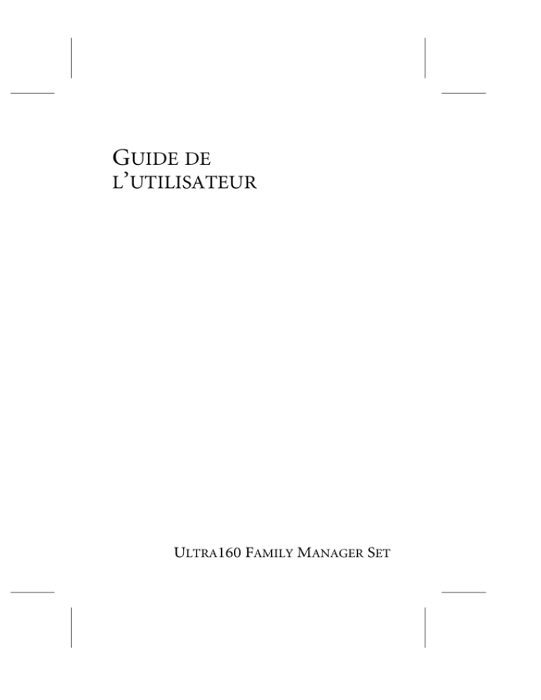 GUIDE DE L’UTILISATEUR ULTRA160 FAMILY MANAGER SET R Adaptec, Inc. 691 South Milpitas Boulevard Milpitas, CA 95035 ¨%HETXIG-RG 8SYWHVSMXWVÄWIVZÄW%HETXIGIXPIPSKS%HETXIG WSRXHIWQEVUYIWH %HETXIG-RGUYMTIYZIRXÃXVI HÄTSWÄIWHERWGIVXEMRIWNYVMHMGXMSRW 4VMRXIHMR7MRKETSVI 783'/23*66IZ& 03' ▼ ▼ ▼ ▼ Ultra160 Family Manager Set pour Windows NT, Windows 95/98, Novell NetWare et SCO UnixWare Guide de l’utilisateur R Copyright © 1999 Adaptec, Inc. Tous droits réservés. Aucune partie de cette publication ne peut être reproduite, stockée dans un système documentaire ou transmise sous quelque forme et par quelque moyen que ce soit (électronique, mécanique, photocopie, enregistrement ou autre), sans l’autorisation écrite préalable d’Adaptec, Inc., 691 South Milpitas Blvd., Milpitas, CA 95035. Marques Adaptec, le logo Adaptec, AHA, AIC, EZ-SCSI et SCSISelect sont des marques d’Adaptec, Inc., qui peuvent être déposées dans certaines juridictions. Windows, Windows 95/98 et Windows NT sont des marques déposées de Microsoft Corporation aux États-Unis et dans d’autres pays, utilisées sous licence. Toutes les autres marques appartiennent à leurs propriétaires respectifs. Modifications Les informations contenues dans ce document sont données pour information seulement, et sous réserve de modification sans préavis. Lors de la préparation de ce document, Adaptec, Inc. a mis en œuvre des efforts raisonnables pour en assurer l’exactitude ; toutefois, Adaptec, Inc. décline toute responsabilité pour les erreurs ou omissions que pourrait présenter ce document, de même que pour l’usage des informations qu’il contient. Adaptec se réserve le droit de modifier la conception du produit, sans restriction et sans en informer les utilisateurs au préalable. ii ▼ ▼ ▼ ▼ 1 Table des matières Introduction Pilotes de périphériques 1-2 Adaptateurs hôtes de la gamme Adaptec Ultra160 Family 1-2 Configuration requise 1-3 2 Installation sous Microsoft Windows NT Installation simultanée du pilote et de Windows NT 2-2 Nouvelle installation de Windows NT 4.0 à partir des disquettes 2-2 Nouvelle installation de Windows NT 4.0 à partir du CD-ROM 2-3 Installation du pilote après l’installation de Windows NT 2-4 Mise à jour de Windows NT 4.0 2-4 Paramètres de configuration avancée 2-5 Utilisation des paramètres SCSI de Windows NT 2-5 Utilisation de paramètres spécifiques aux pilotes 2-7 Utilisation de Windows NT et de l’adaptateur hôte 2-11 Suppression d’un adaptateur 2-11 Remplacement d’un adaptateur 2-12 Dépannage 2-14 Problèmes et solutions 2-14 Messages d’erreur 2-15 iii Ultra160 Family Manager Set – Guide de l’utilisateur 3 Installation sous Microsoft Windows 95/98 Pilotes DOS pour l’accès au CD-ROM 3-2 Installez les pilotes de CD-ROM sur un disque dur amorçable sous DOS 3-2 Mise à jour des disquettes d’installation de Windows 95 ou 98 3-3 Installation simultanée du pilote et du système d’exploitation Windows 95/98 3-4 Installation simultanée du pilote et de Windows 95 3-4 Installation simultanée du pilote et de Windows 98 3-5 Installation du pilote après l’installation de Windows 95/98 3-6 Mise à jour du pilote pour Windows 95 3-8 Dépannage 3-9 Problèmes et solutions 3-9 4 Installation sous Novell NetWare Installation simultanée du pilote et de NetWare 4-2 NetWare 3.12/3.2 4-2 NetWare 4.12/4.2 4-5 NetWare 5.0 4-6 Installation du pilote après l’installation de NetWare 4-7 Chargement du pilote lors du démarrage du serveur 4-8 Utilisation des options de la ligne de commande Load 4-9 Options de la ligne de commande du pilote adpt160m.ham 4-9 Options de masquage binaire 4-12 Exemples de commandes Load 4-12 iv Table des matières Utilisation de NetWare et de l’adaptateur hôte 4-13 Utilisation de supports amovibles 4-13 Utilitaire de sauvegarde sur bande de NetWare 4-15 Utilisation d’un lecteur de CD-ROM avec NetWare 4-16 Optimisation des performances 4-17 Dépannage 4-18 Messages d’erreur 4-18 5 Installation sous UnixWare Installation simultanée du pilote et d’UnixWare 5-2 Installation du pilote après l’installation d’UnixWare 5-4 Sauvegarde du système 5-5 Chargement du pilote 5-5 Modification du nouveau fichier système 5-6 Reconstruction du noyau d’UnixWare 5-7 Initialisation du nouveau noyau 5-7 Utilisation d’UnixWare et de l’adaptateur hôte 5-8 Utilisation des paramètres réglables 5-8 Utilisation de plusieurs adaptateurs 5-8 Suppression du pilote 5-9 Dépannage 5-10 Problèmes et solutions 5-10 Messages d’erreur 5-11 Index ❒ v ▼ ▼ ▼ ▼ 1 Introduction Adaptec® Ultra160 Family Manager Set regroupe des pilotes et des fichiers qui permettent aux adaptateurs hôtes de la gamme Adaptec Ultra160 Family de communiquer avec votre ordinateur. Adaptec Ultra160 Family Manager Set comprend des pilotes pour les systèmes d’exploitation suivants : ■ Microsoft Windows NT® ■ Microsoft Windows® 95/98 ■ Novell NetWare ■ SCO UnixWare Ce chapitre présente la liste des adaptateurs hôtes et des pilotes de périphériques formant la gamme Adaptec Ultra160 Family et décrit la configuration minimale requise pour installer le logiciel. Les autres chapitres de cette documentation fournissent, pour chaque système d’exploitation, les instructions nécessaires pour installer le pilote au cours de l’installation du système d’exploitation. Si le système d’exploitation est déjà installé, vous y trouverez également les procédures de mise à jour et d’installation du pilote. En cas de problème lors de l’installation ou de l’utilisation du pilote, reportez-vous à la section Dépannage qui se trouve à la fin de chaque chapitre. 1-1 Ultra160 Family Manager Set – Guide de l’utilisateur Pilotes de périphériques Ultra160 Family Manager Set comporte un fichier de pilote pour chaque système d’exploitation. Consultez la liste ci-après pour déterminer le pilote qui correspond à v
