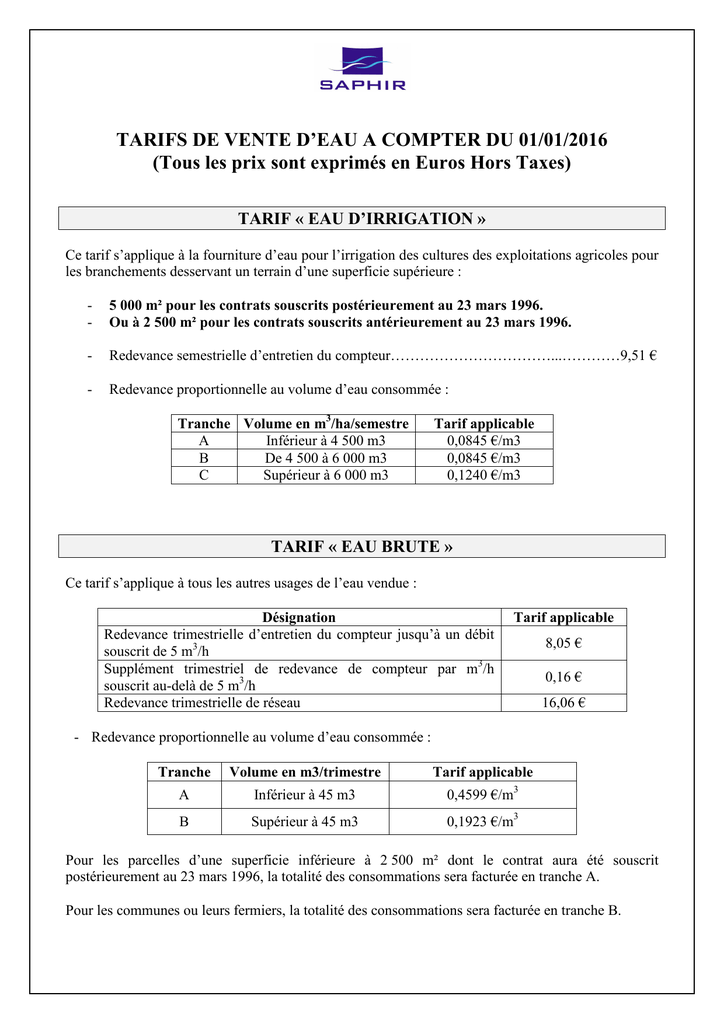TARIFS DE VENTE D’EAU A COMPTER DU 01/01/2016 (Tous les prix sont exprimés en Euros Hors Taxes) TARIF « EAU D’IRRIGATION » Ce tarif s’applique à la fourniture d’eau pour l’irrigation des cultures des exploitations agricoles pour les branchements desservant un terrain d’une superficie supérieure : - 5 000 m² pour les contrats souscrits postérieurement au 23 mars 1996. Ou à 2 500 m² pour les contrats souscrits antérieurement au 23 mars 1996. - Redevance semestrielle d’entretien du compteur……………………………...…………9,51 € - Redevance proportionnelle au volume d’eau consommée : Tranche Volume en m3/ha/semestre A Inférieur à 4 500 m3 B De 4 500 à 6 000 m3 C Supérieur à 6 000 m3 Tarif applicable 0,0845 €/m3 0,0845 €/m3 0,1240 €/m3 TARIF « EAU BRUTE » Ce tarif s’applique à tous les autres usages de l’eau vendue : Désignation Redevance trimestrielle d’entretien du compteur jusqu’à un débit souscrit de 5 m3/h Supplément trimestriel de redevance de compteur par m3/h souscrit au-delà de 5 m3/h Redevance trimestrielle de réseau Tarif applicable 8,05 € 0,16 € 16,06 € - Redevance proportionnelle au volume d’eau consommée : Tranche Volume en m3/trimestre Tarif applicable A Inférieur à 45 m3 0,4599 €/m3 B Supérieur à 45 m3 0,1923 €/m3 Pour les parcelles d’une superficie inférieure à 2 500 m² dont le contrat aura été souscrit postérieurement au 23 mars 1996, la totalité des consommations sera facturée en tranche A. Pour les communes ou leurs fermiers, la totalité des consommations sera facturée en tranche B. TARIFS DE PRESTATIONS A COMPTER DU 01/01/2016 (Tous les prix sont exprimés en Euros Hors Taxes) Code 9006 9007 9010 9012 9026 9027 9028 9041 9053 9054 9057 9062 9003BC 9003BP 9012BCZ1 9012BCZ2 9012BCZ3 9012BCZ4 9012BCZ5 9012BCZ6 9012BPZ1 9012BPZ2 9012BPZ3 9012BPZ4 9012BPZ5 9012BPZ6 9012BPZ7 9012BPZ8 9050BCZ1 9050BCZ2 9050BCZ3 9050BCZ4 9050BCZ5 9050BCZ6 9050BPZ1 9050BPZ2 9050BPZ3 9050BPZ4 9050BPZ5 9050BPZ6 9050BPZ7 9050BPZ8 9050HP Désignation Main d'œuvre ouvrier qualifié Main d'œuvre ouvrier Main d'œuvre technicien Etude et repérage branchement HP Frais de Repose Cpt / Tubulure Frais de repose Cpt en Ligne Frais de vérification compteur Certificat d'économie d'énergie Transfert tracto-pelle Heure de tracto-pelle sur site Location trancheuse de sol Frais de mise en demeure Redevance de branchement BC Redevance de branchement BP Etude et repérage branchement BC Z1 Etude et repérage branchement BC Z2 Etude et repérage branchement BC Z3 Etude et repérage branchement BC Z4 Etude et repérage branchement BC Z5 Etude et repérage branchement BC Z6 Etude et repérage branchement BP Z1 Etude et repérage branchement BP Z2 Etude et repérage branchement BP Z3 Etude et repérage branchement BP Z4 Etude et repérage branchement BP Z5 Etude et repérage branchement BP Z6 Etude et repérage branchement BP Z7 Etude et repérage branchement BP Z8 Forfait Déplacement VL et fourgonnette BC Z1 Forfait Déplacement VL et fourgonnette BC Z2 Forfait Déplacement VL et fourgonnette BC Z3 Forfait Déplacement VL et fourgonnette BC Z4 Forfait Déplacement VL et fourgonnette BC Z5 Forfait Déplacement VL et fourgonnette BC Z6 Forfait Déplacement VL et fourgonnette BP Z1 Forfait Déplacement VL et fourgonnette BP Z2 Forfait Déplacement VL et fourgonnette BP Z3 Forfait Déplacement VL et fourgonnette BP Z4 Forfait Déplacement VL et fourgonnette BP Z5 Forfait Déplacement VL et fourgonnette BP Z6 Forfait Déplacement VL et fourgonnette BP Z7 Forfait Déplacement VL et fourgonnette BP Z8 Forfait Déplacement VL et fourgonnette HP Famille PRMO PRMO PRMO PRMO PRDV PRDV PRDV PRDV PRDP PRDP PRDP PRDV PRDV PRDV PRMO PRMO PRMO PRMO PRMO PRMO PRMO PRMO PRMO PRMO PRMO PRMO PRMO PRMO PRDP PRDP PRDP PRDP PRDP PRDP PRDP PRDP PRDP PRDP PRDP PRDP PRDP PRDP PRDP Tarif 2016 HT 44,27 € 36,18 € 48,24 € 142,60 € 123,75 € 82,50 € 126,38 € selon convention 49,36 € 49,36 € 219,38 € 10,71 € 21,34 € 21,08 € 75,69 € 88,85 € 81,17 € 96,53 € 109,69 € 122,85 € 62,52 € 83,37 € 57,04 € 57,04 € 70,20 € 83,37 € 96,53 € 70,20 € 31,81 € 44,97 € 37,30 € 52,65 € 65,82 € 78,98 € 18,65 € 39,49 € 13,16 € 13,16 € 26,33 € 39,49 € 52,65 € 26,33 € 98,72 €