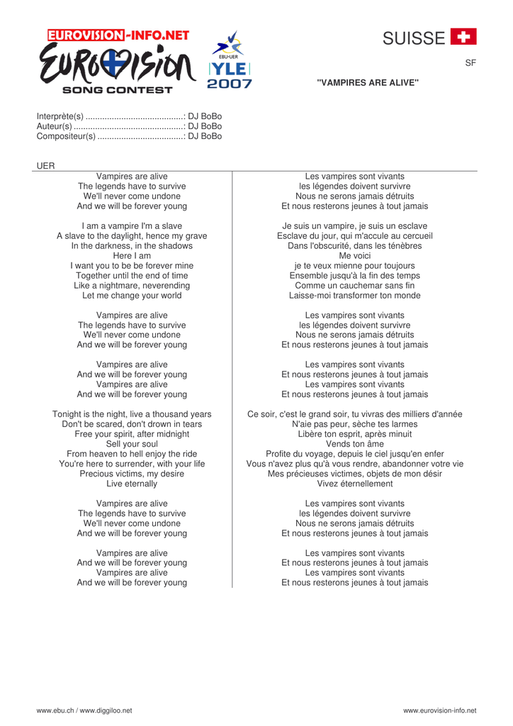SUISSE SF "VAMPIRES ARE ALIVE" Interprète(s) .........................................: DJ BoBo Auteur(s) ..............................................: DJ BoBo Compositeur(s) ....................................: DJ BoBo UER Vampires are alive The legends have to survive We'll never come undone And we will be forever young Les vampires sont vivants les légendes doivent survivre Nous ne serons jamais détruits Et nous resterons jeunes à tout jamais I am a vampire I'm a slave A slave to the daylight, hence my grave In the darkness, in the shadows Here I am I want you to be be forever mine Together until the end of time Like a nightmare, neverending Let me change your world Je suis un vampire, je suis un esclave Esclave du jour, qui m'accule au cercueil Dans l'obscurité, dans les ténèbres Me voici je te veux mienne pour toujours Ensemble jusqu'à la fin des temps Comme un cauchemar sans fin Laisse-moi transformer ton monde Vampires are alive The legends have to survive We'll never come undone And we will be forever young Les vampires sont vivants les légendes doivent survivre Nous ne serons jamais détruits Et nous resterons jeunes à tout jamais Vampires are alive And we will be forever young Vampires are alive And we will be forever young Les vampires sont vivants Et nous resterons jeunes à tout jamais Les vampires sont vivants Et nous resterons jeunes à tout jamais Tonight is the night, live a thousand years Don't be scared, don't drown in tears Free your spirit, after midnight Sell your soul From heaven to hell enjoy the ride You're here to surrender, with your life Precious victims, my desire Live eternally Ce soir, c'est le grand soir, tu vivras des milliers d'année N'aie pas peur, sèche tes larmes Libère ton esprit, après minuit Vends ton âme Profite du voyage, depuis le ciel jusqu'en enfer Vous n'avez plus qu'à vous rendre, abandonner votre vie Mes précieuses victimes, objets de mon désir Vivez éternellement Vampires are alive The legends have to survive We'll never come undone And we will be forever young Les vampires sont vivants les légendes doivent survivre Nous ne serons jamais détruits Et nous resterons jeunes à tout jamais Vampires are alive And we will be forever young Vampires are alive And we will be forever young Les vampires sont vivants Et nous resterons jeunes à tout jamais Les vampires sont vivants Et nous resterons jeunes à tout jamais www.ebu.ch / www.diggiloo.net www.eurovision-info.net DIGGILOO.NET Vampires are alive Vampires are alive The legends have to survive We'll never come undone And we will be forever young Vampires get alive I am a vampire, I'm a slave I sleep through the daylight, hence my grave In the darkness, in the shadows – here I am (Here I am) I want you to be forever mine Together until the end of time Like a nightmare never ending Let me change your world Vampires are alive The legends have to survive We'll never come undone And we will be forever young Vampires are alive (And we will be forever young) Vampires, vampires are alive (And we will be forever young) Tonight is the night, live a thousand years Don't be scared, don't drown in tears Free your spirit after midnight, sell your soul (Let it go) From heaven to hell, enjoy the ride You're here to surrender with your life Precious victims, my desire, live eternally Vampires are alive The legends have to survive We'll never come undone And we will be forever young Vampires are alive (And we will be forever young) Vampires, vampires are alive (And we will be forever young) (Vampires) are alive Vampires are alive (Vampires) www.ebu.ch / www.diggiloo.net www.eurovision-info.net