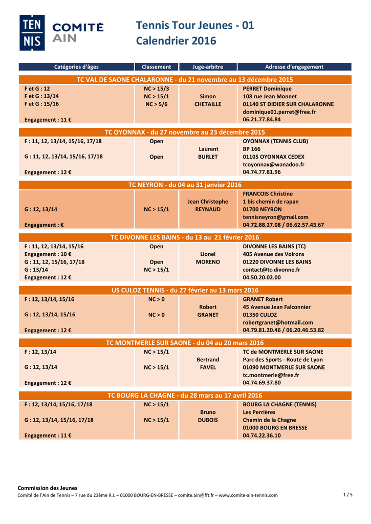 Tennis Tour Jeunes - 01 Calendrier 2016 foncé Catégories d’âges Classement Juge-arbitre Adresse d’engagement TC VAL DE SAONE CHALARONNE - du 21 novembre au 13 décembre 2015 F et G : 12 F et G : 13/14 F et G : 15/16 NC > 15/3 NC > 15/1 NC > 5/6 Simon CHETAILLE Engagement : 11 € clair PERRET Dominique 108 rue Jean Monnet 01140 ST DIDIER SUR CHALARONNE [email protected] 06.21.77.84.84 TC OYONNAX - du 27 novembre au 23 décembre 2015 F : 11, 12, 13/14, 15/16, 17/18 G : 11, 12, 13/14, 15/16, 17/18 Open Open Laurent BURLET Engagement : 12 € foncé OYONNAX (TENNIS CLUB) BP 166 01105 OYONNAX CEDEX [email protected] 04.74.77.81.96 TC NEYRON - du 04 au 31 janvier 2016 G : 12, 13/14 NC > 15/1 Jean Christophe REYNAUD Engagement : € clair FRANCOIS Christine 1 bis chemin de rapan 01700 NEYRON [email protected] 04.72.88.27.08 / 06.62.57.43.67 TC DIVONNE LES BAINS - du 13 au 21 février 2016 F : 11, 12, 13/14, 15/16 Engagement : 10 € G : 11, 12, 15/16, 17/18 G : 13/14 Engagement : 12 € Open Open NC > 15/1 Lionel MORENO foncé DIVONNE LES BAINS (TC) 405 Avenue des Voirons 01220 DIVONNE LES BAINS [email protected] 04.50.20.02.00 US CULOZ TENNIS - du 27 février au 13 mars 2016 F : 12, 13/14, 15/16 NC > 0 G : 12, 13/14, 15/16 NC > 0 Robert GRANET Engagement : 12 € clair GRANET Robert 45 Avenue Jean Falconnier 01350 CULOZ [email protected] 04.79.81.20.46 / 06.20.46.53.82 TC MONTMERLE SUR SAONE - du 04 au 20 mars 2016 F : 12, 13/14 G : 12, 13/14 NC > 15/1 NC > 15/1 Bertrand FAVEL Engagement : 12 € foncé TC de MONTMERLE SUR SAONE Parc des Sports - Route de Lyon 01090 MONTMERLE SUR SAONE [email protected] 04.74.69.37.80 TC BOURG LA CHAGNE - du 28 mars au 17 avril 2016 F : 12, 13/14, 15/16, 17/18 G : 12, 13/14, 15/16, 17/18 Engagement : 11 € NC > 15/1 NC > 15/1 Bruno DUBOIS BOURG LA CHAGNE (TENNIS) Les Perrières Chemin de la Chagne 01000 BOURG EN BRESSE 04.74.22.36.10 Commission des Jeunes Comité de l’Ain de Tennis – 7 rue du 23ème R.I. – 01000 BOURG-EN-BRESSE – [email protected] – www.comite-ain-tennis.com 1/5 Tennis Tour Jeunes - 01 Calendrier 2016 foncé Catégories d’âges clair Classement Juge-arbitre Adresse d’engagement TC VAL DE SAONE CHALARONNE - du 21 novembre au 13 décembre 2015 TC BELLEGARDE - du 30 mars au 10 avril 2016 F : 12, 13/14, 15/16 NC > 15/1 G : 12, 13/14, 15/16 NC > 15/1 Patrick BEAU Engagement : 12 € foncé RAISIN Daniel 2 chemin de la Fontaine Longeray 01200 Léaz [email protected] 04.50.59.61.55 / 06.29.52.63.00 TC VEYLE SAONE - du 09 au 23 avril 2016 F : 11, 12 13/14, 15/16, 17/18 G : 11, 12 13/14, 15/16, 17/18 NC > 15/1 NC > 15/1 Arnaud CLERE Engagement : 12 € clair BERNY Martine 39 Rue Villa Croteldi 01290 CROTTET [email protected] 06.88.32.78.20 TC FAREINS - du 09 au 24 avril 2016 F : 11, 12, 13/14 G : 11, 12, 13/14 F : 15/16, 17/18 G : 15/16, 17/18 Engagement : 13 € NC > 15/1 NC > 5/6 Patrick SPICA foncé TC FAREINS Espace Farinois - Place de la Bascule 01480 FAREINS [email protected] 06.08.12.34.68 AS PERONNAS TENNIS - du 15 au 24 avril 2016 F : 12, 13/14, 15/16 G : 12, 13/14, 15/16 NC > 15/1 NC > 15/1 Cécile MOREL Engagement : 13 € clair PERONNAS TENNIS (AS) Zone de Loisirs-Allée Grange Magnien 01960 PERONNAS [email protected] 04.74.21.05.56 TC SAINT MAURICE de GOURDANS - du 25 mai au 12 juin 2016 G : 12, 13/14 NC > 15/1 Jean Christophe REYNAUD TC St Maurice de Gourdans Clos Gindre 01800 St Maurice de Gourdans [email protected] Engagement : 13 € 07 82 26 05 71 TC AMBARROIS - du 25 mai au 12 juin 2016 F : 11, 12, 13/14, 15/16 NC > 15/1 G: 11, 12, 13/14, 15/16 NC > 15/1 Françoise RENOUD Françoise RENOUD 137 route du mollard 01370 MEILLONNAS franç[email protected] 04.74.42.32.94 / 06.87.89.73.34 Engagement : 11 € TC SAINT REMY - du 30 mai au 12 juin 2016 F : 13/14 NC > 15/1 G : 13/14 NC > 15/1 Engagement : 10 € foncé Laurent MARILLER GONNOT Fabrice 145b Chemin du Poyet 01310 SAINT REMY [email protected] 09.54.29.17.38 / 06.17.99.31.78 Commission des Jeunes Comité de l’Ain de Tennis – 7 rue du 23ème R.I. – 01000 BOURG-EN-BRESSE – [email protected] – www.comite-ain-tennis.com 2/5 Tennis Tour Jeunes - 01 Calendrier 2016 foncé Catégories d’âges Classement Juge-arbitre Adresse d’engagement TC VAL DE SAONE CHALARONNE - du0421aunovembre au 13 décembre 2015 TC VONNAS - du 19 juin 2016 F : 11, 12, 13/14, 15/16 G : 11, 12, 13/14, 15/16 NC > 15/1 NC > 15/1 Serge DUMARAIS Engagement : 11 € clair JEROME Sandra 40 ALLEE DES PRIMEVERES 01540 VONNAS [email protected] 06.62.86.84.05 TC GEX - du 10 au 25 juin 2016 F : 12, 13/14, 15/16 G : 12, 13/14, 15/16 NC > 15/1 NC > 15/1 Thomas BENOIT JEANNIN Engagement : 12 € foncé TC GEX 161 Place Georges Charpak 01170 GEX [email protected] 04.50.41.43.20 / 06.86.08.16.58 RACING CLUB DE MONTLUEL - du 11 au 26 juin 2016 F : 11, 12, 13/14, 15/16 Open G : 11, 12, 13/14, 15/16 Open Jean Christophe REYNAUD Engagement : 12 € clair MONTLUEL (RACING CLUB DE) Route de Jailleux 01120 MONTLUEL [email protected] 04.78.06.09.74 TC VIRIAT - du 11 au 26 juin 2016 F : 11, 12, 13/14, 15/16 G : 11, 12, 13/14, 15/16 NC > 15/1 NC > 15/1 Christian GILLET Engagement : 12 € foncé DELIANCE Maurice 3 allée du Buidon 01440 VIRIAT [email protected] 04.74.22.48.75 / 06.40.19.56.16 AS MONTREAL LA CLUSE - du 11 au 26 juin 2016 F : 12, 13/14, 15/16 G : 12, 13/14, 15/16 NC > 15/1 NC > 15/1 Julien COMTE Engagement : 11 € clair COMTE Julien 7 Av François Prosper De Douglas 01460 MONTREAL LA CLUSE [email protected] 06.70.19.13.09 CHALAMONTENNIS - du 17 juin au 02 juillet 2016 F : 11, 12, 13/14, 15/16 G : 11, 12, 13/14, 15/16 NC > 15/1 NC > 15/1 Astrid DESGRANGES Engagement : 12 € foncé DESGRANGES Astrid La Gondonnière - Route notre Dame des Dombes - 01330 LE PLANTAY [email protected] 04.74.98.38.62 / 06.34.55.58.47 TC VILLARS LES DOMBES - du 26 juin au 10 juillet 2016 F : 13/14, 15/16 G: 12, 13/14, 15/16 Engagement : 13 € clair Open Open Justin LOPES TC VILLARS Avenue des nations 01330 VILLARS