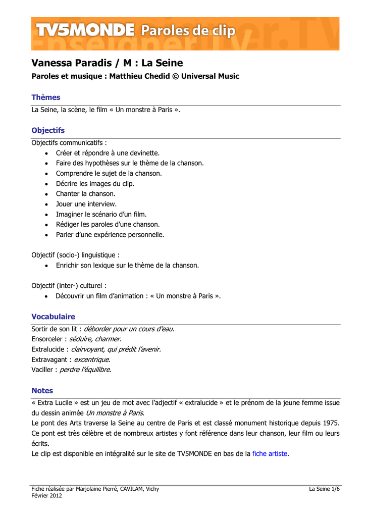 Vanessa Paradis / M : La Seine - Enseigner le français avec
