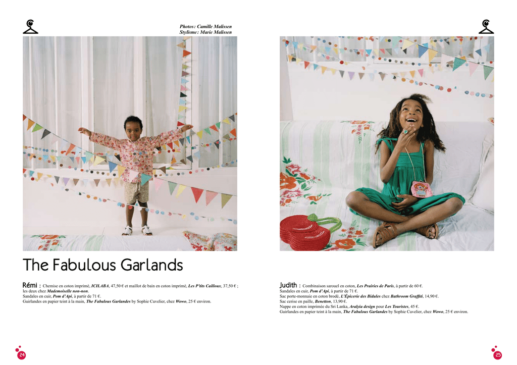 Photos : Camille Malissen Stylisme : Marie Malissen The Fabulous Garlands Rémi : Chemise en coton imprimé, ICILABA, 47,50 ! et maillot de bain en coton imprimé, Les P’tits Cailloux, 37,50 ! ; les deux chez Mademoiselle non-non. Sandales en cuir, Pom d’Api, à partir de 71 !. Guirlandes en papier teint à la main, The Fabulous Garlandes by Sophie Cuvelier, chez Wowo, 25 ! environ. ') ') Judith : Combinaison sarouel en coton, Les Prairies de Paris, à partir de 60 !. Sandales en cuir, Pom d’Api, à partir de 71 !. Sac porte-monnaie en coton brodé, L’Épicerie des Bidules chez Bathroom Graffiti, 14,90 !. Sac cerise en paille, Benetton, 13,90 !. Nappe en coton imprimée du Sri Lanka, Aralyia design pour Les Touristes, 45 !. Guirlandes en papier teint à la main, The Fabulous Garlandes by Sophie Cuvelier, chez Wowo, 25 ! environ. '* '* Joseph : Chemisette en coton imprimé, Pepe Jeans, 85 !. Bermuda en coton imprimé et tennis en toile de coton bicolore, Benetton, 29,90 et 32,90 !. Guirlandes en papier teint à la main, The Fabulous Garlandes by Sophie Cuvelier, chez Wowo, 25 ! environ. Rémi : T-shirt en coton imprimé, Bubble, 30 !. Maillot de bain en polyester, Ralph Lauren chez Calesta, 37 !. Maud : Robe en voile de coton brodé, Antik Batik, 76 !. Jupon en coton, Facteur Céleste, 12 !. Judith : Pull en maille de coton, Noro chez Calesta, 90 !. Jupe en coton imprimé, Caoutchouc, 56 !. Guirlandes en papier teint à la main, The Fabulous Garlandes by Sophie Cuvelier, chez Wowo, 25 ! environ. '+ '+ ', ', Judith : Imperméable en plastique imprimé, Catimini, 35 !. Robe à bretelles en coton, Bonton, 56 !. Bracelet papillons, Mademoiselle non-non, 10 !. Guirlandes en papier teint à la main, The Fabulous Garlandes by Sophie Cuvelier, chez Wowo, 25 ! environ. Maud : T-shirt en coton imprimé, Creeks, 14,99 !. Joseph : Tunique en voile de coton brodé, Antik Batik, 54 !. Guirlandes en papier teint à la main, The Fabulous Garlandes by Sophie Cuvelier, chez Wowo, 25 ! environ. ''- '. '.