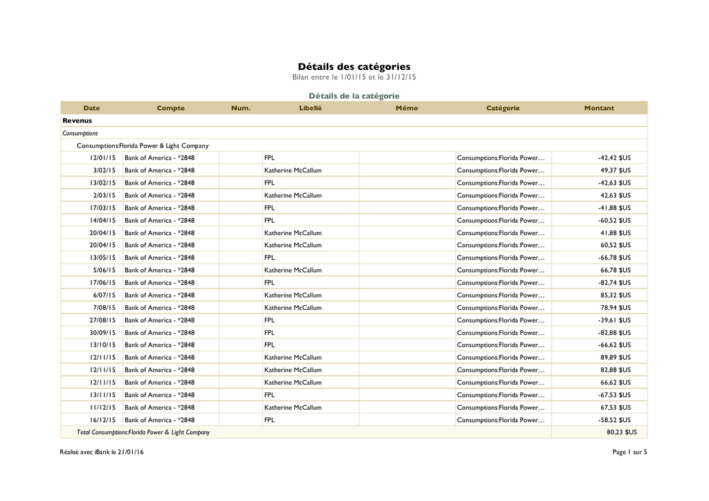 Détails des catégories Bilan entre le 1/01/15 et le 31/12/15 Détails de la catégorie Date Compte Num. Libellé Mémo Catégorie Montant Revenus Consumptions Consumptions:Florida Power & Light Company 12/01/15 Bank of America - *2848 FPL Consumptions:Florida Power… -42,42 $US 3/02/15 Bank of America - *2848 Katherine McCallum Consumptions:Florida Power… 49,37 $US 13/02/15 Bank of America - *2848 FPL Consumptions:Florida Power… -42,63 $US 2/03/15 Bank of America - *2848 Katherine McCallum Consumptions:Florida Power… 42,63 $US 17/03/15 Bank of America - *2848 FPL Consumptions:Florida Power… -41,88 $US 14/04/15 Bank of America - *2848 FPL Consumptions:Florida Power… -60,52 $US 20/04/15 Bank of America - *2848 Katherine McCallum Consumptions:Florida Power… 41,88 $US 20/04/15 Bank of America - *2848 Katherine McCallum Consumptions:Florida Power… 60,52 $US 13/05/15 Bank of America - *2848 FPL Consumptions:Florida Power… -66,78 $US 5/06/15 Bank of America - *2848 Katherine McCallum Consumptions:Florida Power… 66,78 $US 17/06/15 Bank of America - *2848 FPL Consumptions:Florida Power… -82,74 $US 6/07/15 Bank of America - *2848 Katherine McCallum Consumptions:Florida Power… 85,32 $US 7/08/15 Bank of America - *2848 Katherine McCallum Consumptions:Florida Power… 78,94 $US 27/08/15 Bank of America - *2848 FPL Consumptions:Florida Power… -39,61 $US 30/09/15 Bank of America - *2848 FPL Consumptions:Florida Power… -82,88 $US 13/10/15 Bank of America - *2848 FPL Consumptions:Florida Power… -66,62 $US 12/11/15 Bank of America - *2848 Katherine McCallum Consumptions:Florida Power… 89,89 $US 12/11/15 Bank of America - *2848 Katherine McCallum Consumptions:Florida Power… 82,88 $US 12/11/15 Bank of America - *2848 Katherine McCallum Consumptions:Florida Power… 66,62 $US 13/11/15 Bank of America - *2848 FPL Consumptions:Florida Power… -67,53 $US 11/12/15 Bank of America - *2848 Katherine McCallum Consumptions:Florida Power… 67,53 $US 16/12/15 Bank of America - *2848 FPL Consumptions:Florida Power… -58,52 $US Total Consumptions:Florida Power & Light Company Réalisé avec iBank le 21/01/16 80,23 $US Page 1 sur 5 Détails de la catégorie (Continu) Date Compte Num. Libellé Mémo Catégorie Montant Consumptions:Teco People Gas 8/01/15 Bank of America - *2848 Teco Consumptions:Teco People Gas -14,05 $US 3/02/15 Bank of America - *2848 Katherine McCallum Consumptions:Teco People Gas 15,49 $US 3/02/15 Bank of America - *2848 Katherine McCallum Consumptions:Teco People Gas 14,05 $US 6/02/15 Bank of America - *2848 Teco Consumptions:Teco People Gas -14,05 $US 27/02/15 Bank of America - *2848 Teco Consumptions:Teco People Gas -15,42 $US 2/03/15 Bank of America - *2848 Katherine McCallum Consumptions:Teco People Gas 15,42 $US 14/04/15 Bank of America - *2848 Teco Consumptions:Teco People Gas -14,05 $US 20/04/15 Bank of America - *2848 Katherine McCallum Consumptions:Teco People Gas 14,05 $US 20/04/15 Bank of America - *2848 Katherine McCallum Consumptions:Teco People Gas 15,42 $US 7/05/15 Bank of America - *2848 Teco Consumptions:Teco People Gas -15,42 $US 1/06/15 Bank of America - *2848 Teco Consumptions:Teco People Gas -14,05 $US 5/06/15 Bank of America - *2848 Katherine McCallum Consumptions:Teco People Gas 14,04 $US 9/07/15 Bank of America - *2848 Teco Consumptions:Teco People Gas -14,05 $US 30/07/15 Bank of America - *2848 Teco Consumptions:Teco People Gas -14,05 $US 7/08/15 Bank of America - *2848 Katherine McCallum Consumptions:Teco People Gas 14,05 $US 7/08/15 Bank of America - *2848 Katherine McCallum Consumptions:Teco People Gas 14,05 $US 9/09/15 Bank of America - *2848 Teco Consumptions:Teco People Gas -15,51 $US 30/09/15 Bank of America - *2848 Teco Consumptions:Teco People Gas -14,05 $US 10/11/15 Bank of America - *2848 Teco Consumptions:Teco People Gas -14,05 $US 12/11/15 Bank of America - *2848 Katherine McCallum Consumptions:Teco People Gas 15,51 $US 12/11/15 Bank of America - *2848 Katherine McCallum Consumptions:Teco People Gas 14,05 $US 12/11/15 Bank of America - *2848 Katherine McCallum Consumptions:Teco People Gas 14,05 $US 27/11/15 Bank of America - *2848 Teco Consumptions:Teco People Gas -14,05 $US 11/12/15 Bank of America - *2848 Katherine McCallum Consumptions:Teco People Gas 14,05 $US 30/12/15 Bank of America - *2848 Teco Consumptions:Teco People Gas -15,51 $US Total Consumptions:Teco People Gas Réalisé avec iBank le 21/01/16 -14,08 $US Page 2 sur 5 Détails de la catégorie (Continu) Date Compte Num. Libellé Mémo Catégorie Montant Consumptions - Autres 20/04/15 Bank of America - *2848 Katherine McCallum Error to be credited Consumptions 29,13 $US 5/06/15 Bank of America - *2848 Katherine McCallum Credit Consumptions -29,13 $US 12/11/15 Bank of America - *2848 Katherine McCallum balance Consumptions 0,01 $US 0,01 $US Total Consumptions - Autres 66,16 $US Total Consumptions Rentals Rentals:Rent 2/03/15 Bank of America - *2848 Katherine McCallum Rentals:Rent 1.600,00 $US 17/03/15 Bank of America - *2848 Beach Front Realty 1er loyer Rentals:Rent 1.600,00 $US 17/03/15 Bank of America - *2848 Beach Front Realty 6/04/15 Bank of America - *2848 Katherine McCallum Dernier loyer Rentals:Rent 1.600,00 $US Rentals:Rent 1.600,00 $US 1/05/15 Bank of America - *2848 Katherine McCallum Rentals:Rent 1.600,00 $US 5/06/15 6/07/15 Bank of America - *2848 Katherine McCallum Rentals:Rent 1.600,00 $US Bank of America - *2848 Katherine McCallum Rentals:Rent 1.600,00 $US 7/08/15 Bank of America - *2848 Katherine McCallum Rentals:Rent 1.600,00 $US 12/11/15 Bank of America - *2848 Katherine McCallum Rentals:Rent 1.600,00 $US 11/12/15 Bank of America - *2848 Katherine McCallum Rentals:Rent 1.600,00 $US 29/12/15 Bank of America - *2848 Katherine McCallum Rentals:Rent 1.600,00 $US 17.600,00 $US Total Rentals:Rent 17.600,00 $US Total Rentals Revenu total 17.666,16 $US Dépenses Bank Bank:Fees:Bank of America 9/03/15 Bank of America - *2848 Bank of America Bank:Fees:Bank 