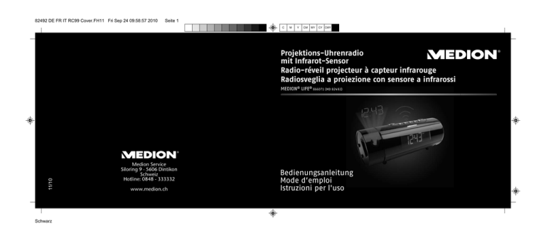 82492 DE FR IT RC99 Cover.FH11 Fri Sep 24 09:58:57 2010 Seite 1 C M Y CM MY CY CMY K Projektions-Uhrenradio mit Infrarot-Sensor Radio-réveil projecteur à capteur infrarouge Radiosveglia a proiezione con sensore a infrarossi 11/10 MEDION® LIFE® E66071 (MD 82492) Schwarz Medion Service Siloring 9 · 5606 Dintikon Schweiz Hotline: 0848 - 333332 www.medion.ch Bedienungsanleitung Mode demploi Istruzioni per l'uso Deutsch Français Italiano Diese Bedienungsanleitung richtet sich an folgende Personen: Personen, die dieses Gerät aufstellen, Personen, die dieses Gerät anschließen, Personen, die dieses Gerät bedienen, Personen, die dieses Gerät reinigen oder Personen, die dieses Gerät entsorgen. Jede dieser Personen muss den vollständigen Inhalt dieser Bedienungsanleitung zur Kenntnis genommen haben. 3 Diese Bedienungsanleitung hilft Ihnen beim bestimmungsgemäßen sicheren und vorteilhaften Gebrauch des Projektions-Uhrenradios, kurz Gerät genannt. Diese Bedienungsanleitung ist Bestandteil des Produkts. Bewahren Sie diese Bedienungsanleitung immer in der Nähe des Gerätes auf. Geben Sie die Bedienungsanleitung weiter, wenn Sie das Gerät verkaufen oder auf andere Art weitergeben. Vorwort Gestaltungsmerkmale Verschiedene Elemente der Bedienungsanleitung sind mit festgelegten Gestaltungsmerkmalen versehen. So können Sie leicht unterscheiden, ob es sich um normalen Text, Aufzählungen, Handlungsschritte, „DISPLAY-ANZEIGEN“ oder „Beschriftungen“ am Gerät handelt. 4 Diese Hinweise enthalten zusätzliche Informationen, wie zum Beispiel besondere Angaben zum wirtschaftlichen Gebrauch des Gerätes. Deutsch Français Italiano Anzeige einstellen .....................................24 Gerät bedienen ............................................25 Wecker verwenden....................................25 Datum anzeigen ........................................28 Uhrzeit projizieren .....................................28 Radio bedienen ...........................................29 Ein- und ausschalten .................................29 Lautstärke einstellen .................................29 Wellenbereich wählen ...............................30 Sender einstellen .......................................30 Einschlaf-Funktion (sleep) verwenden ......30 Werkseinstellungen wiederherstellen ......31 Infrarot-Sensor-Funktion ...........................32 Weckzeiten anzeigen ................................32 Einschlaf-Funktion (sleep) aktivieren ........33 Frequenz anzeigen....................................33 Wecksignal unterbrechen (snooze) ..........34 Display aktivieren ......................................34 Nach dem Benutzen ...................................34 Gerät ausschalten .....................................34 Gerät reinigen ............................................35 5 Inhaltsverzeichnis Sicherheit .......................................................7 Bestimmungsgemäßer Gebrauch ...............7 Grundlegende Sicherheitshinweise ............7 Gestaltungsmerkmale der Sicherheitshinweise .................................. 11 Beschreibung ............................................. 12 Lieferumfang............................................. 12 Geräteübersicht ........................................ 13 Bedienelemente der Oberseite ................ 14 Bedienelemente der Rückseite ................ 16 Bedienelemente der Unterseite................ 18 Bedienelemente der Projektionseinheit ... 19 Vor dem Benutzen ..................................... 20 Gerät aufstellen ........................................ 20 Speicherschutz-Batterie aktivieren .......... 20 Antenne positionieren............................... 20 Gerät anschließen .................................... 21 Gerät erstmals einschalten ...................... 22 Datum und Uhrzeit manuell einstellen ..... 22 Uhrzeit einer Zeitzone einstellen .............. 24 Speicherschutz-Batterie tauschen ............40 Gerät abbauen und lagern ....................... 36 Entsorgen ................................................. 36 Technische Daten .......................................42 Fehler suchen............................................. 38 6 Deutsch Elektrische Schläge vermeiden Verwenden Sie das Gerät nur in trockenen Räumen. Stellen Sie sicher, dass niemals Flüssigkeiten oder Gegenstände in das Gerät gelangen können. Prüfen Sie das Gerät und alle Teile auf sichtbare Schäden. Sie dürfen das Gerät nur in einwandfreiem Zustand benutzen. Schließen Sie das Gerät nur an eine fachgerecht installierte Netz-Steckdose mit 230 V~ 50 Hz an. Der Netzstecker muss frei zugänglich sein, damit Sie das Gerät im Notfall einfach und schnell vom Stromnetz trennen können. Français Grundlegende Sicherheitshinweise Italiano Das Projektions-Uhrenradio dient: zum Empfang von Radiosendern und Hören von Radioprogrammen, zum Wecken durch Alarmton oder Radiowiedergabe, zur Projektion der Uhrzeit auf eine Wand oder Decke. Das Gerät ist ausschließlich für diese Zwecke bestimmt und darf nur dafür verwendet werden. Es darf nur in der Art und Weise benutzt werden, wie es in dieser Bedienungsanleitung beschrieben ist. Jede andere Verwendung oder Veränderung des Gerätes gilt als nicht bestimmungsgemäß und kann zu Sachschäden führen. Der Hersteller haftet nicht für Schäden, die durch nicht bestimmungsgemäßen Gebrauch 7 Bestimmungsgemäßer Gebrauch oder falsche Bedienung verursacht werden. Das Gerät ist nicht für den gewerblichen Einsatz bestimmt. Sicherheit Ziehen Sie den Netzstecker bei Störungen aus der Steckdose, oder falls Sie das Gerät über einen längeren Zeitraum nicht benutzen. Ziehen Sie nur am Netzstecker. Vermeiden Sie, dass das Gerät Tropf- oder Spritzwasser ausgesetzt wird. Stellen Sie keine mit Flüssigkeiten gefüllten Gegenstände, wie z. B. Vasen, auf oder über das Gerät. Knicken oder quetschen Sie das Netzkabel nicht. Berühren Sie das Netzkabel nicht mit feuchten Händen. Stecken