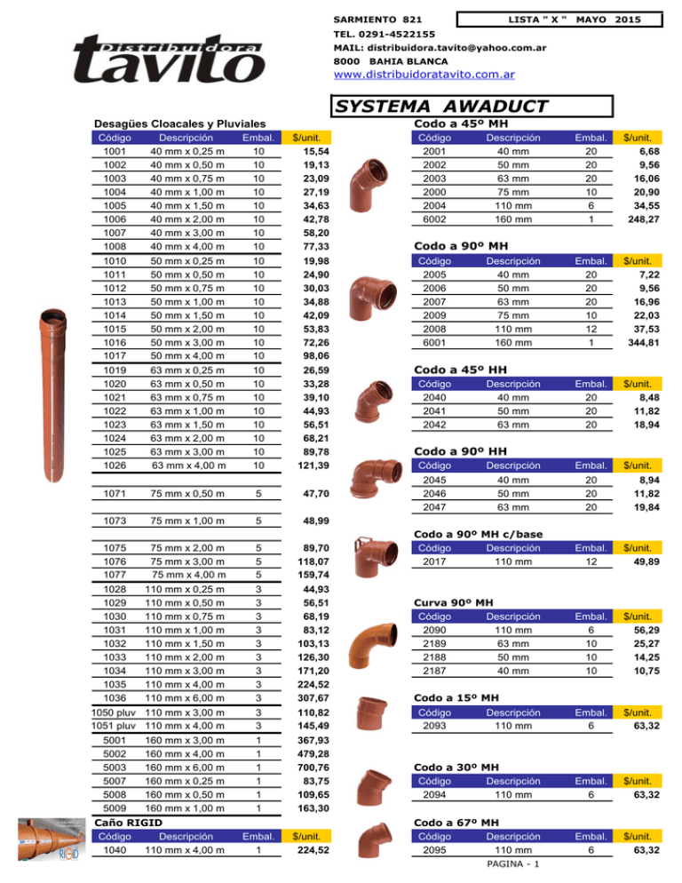 SARMIENTO 821 LISTA " X " MAYO 2015 TEL. 0291-4522155 MAIL: [email protected] 8000 BAHIA BLANCA www.distribuidoratavito.com.ar SYSTEMA AWADUCT Codo a 45º MH Desagües Cloacales y Pluviales Código 1001 1002 1003 1004 1005 1006 1007 1008 Descripción 40 mm x 0,25 m 40 mm x 0,50 m 40 mm x 0,75 m 40 mm x 1,00 m 40 mm x 1,50 m 40 mm x 2,00 m 40 mm x 3,00 m 40 mm x 4,00 m Embal. 10 10 10 10 10 10 10 10 1010 1011 1012 1013 1014 1015 1016 1017 50 mm x 0,25 m 50 mm x 0,50 m 50 mm x 0,75 m 50 mm x 1,00 m 50 mm x 1,50 m 50 mm x 2,00 m 50 mm x 3,00 m 50 mm x 4,00 m 10 10 10 10 10 10 10 10 19,98 24,90 30,03 34,88 42,09 53,83 72,26 98,06 1019 1020 1021 1022 1023 1024 1025 1026 63 mm x 0,25 m 63 mm x 0,50 m 63 mm x 0,75 m 63 mm x 1,00 m 63 mm x 1,50 m 63 mm x 2,00 m 63 mm x 3,00 m 63 mm x 4,00 m 10 10 10 10 10 10 10 10 26,59 33,28 39,10 44,93 56,51 68,21 89,78 121,39 1071 75 mm x 0,50 m 5 47,70 1073 75 mm x 1,00 m 5 48,99 1075 1076 1077 75 mm x 2,00 m 75 mm x 3,00 m 75 mm x 4,00 m 5 5 5 89,70 118,07 159,74 1028 1029 1030 1031 1032 1033 1034 1035 1036 110 mm x 0,25 m 110 mm x 0,50 m 110 mm x 0,75 m 110 mm x 1,00 m 110 mm x 1,50 m 110 mm x 2,00 m 110 mm x 3,00 m 110 mm x 4,00 m 110 mm x 6,00 m 3 3 3 3 3 3 3 3 3 44,93 56,51 68,19 83,12 103,13 126,30 171,20 224,52 307,67 1050 pluv. 110 mm x 3,00 m 1051 pluv. 110 mm x 4,00 m 3 3 110,82 145,49 1 1 1 1 1 1 367,93 479,28 700,76 83,75 109,65 163,30 5001 5002 5003 5007 5008 5009 160 mm x 3,00 m 160 mm x 4,00 m 160 mm x 6,00 m 160 mm x 0,25 m 160 mm x 0,50 m 160 mm x 1,00 m Caño RIGID Código Descripción 1040 110 mm x 4,00 m Embal. 1 $/unit. 15,54 19,13 23,09 27,19 34,63 42,78 58,20 77,33 $/unit. 224,52 Código 2001 2002 2003 2000 2004 6002 Descripción 40 mm 50 mm 63 mm 75 mm 110 mm 160 mm Embal. 20 20 20 10 6 1 $/unit. 6,68 9,56 16,06 20,90 34,55 248,27 Embal. 20 20 20 10 12 1 $/unit. 7,22 9,56 16,96 22,03 37,53 344,81 Embal. 20 20 20 $/unit. 8,48 11,82 18,94 $/unit. Codo a 90º MH Código 2005 2006 2007 2009 2008 6001 Descripción 40 mm 50 mm 63 mm 75 mm 110 mm 160 mm Codo a 45º HH Código 2040 2041 2042 Descripción 40 mm 50 mm 63 mm Codo a 90º HH Código Descripción Embal. 2045 2046 2047 40 mm 50 mm 63 mm 20 20 20 8,94 11,82 19,84 Codo a 90º MH c/base Código Descripción 2017 110 mm Embal. 12 $/unit. 49,89 Curva 90º MH Código Descripción 2090 110 mm 2189 63 mm 2188 50 mm 2187 40 mm Embal. 6 10 10 10 $/unit. 56,29 25,27 14,25 10,75 Descripción 110 mm Embal. 6 $/unit. 63,32 Codo a 30º MH Código Descripción 2094 110 mm Embal. 6 $/unit. 63,32 Codo a 67º MH Código Descripción 2095 110 mm Embal. 6 $/unit. 63,32 Codo a 15º MH Código 2093 PAGINA - 1 Conex. Hembra Compuesta(H-HC) Código Descripción Embal. $/unit. 2248(1) Codo a 90º 110 mm 6 44,91 2243(2) Codo a 45º 110 mm 6 41,41 2223(3) Ramal a 45º 110 mm 6 94,93 2224(3) Ramal a 45º 110x63 6 65,50 2216(4) Cupla 110 mm 6 39,40 Codo a 90º MH Reduccion Código Descripción Embal. 2073 40 x 32 10 $/unit. 10,05 Codo a 90º HH Corta Código Descripción 2074 40 mm Embal. 10 $/unit. 10,98 Codo a 90º H c/rosca M Código Descripción 2075 40 x 1 1/4 Embal. 10 $/unit. 12,64 Adaptador Válvula Inodoro M Código Descripción Embal. 2072 38 x 40 10 $/unit. 3,96 Manguito Reparación HH Código Descripción Embal. 2013 40 mm 20 2014 50 mm 20 2015 63 mm 20 2010 75 mm 10 2016 110 mm 10 6009 160 mm 4 6008 160 mm c/tope 4 $/unit. 11,01 12,09 16,06 22,36 35,73 193,15 193,15 Cupla Reducción MH Código Descripción 2028 50 x 40 mm 2029 63 x 50 mm 2032 110 x 63 mm 6011 160 x 110 mm Buje Reducción MH Código Descripción 2101 50 x 40 mm 2080 63 x 40 mm 2081 63 x 50 mm 2085 75 x 40 mm 2086 75 x 50 mm 2082 110 x 40 mm 2083 110 x 50 mm 2084 110 x 63 mm 2087 110 x 75 mm Ramal a 90º MH Código Descripción 2019 63 x 63 mm 2088 75 x 75 mm 2495 110 x 40 mm 2097 110 x 50 mm 2018 110 x 63 mm 2022 110 x 110 mm 6005 160 x 110 mm 6003 160 x 160 mm Embal. 20 20 10 1 $/unit. 10,38 11,91 29,32 218,42 Embal. 20 20 20 10 10 10 10 10 10 $/unit. 9,86 10,74 10,92 13,98 15,18 24,45 25,53 26,80 37,27 Embal. 20 10 5 5 5 5 1 1 $/unit. 35,63 47,69 45,75 49,87 49,89 63,16 270,29 397,32 Codo a 90º HH Poliangular Código Descripción Embal. 2100 H-H 40 mm 10 2103 M-H 40 mm 10 2105 H-H 50 mm 10 2107 M-H 50 mm 10 2112 H-H 63 mm 10 2113 M-H 63 mm 10 $/unit. 15,14 15,14 17,27 17,27 29,25 29,25 Ramal a 45º MH Código Descripción 2056 63 x 50 mm 2026 63 x 63 mm 2089 75 x 75 mm 2024 110 x 63 mm 2099 110 x 75 mm 2023 110 x 110 mm 6006 160 x 110 mm 6004 160 x 160 mm Embal. 20 20 10 5 5 5 1 1 $/unit. 43,30 37,45 52,12 56,20 157,73 79,12 242,78 369,71 Ramal a 45º HH Código Descripción 2057 40 x 40 mm 2058 50 x 50 mm 6015 160 x 110 mm Embal. 20 20 1 $/unit. 18,67 27,51 299,93 Ramal Invertido MH Código Descripción 2025 50 x 50 a 45º 3014 110 x 50 paral. Embal. 20 5 $/unit. 40,51 116,84 Ramal a 45º 160x110 abraz. Código Descripción Embal. 6007 160 x 110 mm 1 $/unit. 339,89 Ramal a 90º c/vent.50mm Código Descripción Embal. 2050 110 x 110 mm 2 2063 110 x 63 mm 2 $/unit. 100,42 129,74 Ramal Doble a 90º Código Descripción 3021 110 x 110 mm Embal. 2 $/unit. 262,53 Ramal Doble 90º c/vent.50 Código Descripción Embal. 2051 180º 110 x 110 (50) 2 2109 180º 110 x 110 (63) 2 3050 esq.izq. 110 x 110 2 3051 esq.der. 110 x 110 2 3052 135º izq. 110 x 110 2 3053 135º der. 110 x 110 2 $/unit. 353,66 353,66 353,66 353,66 427,93 427,93 Ramal Doble 90º c/vent.50 Código Descripción Embal. 2049 110 x 63 mm 2 $/unit. 353,67 PAGINA - 2 Ramal a 90º HH Código Descripción 2020 40 x 40 mm 2021 50 x 50 mm 6016 160 x 110 mm Embal. 20 20 1 $/unit. 12,36 15,79 307,55 Válvula Antiplaga Código Descripción 2275 110 mm Embal. 2 $/unit. 183,29 Válvula Antiretorno Código Descripción 2277 110 mm 2279 160 mm Embal. 2 2 $/unit. 785,80 1.500,75 Tapa Inspección (M) Código Descripción 2064 110 mm Embal. 5 $/unit. 62,95 Tapa Macho Código Descripción 2066 40 mm 2067 50 mm 2068 63 mm 2038 110 mm 6017 160 mm Embal. 20 20 20 10 1 $/unit. 4,24 5,32 8,57 16,6