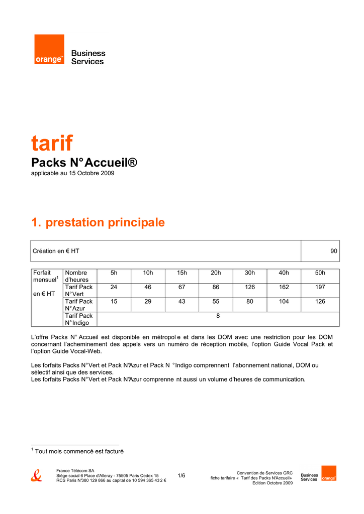 tarif Packs N° Accueil® applicable au 15 Octobre 2009 1. prestation principale Création en € HT Forfait 1 mensuel en € HT Nombre d’heures Tarif Pack N° Vert Tarif Pack N° Azur Tarif Pack N° Indigo 90 5h 10h 15h 20h 30h 40h 50h 24 46 67 86 126 162 197 15 29 43 55 80 104 126 8 L’offre Packs N° Accueil est disponible en métropol e et dans les DOM avec une restriction pour les DOM concernant l’acheminement des appels vers un numéro de réception mobile, l’option Guide Vocal Pack et l’option Guide Vocal-Web. Les forfaits Packs N° Vert et Pack N°Azur et Pack N ° Indigo comprennent l’abonnement national, DOM ou sélectif ainsi que des services. Les forfaits Packs N° Vert et Pack N°Azur comprenne nt aussi un volume d’heures de communication. 1 Tout mois commencé est facturé France Télécom SA Siège social 6 Place d'Alleray - 75505 Paris Cedex 15 RCS Paris N°380 129 866 au capital de 10 594 365 43 2 € 1/6 Convention de Services GRC fiche tarifaire « Tarif des Packs N°Accueil» Edition Octobre 2009 1.1 Détail de l’abonnement et des services inclus Inscription à l’annuaire universel dans la base de données Annuaire à des fins de parution Inscription à l’annuaire Inscription dans la base de données annuaire des opérateurs à des fins de parution Réception et acheminement des appels Abonnement national, DOM ou sélectif Acheminement secondaire Numéro de réception mobile (hors DOM) Accès interdit depuis les cabines Pour cibler le territoire national ou bien seulement quelques zones géographiques. Lorsque le numéro de réception des appels de votre Numéro Accueil est occupé, saturé ou ne répond pas, les appels sont renvoyés sur un numéro ème de votre choix. Ce 2 numéro de réception activé est offert. Acheminement des appels vers un numéro de réception mobile de métropole. Ce service n’est pas disponible dans les DOM Permet d’interdire l’accès à un numéro vert depuis les cabines téléphoniques. Optimisation du forfait Optima Intégration des minutes mobiles dans le forfait. Chaque mois, ajustement au forfait le plus avantageux, compte tenu de la consommation réelle. Les appels reçus sur un numéro de réception mobile sont décomptés dans le forfait . Prestations d’accompagnement Guide Conseils et Hot line Accès universel au Web@dministrateur Conseils pratiques et personnalisés sur l’usage des Packs N° Accueil. Permet d’accéder au site en ligne de gestion de votre numéro. 1.2 Détail de la tarification des communications dans le forfait Pack N°Vert Appels reçus sur un numéro de réception fixe ou IP : à l’établissement de l’appel, un minimum de perception équivalent à 30 secondes de communication est appliqué. La facturation s’effectue ensuite à la seconde. Appels reçus sur un numéro de réception mobile : une minute de communication sur un numéro de réception mobile équivaut à 4 minutes de communication sur un numéro de réception fixe. Pour chaque communication, un minimum de perception équivalent à 2 minutes de forfaits est décompté. Pack N° Azur Appels reçus sur un numéro de réception fixe ou IP : facturation à la seconde dès l’établissement de l’appel. Appels reçus sur un numéro de réception mobile : facturation à la seconde dès l’établissement de l’appel. La minute de communication vers un numéro de réception mobile équivaut à 5 minutes et 36 secondes de communication vers un numéro de réception fixe. Pack N° Indigo Appels reçus sur un numéro de réception fixe ou IP : appels non facturés Appels reçus sur un numéro de réception mobile : voir tarification hors forfait France Télécom SA Siège social 6 Place d'Alleray - 75505 Paris Cedex 15 RCS Paris N°380 129 866 au capital de 10 594 365 43 2 € 2/6 1.3 Détail de la tarification des communications au delà du forfait. Appels reçus sur un numéro de réception fixe Pack N° Vert Pack N° Azur Crédit temps 30 sec. - Minimum de perception 0, 04 - Tarif normal 0, 08 0, 05 Minimum de perception 0, 32 - Tarif normal 0, 32 0, 28 0, 23 Appels reçus sur un numéro de réception mobile Pack N° Vert Pack N° Azur Pack N° Indigo Crédit temps 120 sec. - Les appels en provenance de l’étranger pour les Packs N° Vert, Azur, Indigo - tarif unique de 0,055 € HT par minute de communication dès la première seconde sur un numéro de réception fixe sont facturés hors forfait à 0,20€ la minute (première minute indivisible) sur un numéro de réception mobile Tarification des appels vers des Numéros de Réception internationaux Les communications vers des Numéros de Réception internationaux sont hors forfait. Pour l’appelé (l’entreprise), le prix de la communication est défini dans la fiche tarifaire « Tarification internationale pour des numéros de réception fixes » des Numéros Accueil. France Télécom SA Siège social 6 Place d'Alleray - 75505 Paris Cedex 15 RCS Paris N°380 129 866 au capital de 10 594 365 43 2 € 3/6 2. services optionnels La facturation s’effectue mensuellement. 2.1 Choix du numéro Vous pouvez choisir le numéro de votre Pack N° Vert , Pack N° Azur, Pack N° Indigo Caractéristiques des numéros Numéro rare Exemples Les 4, 6 ou 8 derniers chiffres sont identiques ou consécutifs Les 6 derniers chiffres sont 3 couples identiques ou 2 triplets exceptionnels Numéro remarquable Numéro choisi Les 6 derniers chiffres sont 3 couples représentant 3 nombres consécutifs ou dont les dizaines sont des chiffres consécutifs et les unités identiques Les 4 derniers chiffres sont 2 couples de chiffres différents, ou 2 couples consécutifs ou 2 couples symétriques 0 800 01 23 45 0 800 06 54 32 0 810 34 34 34 0 820 789 789 0 800 12 13 14 0 825 01 11 21 0 820 20 17 71 Numéro dont un chiffre au moins est choisi et dont la composition n'est pas définie précédemment prix mensuel en € HT 100 50 23 Ces exemples de combinaisons ne sont pas limitatifs ; Lorsqu'un