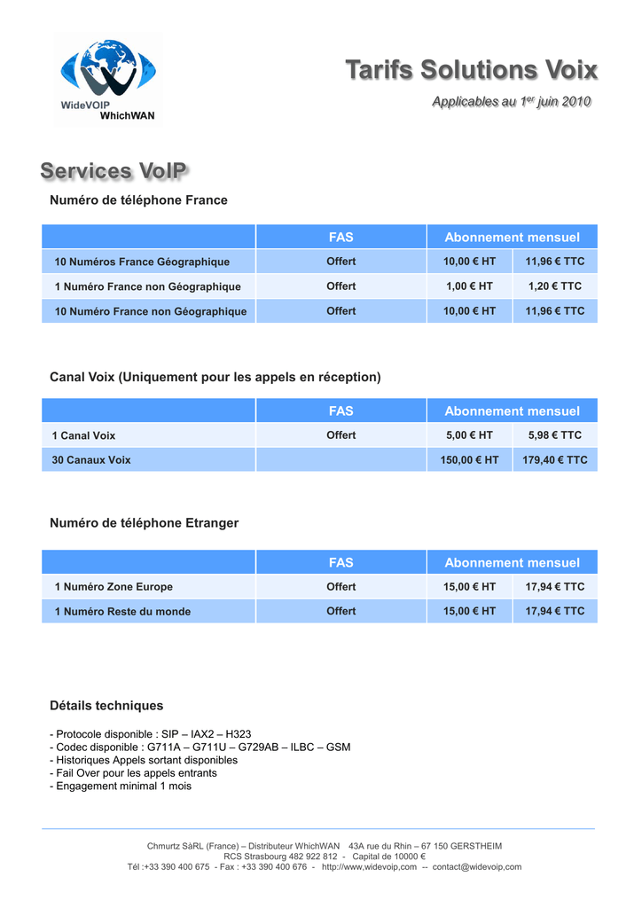 Tarifs Solutions Voix Applicables au 1er juin 2010 Services VoIP Numéro de téléphone France FAS Abonnement mensuel 10 Numéros France Géographique Offert 10,00 € HT 11,96 € TTC 1 Numéro France non Géographique Offert 1,00 € HT 1,20 € TTC 10 Numéro France non Géographique Offert 10,00 € HT 11,96 € TTC Canal Voix (Uniquement pour les appels en réception) 1 Canal Voix FAS Abonnement mensuel Offert 5,00 € HT 5,98 € TTC 150,00 € HT 179,40 € TTC 30 Canaux Voix Numéro de téléphone Etranger FAS Abonnement mensuel 1 Numéro Zone Europe Offert 15,00 € HT 17,94 € TTC 1 Numéro Reste du monde Offert 15,00 € HT 17,94 € TTC Détails techniques - Protocole disponible : SIP – IAX2 – H323 - Codec disponible : G711A – G711U – G729AB – ILBC – GSM - Historiques Appels sortant disponibles - Fail Over pour les appels entrants - Engagement minimal 1 mois Chmurtz SàRL (France) – Distributeur WhichWAN 43A rue du Rhin – 67 150 GERSTHEIM RCS Strasbourg 482 922 812 - Capital de 10000 € Tél :+33 390 400 675 - Fax : +33 390 400 676 - http://www,widevoip,com -- contact@widevoip,com Tarifs Solutions Voix Applicables au 1er juin 2010 Numéros Spéciaux 08AB Numéro Vert 0805 Abonnement mensuel par numéro : 30 €HT / mois Numéro VIP : 90 €HT / mois Frais de mise en service : 50 €HT Prix des communications : * 0.045 €HT par appel * 0.022 €HT par minute *surtaxe cabine 0.09€HT par minute Numéro Azur 0811 Abonnement mensuel par numéro : 1€HT / mois Frais de mise en service : 10 €HT Numéro Indigo 0821 Abonnement mensuel par numéro : 30 €HT / mois Numéro VIP : 60€HT / mois Frais de mise en service : 80€HT Reversement : * Trafic mensuel inférieur à 50 000 minutes * Trafic mensuel supérieur à 50 000 minutes 2,40€HT par heure 3.60€HT par heure Numéro Indigo 0826 Abonnement mensuel par numéro : 30 €HT / mois Numéro VIP : 60€HT / mois Frais de mise en service : 80€HT Reversement : * Trafic mensuel inférieur à 50 000 minutes * Trafic mensuel supérieur à 50 000 minutes 3,00€HT par heure 4,80€HT par heure Chmurtz SàRL (France) – Distributeur WhichWAN 43A rue du Rhin – 67 150 GERSTHEIM RCS Strasbourg 482 922 812 - Capital de 10000 € Tél :+33 390 400 675 - Fax : +33 390 400 676 - http://www,widevoip,com -- contact@widevoip,com Tarifs Solutions Voix Applicables au 1er juin 2010 Numéros Audiotel 08AB Numéro 0892 Abonnement mensuel par numéro : 30 €HT / mois Numéro VIP : 60€HT / mois Frais de mise en service : 80€HT Reversement : * Trafic mensuel inférieur à 50 000 minutes 9,60€HT par heure * Trafic mensuel supérieur à 50 000 minutes 12,00€HT par heure Numéro Azur 0899 Abonnement mensuel par numéro : 30 €HT / mois Numéro VIP : 60€HT / mois Frais de mies en service : 80€HT Reversement : * Trafic mensuel inférieur à 50 000 minutes 0,85€HT par appel + 9,00€HT par heure * Trafic mensuel supérieur à 50 000 minutes 0,87€HT par appel + 11,40€HT par heure Chmurtz SàRL (France) – Distributeur WhichWAN 43A rue du Rhin – 67 150 GERSTHEIM RCS Strasbourg 482 922 812 - Capital de 10000 € Tél :+33 390 400 675 - Fax : +33 390 400 676 - http://www,widevoip,com -- contact@widevoip,com Tarifs Solutions Voix Applicables au 1er juin 2010 Fax2EMail / Email2Fax FAS Abonnement mensuel Numéro France Géographique Offert 5,00 € HT 5,98 € TTC Numéro France non Géographique Offert 5,00 € HT 5,98 € TTC Hors coût d’émission (facturation à la minute selon tarif minute) Portabilité numéro France FAS Portabilité Numéro Géographique 60,00 € HT Abonnement mensuel 71,76 € TTC Tranche de 10 numéros consécutifs Sous réserve opérateur Terminaison E1/T2 – Trunk SIP 30 canaux FAS Abonnement mensuel Port E1 / TDM 30 canaux 750,00 € HT 897,00 € TTC 250,00 € HT 299,00 € TTC Trunk SIP / IAX2 30 canaux 350,00 € HT 418,60 € TTC 150,00 € HT 179,40 € TTC Options FAS Abonnement mensuel CDR Appel Entrant 20,00 € HT 23,92 € TTC 10,00 € HT 11,96 € TTC VPN SSL 50,00 € HT 59,80 € TTC 20,00 € HT 23,92 € TTC Chmurtz SàRL (France) – Distributeur WhichWAN 43A rue du Rhin – 67 150 GERSTHEIM RCS Strasbourg 482 922 812 - Capital de 10000 € Tél :+33 390 400 675 - Fax : +33 390 400 676 - http://www,widevoip,com -- contact@widevoip,com