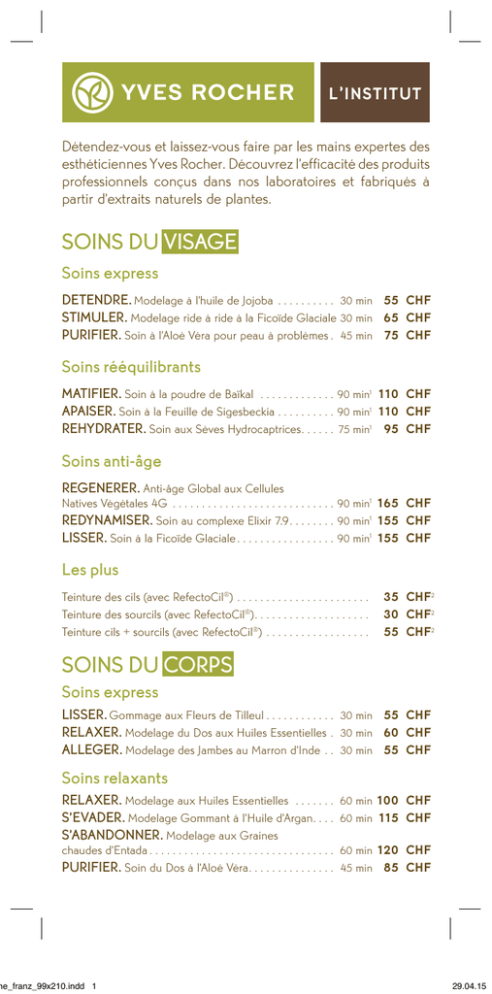 ‚ L INSTITUT Détendez-vous et laissez-vous faire par les mains expertes des esthéticiennes Yves Rocher. Découvrez l’efficacité des produits professionnels conçus dans nos laboratoires et fabriqués à partir d’extraits naturels de plantes. SOINS DU VISAGE Soins express DETENDRE. Modelage à l’huile de Jojoba . . . . . . . . . . . 30 min 55 CHF STIMULER. Modelage ride à ride à la Ficoïde Glaciale .30 min 65 CHF PURIFIER. Soin à l’Aloé Véra pour peau à problèmes. . 45 min 75 CHF Soins rééquilibrants MATIFIER. Soin à la poudre de Baïkal . . . . . . . . . . . . . . 90 min1 110 CHF APAISER. Soin à la Feuille de Sigesbeckia. . . . . . . . . . . 90 min1 110 CHF REHYDRATER. Soin aux Sèves Hydrocaptrices. . . . . . 75 min1 95 CHF Soins anti-âge REGENERER. Anti-âge Global aux Cellules Natives Végétales 4G . . . . . . . . . . . . . . . . . . . . . . . . . . . . 90 min1165 CHF REDYNAMISER. Soin au complexe Elixir 7.9. . . . . . . . 90 min1155 CHF LISSER. Soin à la Ficoïde Glaciale. . . . . . . . . . . . . . . . . 90 min1155 CHF Les plus Teinture des cils (avec RefectoCil®) . . . . . . . . . . . . . . . . . . . . . . . . 35 CHF2 Teinture des sourcils (avec RefectoCil®). . . . . . . . . . . . . . . . . . . . . 30 CHF2 Teinture cils + sourcils (avec RefectoCil®) . . . . . . . . . . . . . . . . . . . 55 CHF2 SOINS DU CORPS Soins express LISSER. Gommage aux Fleurs de Tilleul. . . . . . . . . . . . . RELAXER. Modelage du Dos aux Huiles Essentielles . . ALLEGER. Modelage des Jambes au Marron d’Inde . . . 30 min 55 CHF 30 min 60 CHF 30 min 55 CHF Soins relaxants RELAXER. Modelage aux Huiles Essentielles . . . . . . . . S’EVADER. Modelage Gommant à l’Huile d’Argan. . . . . S’ABANDONNER. Modelage aux Graines 60 min100 CHF 60 min 115 CHF chaudes d’Entada. . . . . . . . . . . . . . . . . . . . . . . . . . . . . . . . . 60 min120 CHF PURIFIER. Soin du Dos à l’Aloé Véra. . . . . . . . . . . . . . . . 45 min 85 CHF ne_franz_99x210.indd 1 29.04.15 ‚ L INSTITUT EPILATION Epilation des sourcils . . . . . . . . . . . . . . . . . . . . . . . . . . . . . . . . . . . . Lèvres supérieures . . . . . . . . . . . . . . . . . . . . . . . . . . . . . . . . . . . . . . Menton. . . . . . . . . . . . . . . . . . . . . . . . . . . . . . . . . . . . . . . . . . . . . . . Visage (3 zones) . . . . . . . . . . . . . . . . . . . . . . . . . . . . . . . . . . . . . . . Demi jambes. . . . . . . . . . . . . . . . . . . . . . . . . . . . . . . . . . . . . . . . . . . Jambes entières . . . . . . . . . . . . . . . . . . . . . . . . . . . . . . . . . . . . . . . . Maillot. . . . . . . . . . . . . . . . . . . . . . . . . . . . . . . . . . . . . . . . . . . . . . . . Maillot brésilien/intégral . . . . . . . . . . . . . . . . . . . . . . . . . . . . . . . . . Aisselles. . . . . . . . . . . . . . . . . . . . . . . . . . . . . . . . . . . . . . . . . . . . . . . Demi bras . . . . . . . . . . . . . . . . . . . . . . . . . . . . . . . . . . . . . . . . . . . . . Bras complet . . . . . . . . . . . . . . . . . . . . . . . . . . . . . . . . . . . . . . . . . . . Dos ou torse. . . . . . . . . . . . . . . . . . . . . . . . . . . . . . . . . . . . . . . . . . . Jambes entières + maillot . . . . . . . . . . . . . . . . . . . . . . . . . . . . . . . . Jambes entières + maillot brésilien/intégral. . . . . . . . . . . . . . . . . . Jambes entières + maillot brésilien/intégral + aisselles . . . . . . . . . 24 15 15 50 45 65 30 50 25 35 45 50 80 95 115 CHF2 CHF2 CHF2 CHF2 CHF CHF CHF CHF CHF CHF CHF CHF CHF CHF CHF MISE EN BEAUTÉ Manucure & Beauté des pieds Soin des mains express aux Huiles Essentielles . . . . . . . . 30 min 45 CHF Grand soin des mains aux Huiles Essentielles. . . . . . . . . . 60 min 75 CHF Grand soin des pieds aux Huiles Essentielles . . . . . . . . . . 60 min 75 CHF Maquillage Maquillage jour. . . . . . . . . . . . . . . . . . . . . . . . . . . . . . . . . . . . . . . . . 40 CHF Maquillage soir. . . . . . . . . . . . . . . . . . . . . . . . . . . . . . . . . . . . . . . . . 50 CHF Maquillage mariée (avec un essai) . . . . . . . . . . . . . . . . . . . . . . . . 120 CHF Prenez Rendez-vous ! Nous sommes très heureux de vous accueillir ! En cas d’empêchement, merci d’annuler 24 heures à l’avance. Téléphone +41 (0)21 320 10 60 Place Bel Air 1 • 1003 Lausanne www.yves-rocher.ch/lausanne 1 y compris conseils personnalisés 2 en combinaison avec un soin du visage CHF 10 de réduction ne_franz_99x210.indd 2 29.04.15