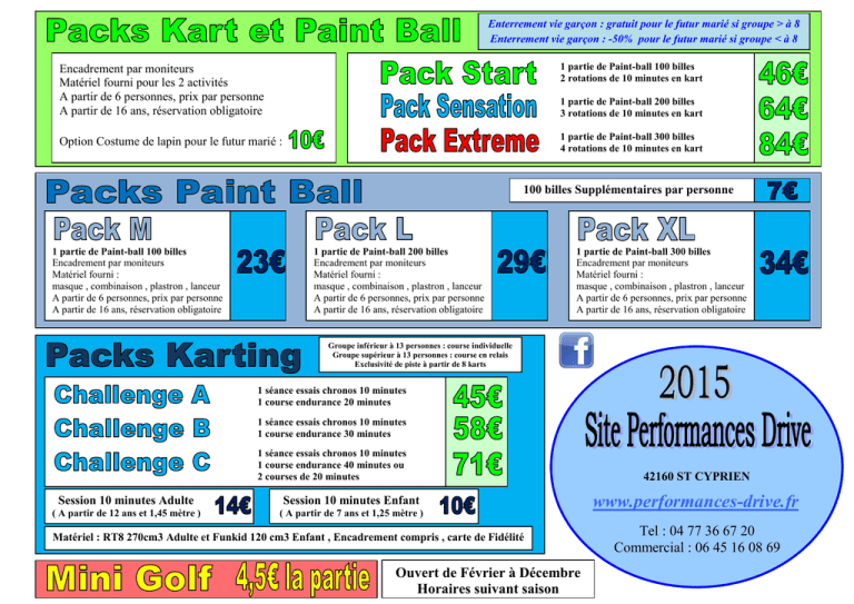 Enterrement vie garçon : gratuit pour le futur marié si groupe > à 8 Enterrement vie garçon : -50% pour le futur marié si groupe < à 8 Encadrement par moniteurs Matériel fourni pour les 2 activités A partir de 6 personnes, prix par personne A partir de 16 ans, réservation obligatoire 1 partie de Paint-ball 100 billes 2 rotations de 10 minutes en kart Option Costume de lapin pour le futur marié : 1 partie de Paint-ball 300 billes 4 rotations de 10 minutes en kart 1 partie de Paint-ball 200 billes 3 rotations de 10 minutes en kart Enterrement de vie100debilles garçon : costumepar depersonne lapin offert !!! Supplémentaires 1 partie de Paint-ball 100 billes Encadrement par moniteurs Matériel fourni : masque , combinaison , plastron , lanceur A partir de 6 personnes, prix par personne A partir de 16 ans, réservation obligatoire 1 partie de Paint-ball 200 billes Encadrement par moniteurs Matériel fourni : masque , combinaison , plastron , lanceur A partir de 6 personnes, prix par personne A partir de 16 ans, réservation obligatoire 1 partie de Paint-ball 300 billes Encadrement par moniteurs Matériel fourni : masque , combinaison , plastron , lanceur A partir de 6 personnes, prix par personne A partir de 16 ans, réservation obligatoire Groupe inférieur à 13 personnes : course individuelle Groupe supérieur à 13 personnes : course en relais Exclusivité de piste à partir de 8 karts 1 séance essais chronos 10 minutes 1 course endurance 20 minutes 1 séance essais chronos 10 minutes 1 course endurance 30 minutes 1 séance essais chronos 10 minutes 1 course endurance 40 minutes ou 2 courses de 20 minutes Session 10 minutes Adulte Session 10 minutes Enfant ( A partir de 12 ans et 1,45 mètre ) ( A partir de 7 ans et 1,25 mètre ) Matériel : RT8 270cm3 Adulte et Funkid 120 cm3 Enfant , Encadrement compris , carte de Fidélité Ouvert de Février à Décembre Horaires suivant saison 42160 ST CYPRIEN www.performances-drive.fr Tel : 04 77 36 67 20 Commercial : 06 45 16 08 69