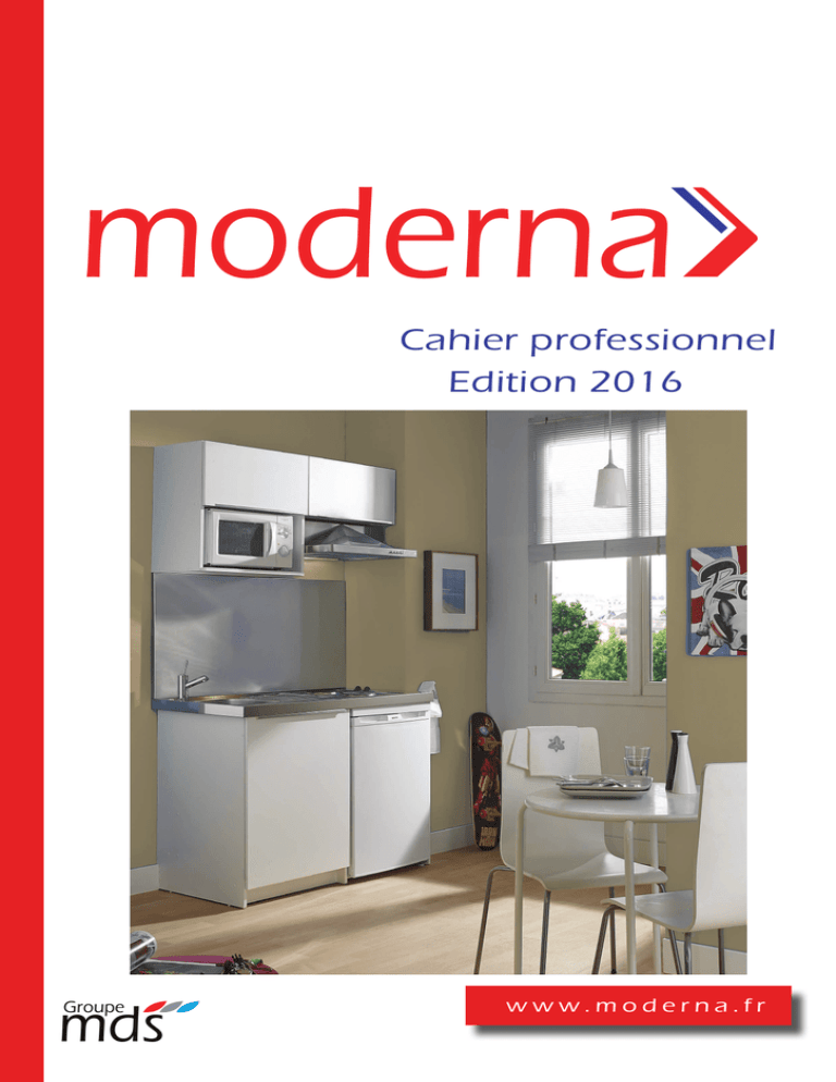 moderna Cahier professionnel Edition 2016 mds Groupe www.moderna.fr MEUBLES METAL Un concept innovant tout en couleurs Version Cuisinette Meuble en métal thermolaqué pour cuisinettes de 100 ou 120 cm avec niche pour réfrigérateur à droite 1 caisson, 1 porte, 1 étagère, 1 poignée fil, fermeture par butée aimantée Fiche produit 607 Technologie de cuisson au choix : plaques électriques intégrées à l’évier cuisinette ou évier avec découpe + domino de cuisson (électrique, vitrocéramique ou induction) 6 coloris au choix de série Réfrigérateur Classe A+, 55 cm, 120L, 4**** OPTION : fiche produit 202 Habillage porte du réfrigérateur en métal thermo-laqué, coloris assorti au caisson de votre choix adaptable uniquement sur le réfrigérateur 55 cm Version Meuble sous-évier Meuble sous-évier en métal thermolaqué de 100 ou 120 cm 1 caisson, 2 portes, 1 étagère, 2 poignées fil, fermeture par butée aimantée Au choix : Evier à poser en Inox Evier à poser en résine de synthèse Evier cuisinette Les + produit MODERNA Montage FLASH (moins de 8 minutes) Robustesse Imputrescible 100% recyclable Facilité de nettoyage Pré-découpes pour le passage de tuyauterie apparente Fiche produit 608 6 coloris au choix de série OPTION : Kit d'adaptation avec la possibilité d'adapter la poubelle tri séléctif de Moderna en lieu et place de l'étagère. · Vidéo de montage sur notre site www.moderna.fr Possibilité de choisir la couleur du caisson et des portes à partir d’une commande de 20 unités minimum (RAL à préciser, sous réserve de validation par MODERNA) 2 Fabrication française MEUBLES METAL Les cuisinettes aux mille et une couleurs Meuble en métal thermolaqué 1 porte pour longueur 100 et 120 cm ou 2 portes pour longueur de 140 cm 1 étagère 2 joues latérales Montants inox Habillage réfrigérateur (compatible uniquement avec le réfrigérateur MRT4055Z00) Evier cuisinette en inox 18/10 1 cuve, 2 plaques électriques intégrées, livré avec vidage complet et raccord lave-vaisselle Réfrigérateur 120L, Classe A+, 4 étoiles Fiche produit 301 3 0 Vert Glacier 9 Carmin 7 Cappuccino 5 Anthracite 8 Chocolat Les + produit MODERNA Robustesse Imputrescible 100% recyclable Facilité de nettoyage Possibilité d'adapter un kit d'installation à l'arrière de la Métalline pour faciliter le passage de la tuyauterie 6 coloris de série Possibilité de choisir la couleur de votre choix à partir d’une commande de 20 unités minimum COMBIBLOC (RAL à préciser, sous réserve de validation La cuisine compacte par MODERNA) Fiche produit 101 Meuble en métal thermolaqué 120 cm Meuble bas Métalline, étagère haute, crédence inox toilé, barre accessoires inox, volet roulant gris sur partie haute avec rupteur de sécurité. Evier cuisinette en inox 18/10 1 cuve, domino vitrocéramique, livré avec vidage complet et raccord lavevaisselle ; Possibilité domino vitrocéramique ou induction. Réfrigérateur 120L, Classe A+, 4 étoiles avec congélateur 13L et dégivrage automatique, habillage de la porte compris. Micro-ondes et hotte pyramide inox compris. Coupe circuit de sécurité en position volet descendu. Version PRIMO coloris Blanc Glacier, domino électrique, hotte casquette blanche, sans micro-ondes et sans habillage du réfrigérateur Version DECO Fabrication française 3 MEUBLES METAL MEUBLES CLIPMETAL MEUBLES METALLINE Meubles sous-évier • Meuble de 100 ou 120 cm en métal thermolaqué • Cadre blanc ou couleur Meubles cuisinettes • Meuble de 100 ou 120 cm en métal thermolaqué avec niche pour réfrigérateur à droite • 1 étagère • Cadre blanc ou couleur • 2 portes couleur en métal thermo- • 1 étagère laqué, perçées pour fixation des • 1 porte couleur en métal thermolaqué, perçée pour fixation de la poignées poignée • 2 poignées fils • Fermeture par butée aimantée • 1 poignée fil • Fermeture par butée aimantée Dimensions cuisinettes Caisson [L x P x H cm] Dimensions cuisinettes Caisson [L x P x H cm] Cuisinette de 100 cm 40 x 58 x 83 Cuisinette de 100 cm 40 x 58 x 83 Cuisinette de 120 cm 60 x 58 x 83 Cuisinette de 120 cm 60 x 58 x 83 • Meuble en métal thermolaqué et pieds inox • 1 porte pour longueur 100 et 120 ou 2 portes pour longueur de 140 cm • 2 joues latérales • 6 coloris au choix • 1 étagère • 1 habillage réfrigérateur assorti Dimensions cuisinettes Caisson [L x P x H cm] Cuisinette de 100 cm 40 x 60 x 87 Cuisinette de 120 cm 60 x 60 x 87 Cuisinette de 140 cm 80 x 60 x 87 OPTION : Habillage porte du réfrigérateur en métal thermolaqué, coloris au choix Possibilité de choisir la couleur du cadre et des portes à partir d’une commande de 20 unités Meubles hauts thermolaqués Coloris assortis au meuble bas minimum (RAL à préciser, sous réserve de validation par MODERNA) Meubles hauts thermolaqués Coloris assortis au meuble bas Dimensions Armoire 1 porte Meuble sur hotte [L x P x H cm] 40 x 35 x 35 60 x 35 x 60 60 x 35 x 35 Dimensions Armoire avec porte Niche four microondes [L x P x H cm] 40 x 35 x 35 60 x 35 x 60 60 x 35 x 35 Possibilité de choisir la couleur de votre choix à partir d’une commande de 20 unités minimum (RAL à préciser, sous réserve de validation par MODERNA) 4 Fabrication française MEUBLES MELAMINES BOREALE CADETTE Fiche produit 302 Meuble mélaminé Blanc 1 porte, étagère, joue latérale Evier cuisinette en inox 18/10 1 cuve, 2 plaques électriques intégrées , livré avec vidage complet et raccord lave-vaisselle Réfrigérateur 120L, 55 cm, Classe A+, 4 étoiles avec congélateur 13L et dégivrage automatique 2 Longueurs : 100 et 120 cm Fiche produit 303 Meuble mélaminé Blanc 1 porte, étagère, joue latérale Evier cuisinette en inox 18/10 1 cuve, 2 plaques électriques intégrées , livré avec vidage complet et raccord lave-vaisselle Réfrigérateur 84L, 48 cm, Classe A+, 2 étoiles avec freezer 10L 2 Longueurs : 100 et 120 cm Les + produit MODERNA 