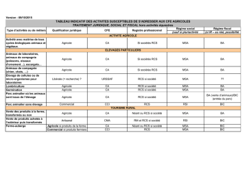 Version : 09/10/2015 TABLEAU INDICATIF DES ACTIVITES SUSCEPTIBLES DE S’ADRESSER AUX CFE AGRICOLES TRAITEMENT JURIDIQUE, SOCIAL ET FISCAL hors activités équestres Type d’activités ou de métiers Qualification juridique CFE Registre professionnel Régime social (sauf si pluriactivité Régime fiscal (si IR – au réel, possibilité MSA BA ACTIVITE AGRICOLE Activité avec maitrise de tous cycles biologiques animaux et végétaux. Agricole CA Si sociétés RCS ELEVAGES PARTICULIERS Animaux de laboratoires, animaux de compagnie (poissons, oiseaux d'ornement…), escargots… Animaux de compagnie (chien, chats, …) Elevage de cellules ou de micro-organismes pour laboratoires Lombriculture Germination Parc animalier où les animaux sont issus de l’élevage Parc animalier sans élevage Agricole CA Si sociétés RCS MSA BA Agricole CA Si sociétés RCS MSA BA Libérale (= recherche) ? URSSAF RCS si société MSA ?? Agricole Agricole CA CA RCS si société RCS si société MSA MSA BA BA Agricole CA RCS si société MSA BA (vente d’animaux)/BIC (entrée du parc) Commercial CCI RCS RSI BIC CA Néant ou RCS si société MSA BA CMA RM et RCS si société RSI BIC CA CCI Néant ou RCS si société RCS MSA MSA BIC BIC TOURISME RURAL Vente des produits à la ferme, Agricole transformés ou non Vente de produits achetés à Artisanal l’extérieur puis transformés Agricole si produits de la ferme Ferme-auberge Commercial si produits fermiers Type d’activités ou de métiers Restauration non agricole (auberge…) Chambres et tables d’hôtes sur exploitation agricole (lien économique suffisant) Chambres d’hôtes tenues par un agriculteur, mais sans lien suffisant avec son exploitation agricole Chambres et tables d’hôtes non tenues par un agriculteur Location gîtes ruraux sans prestations para-hotelières Location gîtes ruraux avec prestations para-hôtelières avec un lien fort avec l’exploitation (plus que simple localisation sur l'exploitation, prestations sur exploitations : degustation produits de la ferme, visite de la ferme,...) Location de gîtes ruraux avec prestations para-hôtelières sans lien avec l’exploitation Camping sur exploitation agricole, avec un lien suffisant avec la ferme (zone naturelle de camping également) Camping non agricole Ferme pédagogique Qualification juridique CFE Registre professionnel Régime social (sauf si pluriactivité Régime fiscal (si IR – au réel, possibilité Commercial CCI RCS RSI BIC Agricole CA Néant ou RCS si société MSA BIC Commercial CCI RCS MSA si le lieu de l’exploitation, Sinon, RSI BIC Commercial si activité professionnelle CCI RCS RSI BIC Civile Greffe (suite déléguation compétence Impôt) RCS si société Néant BIC Agricole CA RCS si société MSA BIC Commercial CCI RCS MSA si située sur le lieu de l’exploitation sinon RSI BIC Agricole CA RCS si société MSA BIC Commercial Agricole CCI CA RCS RCS si société RSI MSA BIC BIC Type d’activités ou de métiers Théâtre à la ferme Labyrinthe à la ferme Production de Spiruline (algues) Aquaculture marine ou en eau douce (étangs, bassins…) : pisciculture Conchyliculture (coquillages) Ostréiculture (huîtres) Mytiliculture (moules) Pêche maritime Pêche en eau douce professionnelle Pêche à pied professionnelle Marais salants (petits producteurs) Marais salants Faucardage / Arrachage de plantes invasives Qualification juridique Agricole Agricole CFE Registre professionnel CA RCS si société CA RCS si société ACTIVITES MARINES OU AQUACOLES Régime social (sauf si pluriactivité MSA MSA Régime fiscal (si IR – au réel, possibilité BIC BIC Agricole CA RCS si société MSA BA Agricole CA RCS si société MSA BA Agricole CA RCS si société MSA BA Agricole Agricole Commercial CA CA CCI RCS si société RCS si société RCS MSA MSA ENIM si navigation à plus de BA BA BIC Commercial CCI RCS MSA BIC Commercial CCI RCS MSA BIC Agricole CA MSA BA Artisanal CMA RM et RCS si société Commercial CCI RCS RSI MSA si clients sont agriculteurs sinon RSI BIC ACTIVITES FORESTIERES Entreprise de travaux forestiers (abattage, débardage, travail à façon) Exploitant forestier (achatrevente de coupes) Sylviculture (propriétaire forestier exploitant) Commercial CCI RCS MSA BIC Commercial CCI RCS RSI BIC Agricole CA RCS si société (GF ou GFR) MSA BA Type d’activités ou de métiers Bûcheron (sans transformation du bois – coupe seule) Bûcheron avec transformation du bois Gemmage (recupération de résine de pin) Pépiniériste Création de jardins, réalisations, entretien lorsque l’entreprise a produit les plants Entretien de parcs et jardins Création de parcs et jardins avec terrassement, maçonnerie Conception, architectepaysagiste Horticulteur Vente de graines, poteries, engrais… Fleuriste Taille des arbres Greffe de rosier et arbres frutières Qualification juridique CFE Registre professionnel Régime social (sauf si pluriactivité Régime fiscal (si IR – au réel, possibilité Commercial CCI RCS MSA BIC Artisanal CMA RM et RCS si société RSI BIC MSA RSI BA BIC Agricole CA RCS si société CCI RCS PARCS, JARDINS, FLEURS CA RCS si société MSA BA Agricole CA RCS si société MSA BA/BIC Commercial CCI RCS MSA BIC Artisanal CMA RM et RCS si société MSA BIC Libéral URSSAF RCS si société URSSAF BNC Agricole CA RCS si société MSA BA Commercial CCI RCS RSI BIC Artisanal Commercial CMA CCI RM + RCS si société RCS BIC BIC Commercial CCI RCS RSI MSA MSA si clients sont agriculteurs sinon RSI Si c'est fait par un sylviculteur Si sur les pins d'un tiers, BIC Type d’activités ou de métiers Qualification juridique CFE Registre professionnel Régime social (sauf si pluriactivité Régime fiscal (si IR – au réel, possibilité Organisations para-agricoles Coopératives agricoles/CUMA Syndicat agricole Groupements d’employeurs agricoles/service de remplacement agricole Lycée agricole, Commune, Chambre d’Agriculture… gérant une exploita