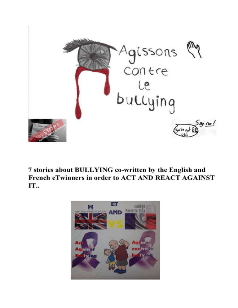 7 stories about BULLYING co-written by the English and French eTwinners in order to ACT AND REACT AGAINST IT.. SOMMAIRE / TABLE OF CONTENTS Story 1 : A sad cyberbullying story p 3 Story 2 : La fugue : un départ vers un monde meilleur ? p Story 3 : L’importance de communiquer Story 4 : La rumeur p p Story 5 : Enzo’s story 8 14 17 p 23 Story 6 : The beginning of a great friendship p 25 Story 7 : La peur au ventre 27 Story 1 : A p sad cyberbullying story I write today on this website because I've done something terrible and I need to confess. 2 years ago when I was 15 years old I was uncomfortable with myself, I had no friends and I was bad at school. Also I... in order to be comfortable with myself, I decided to make a poor girl be uncomfortable too. In my class there was a girl who was nice with everyone. I can't say her name here, I did too much harm to her. She was always happy and smiling. She was also nice with me, contrary to the others, she didn't take care of my red hair and my small size. But why was she happy when I wasn't ? I couldn't stand it ! I started to talk to her by sending her some messages on Twitter, Facebook, Instagram, Snapchat, I told her was in love with her. But she never knew that I actually didn't... After one month I started to be violent. I insulted her and blackmailed her. Here is the conversation we had (on Facebook) about photo... a nude photo. -Honey, why won't you talk to me ? I know that I didn't do what you wanted me to, but... Imagine that my parents will see it one day... -Don't try to apologize bi***, I told you that I wouldn't show it to anyone don't you trust me ? If you don't trust me that's maybe because you don't love me. -No, I love you ! How can you say it ? I'm crying here... -I don't care of you anymore if you don't send me a photo I will break up with you ! -No... No... How can you ? -I won't talk to you anymore... Bye -No Honey ! I love you !... Ok, I will send it to you, but promise me not to show it to anyone, never. -That's ok baby, speed up and send it ! And she sent it... a photo of her body... Nude. She was beautiful, this kind of girl that all boys are ‘’chasing’’. She was only was a tool that I used in order to feel better... And it worked ! After that I ignored her during a week. Next I broke up with her, I felt stronger and stronger everyday and her worse and worse until the day when I uploaded the photo on Instagram. The same day when she tried to commit suicide…. Fin 1 Mais après elle m’envoyé le message de ce qu’elle allait faire parce que je savais que je devais aider. Puis j’ai effacé la photo et j’ai couru à sa maison pour dire à ses parents ce que j’avais fait et les prévenir de ce qu’elle allait faire. Bien qu’ils voulaient me tuer à l'époque, ils ont écouté tout et l'ont sauvée. Ils lui ont parlé et l’ont convaincu , mais après ça, elle n’est pas venue à l'école la semaine qui suivait. Dans la nuit de vendredi jusqu’à la fin de la semaine, ma mère est venue dans ma chambre, et m’a donné le téléphone avec une expression inquiète sur son visage. Je l'ai pris et mis à mon oreille. “Bonjour?” “Bonjour, c'est la ligne des services d'urgence de Watford, est-ce Paul Laminie?” “Oui, qui parle?” “Mon nom est Amélie Thompson, chef du département de police de Watford. Nous aimerions que vous veniez au commissariat de Police aujourd'hui à 15 heures. Nous devons discuter de certaines ‘choses’ ...” Paul a posé le téléphone. Il était terrorisé bien qu’il savait de quoi il s’agissait. Il n’avait jamais eu de problèmes avec la police dans la passé. Donc il s’est preparé et est allé à la police. Quand il est arrivé, Amelie a dit qu’il ne pourrait plus jamais voir la fille. Paul est allé en prison pendant 30 jours. Aujourd’ hui c’est son 14 ème jour et il a décidé de ne plus continuer à vivre – c’est une lettre de suicide. Fin 2 L’image a été partagé. Et encore partagé. Elle était partout. Et sur chaque image il y avait des commentaires abusifs. Elle etait imprimée et collée autour de l’école ; même ses copains l’avaient partagé et rigolaient de la photo. C’est alors que ses parents ont vu la photo. Et ils étaient tres mécontents car il sont très religieux et ils avaient peur de la réputation de la famille. Comme ils n’etaient pas aidant, elle s’est suicidée car elle ne voulait pas faire honte à ses parents. Ensuite, ses parents ont été choqués et ont realisé qu’ils n’ont pas aidé comme il aurait fallu. Le méchant garcon a beaucoup pleuré et a été puni par ses parents et à l’école. Depuis il a aussi été choqué et il essaye d’aider les victimes de harcèlements car c’est devenu important pour lui de rester positif. The beginning of this story was written by Salomon, Matthias, Arthur, Louison and Aurélian. La fin de l'histoire 1 a été écrite par Chloe, Josie, Megan et Marley La fin de l'histoire 2 a été écrite par Olivia, Ash et Will Illustrations faites par / done by Léo, Medhi, Gabriel, Chloe, Megan, Josie, Olivia, Marley, Ash and Will Story 2 : La fugue : un départ vers un monde meilleur ? Two teachers talk together about random things. One of them tackles the issue of bullying at school. - I think it is unacceptable. The worst was Abel's case. Have you ever heard of his story ? - No, since I just arrived here, no one has told me about him. - Ok, allright. Then, listen. I'll explain. Abel was 15 when he came in this school. He was a nice boy. He was funny and good at school. He was Tunisian. He had black frizzy hair and black eyes and he had darker skin than the other ones. He moved from his old house so he didn't know anyone. But somehow, he was kind of okay with being alone, at least at first. Then, Abel met people in his class and they simply became friends. Everything was fine for him and they seemed to have fun together... But actually, there was Pierre, a 15