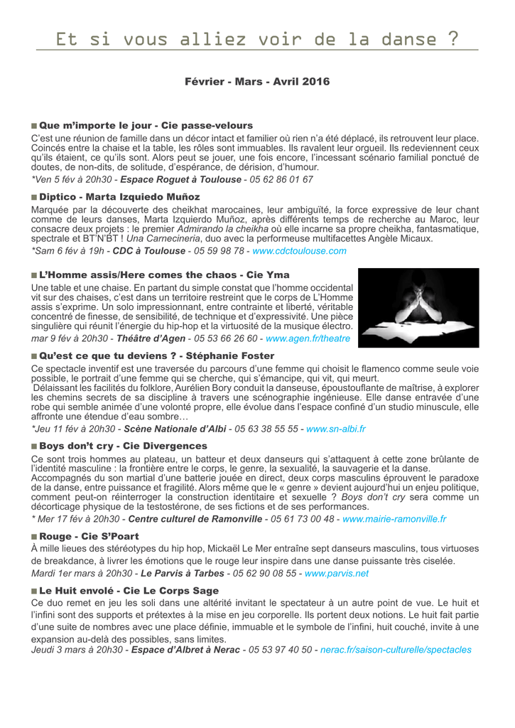 Et si vous alliez voir de la danse ? Février - Mars - Avril 2016 ■ Que m’importe le jour - Cie passe-velours C’est une réunion de famille dans un décor intact et familier où rien n’a été déplacé, ils retrouvent leur place. Coincés entre la chaise et la table, les rôles sont immuables. Ils ravalent leur orgueil. Ils redeviennent ceux qu’ils étaient, ce qu’ils sont. Alors peut se jouer, une fois encore, l’incessant scénario familial ponctué de doutes, de non-dits, de solitude, d’espérance, de dérision, d’humour. *Ven 5 fév à 20h30 - Espace Roguet à Toulouse - 05 62 86 01 67 ■ Diptico - Marta Izquiedo Muñoz Marquée par la découverte des cheikhat marocaines, leur ambiguïté, la force expressive de leur chant comme de leurs danses, Marta Izquierdo Muñoz, après différents temps de recherche au Maroc, leur consacre deux projets : le premier Admirando la cheikha où elle incarne sa propre cheikha, fantasmatique, spectrale et BT’N’BT ! Una Carnecineria, duo avec la performeuse multifacettes Angèle Micaux. *Sam 6 fév à 19h - CDC à Toulouse - 05 59 98 78 - www.cdctoulouse.com ■ L’Homme assis/Here comes the chaos - Cie Yma Une table et une chaise. En partant du simple constat que l’homme occidental vit sur des chaises, c’est dans un territoire restreint que le corps de L’Homme assis s’exprime. Un solo impressionnant, entre contrainte et liberté, véritable concentré de finesse, de sensibilité, de technique et d’expressivité. Une pièce singulière qui réunit l’énergie du hip-hop et la virtuosité de la musique électro. mar 9 fév à 20h30 - Théâtre d’Agen - 05 53 66 26 60 - www.agen.fr/theatre ■ Qu’est ce que tu deviens ? - Stéphanie Foster Ce spectacle inventif est une traversée du parcours d’une femme qui choisit le flamenco comme seule voie possible, le portrait d’une femme qui se cherche, qui s’émancipe, qui vit, qui meurt. Délaissant les facilités du folklore, Aurélien Bory conduit la danseuse, époustouflante de maîtrise, à explorer les chemins secrets de sa discipline à travers une scénographie ingénieuse. Elle danse entravée d’une robe qui semble animée d’une volonté propre, elle évolue dans l’espace confiné d’un studio minuscule, elle affronte une étendue d’eau sombre… *Jeu 11 fév à 20h30 - Scène Nationale d’Albi - 05 63 38 55 55 - www.sn-albi.fr ■ Boys don’t cry - Cie Divergences Ce sont trois hommes au plateau, un batteur et deux danseurs qui s’attaquent à cette zone brûlante de l’identité masculine : la frontière entre le corps, le genre, la sexualité, la sauvagerie et la danse. Accompagnés du son martial d’une batterie jouée en direct, deux corps masculins éprouvent le paradoxe de la danse, entre puissance et fragilité. Alors même que le « genre » devient aujourd’hui un enjeu politique, comment peut-on réinterroger la construction identitaire et sexuelle ? Boys don’t cry sera comme un décorticage physique de la testostérone, de ses fictions et de ses performances. * Mer 17 fév à 20h30 - Centre culturel de Ramonville - 05 61 73 00 48 - www.mairie-ramonville.fr ■ Rouge - Cie S’Poart À mille lieues des stéréotypes du hip hop, Mickaël Le Mer entraîne sept danseurs masculins, tous virtuoses de breakdance, à livrer les émotions que le rouge leur inspire dans une danse puissante très ciselée. Mardi 1er mars à 20h30 - Le Parvis à Tarbes - 05 62 90 08 55 - www.parvis.net ■ Le Huit envolé - Cie Le Corps Sage Ce duo remet en jeu les soli dans une altérité invitant le spectateur à un autre point de vue. Le huit et l’infini sont des supports et prétextes à la mise en jeu corporelle. Ils portent deux notions. Le huit fait partie d’une suite de nombres avec une place définie, immuable et le symbole de l’infini, huit couché, invite à une expansion au-delà des possibles, sans limites. Jeudi 3 mars à 20h30 - Espace d’Albret à Nerac - 05 53 97 40 50 - nerac.fr/saison-culturelle/spectacles ■ De l’enfer au paradis - No gravity Dance Company Six danseurs défient les lois de la gravité dans un prodigieux spectacle visuel inspiré de la Divine Comédie de Dante. C’est une suite stupéfiante de performances qui bouleversent les lois de la physique. Tel un kaléidoscope humain, six danseurs volent dans les airs et créent des figures irréelles, grâce à un stratagème tenu secret. *Mardi 8, mercredi 9 et jeudi 10 mars à 20h30 - Odyssud à Blagnac - 05 61 71 75 15 - www.odyssud.com ■ Legacy - Nadia Beugré Au Ghana, la légende dit qu’au XVIIIe siècle, la reine Pokou sacrifia son fils unique pour sauver son peuple condamné à l’exil. Un siècle plus tard, les amazones du Dahomey défont l’armée française. En Côte d’Ivoire, le pays natal de Nadia Beugré, des ivoiriennes en lutte contre le pouvoir colonial sont passées à tabac et massacrées lors de la Marche de Grand Bassam en 1949... Ces récits occultés ou oubliés parce que les femmes y tenaient le premier rôle inspirent à Nadia Beugré sa première pièce de groupe. *Mercredi 9 et jeudi 10 mars à 20h, vendredi 11 et samedi 12 mars à 20h30 - Théâtre Garonne à Toulouse 05 62 48 54 77 - www.theatregaronne.com ■ Ballet Jazz de Montreal Les Ballets Jazz de Montréal, compagnie de danse de renommée internationale, proposent une danse hybride alliant l’esthétique du ballet classique à plusieurs autres styles de danse. Elle est sexy, explosive, originale, accessible et remarquée par l’excellence de son exécution. Le terme “jazz” dans le nom de la troupe fait davantage référence à du ballet classique mis au goût du jour qu’à un style musical. Cette soirée propose deux chorégraphies : Rouge et Harry. *Jeudi 10 mars à 20h30 - Pole cuturel de Marsan à Mont de Marsan- 05 58 75 30 71 - marsancultures.fr ■ Evolution - Opus 1 - Dadadzo Cie Dans cette traversée des âges et des états tout à tour drôles et émouvants, gra