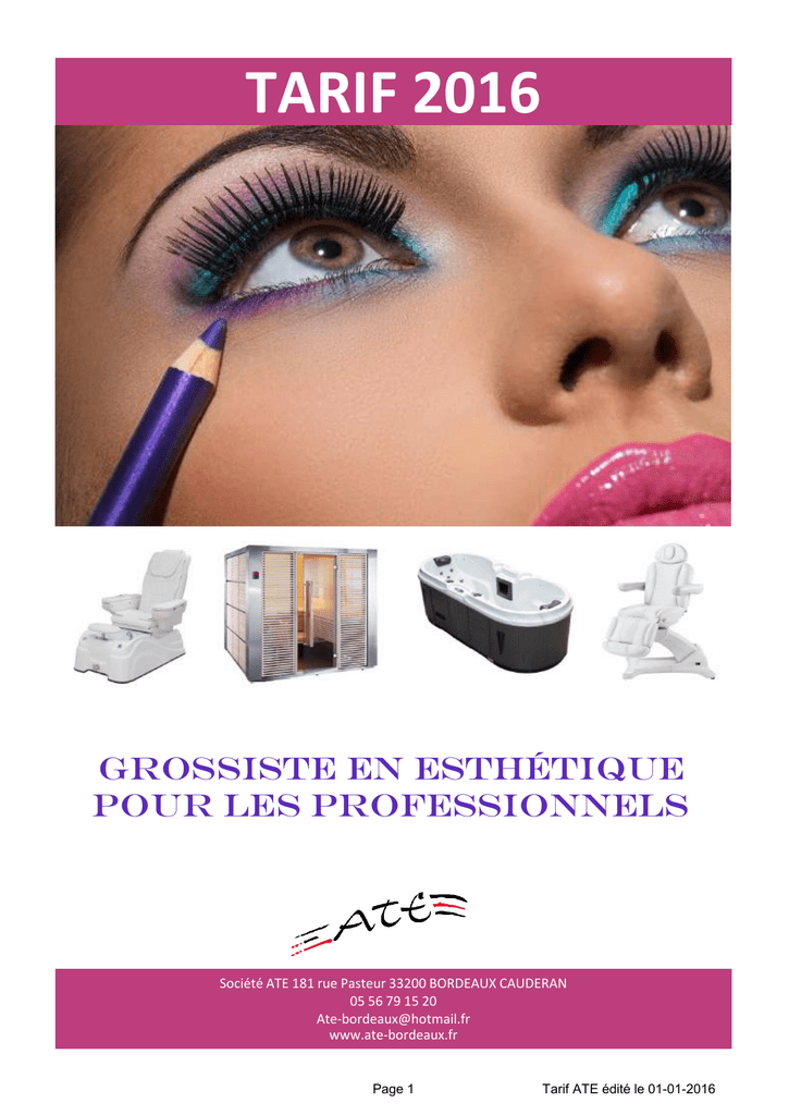 TARIF 2016 Grossiste en esthétique Pour les Professionnels Société ATE 181 rue Pasteur 33200 BORDEAUX CAUDERAN 05 56 79 15 20 [email protected] www.ate-bordeaux.fr Page 1 Tarif ATE édité le 01-01-2016 CONDITIONS GENERALES DE VENTE Les prix des marchandises, objet du présent tarif, s’entendent hors taxe. La facturation sera effectuée TVA en sus. Franco de port à partir de 200 €uros HT, en dessous de cette somme, les frais de transport en vigueur seront appliqués. Mode de règlement Paiement à la commande par CB ou Virement. Règlement directement au magasin : CB. Nos tarifs peuvent être modifiés sans préavis. Commande Une offre ne devient contractuelle et ne constitue une commande définitive qu’après signature du bon de commande avec la mention « Bon pour accord » et le règlement d’un acompte de 30%. Lorsque le versement d’un acompte est convenu à la commande, celle-ci ne devient définitive qu’à réception de cet acompte. Une commande devenue définitive par la confirmation de commande ou par l’acompte versé ne peut être annulée, faute de quoi l’intégralité du prix des marchandises sera facturée à la cliente et immédiatement exigible. Clause de réserve de propriété L’acheteur devient responsable des marchandises dès la livraison de celles-ci. ATE se réserve la propriété des marchandises commandées et livrées jusqu’au jour de leur paiement intégral. L’objet du présent contrat ne deviendra propriété de l’acquéreur qu’après paiement intégral du prix des factures émises en vertu de l’exécution du dit contrat. Jusqu’à cette date, les marchandises et les matériels livrés seront considérés comme consignés et l’acheteur supportera les risques des dommages que ces produits pourraient subir ou occasionner, pour quelque cause que ce soit. Page 2 Tarif ATE édité le 01-01-2016 EPILATION Code Les Appareils Désignation Contenance Prix Base HT 7.1 Chauffe cire 1 bac 4 L FC300 4 litre 340,00 5.2 Appareil à cire visage FF200 200g 168,00 Chauffe pot 800g 52,00 100g 41,00 Chauffe cartouche Modulable 100g 53,00 150.014 Chauffe cartouche Kit Evolution Duo 100g 72,00 15.1 Chauffe cartouche Kit Evolution Trio 100g 111,00 601201 E2CCBG100 Chauffe cartouche Thermostat réglable 12 Les Accessoires 20 Drap d'examen gaufré largeur x 0.50 3,32 17 Drap d'examen gaufré largeur x 0.60 4,40 0525-110BIS Drap examen lisse largeur x 0.50 3,32 0525-120BIS Drap examen lisse largeur x 0.60 4,42 0252-123BIS Drap examen lisse largeur x 0,70 6,88 Bande épilation lisse Sensiness x 250 5,35 Bande épilation lisse Ylas x 250 5,35 bois 9,11 BE-250 18 PASM Spatule inox - manche marron 5513 Spatule inox - manche noir plastique 8,30 5516 Spatule jambe bois brillant 24 cm 3,14 28.1 Spatule jambe cuillère bois brillant 25 cm 6,55 5553 Spatule aisselles bois brillant 25 cm 3,00 35 Spatule aisselles bois brillant 16 cm 5,10 Spatules jetables (petites) x 50 1,14 937 Spatules jetables (moyennes) x 250 6,55 29 Spatules jetables (grandes) x 100 2,00 31 Pince pour pot cire 800g 800g 9,43 23 Collerettes de propreté x 20 2,28 E8CPE50 Collerettes de propreté x 50 5,64 455 Cassolette pour Chauffe Pot 800g 12,00 POT Pot vide à cire 800g 1,10 7410513 Les Produits 180 Huile de massage et post - épilatoire 1 litre 12,75 431 Huile de massage et post - épilatoire 250ml 4,91 Page 3 Tarif ATE édité le 01-01-2016 EPILATION Code Les Produits Désignation Contenance Prix Base HT 42 Gel vert réfrigérant tube 200g 4,37 459 Gel vert réfrigérant pot 400g 10,59 692 Talc pour épilation 600g 7,37 37 Solvant cire au magnolia 1 litre 8,77 650 Solvant cire au magnolia 5 litres 22,58 Les Cires - Basses températures 55 Cire verte recyclable en pastilles 1kg 8,83 57 Cire rose recyclable en pastilles 1kg 8,83 Les Cires - Jetables avec bandes 62 Cire blonde pot 800g 6,46 64 Cire nacrée miel pot 800g 6,60 65 Cire ultra white "Sans Collophane" pot 800g 7,31 774 Cire thé vert "Sans Collophane" pot 800g 7,31 63 Cire verte Azulène pot 800g 6,52 Cire jetable résine Bio pot 800g 7,81 pot 800g 11,72 100g 1,96 Cartouche cire blonde/verte/ultra white/thé vert 100g 1,96 Cartouche Homme (cire bleu) 100g 2,05 Cire Pelable blonde pastilles 1kg 9,39 Cire pelable certifiée Bio pastilles 1 kg 11,40 Cire pelable Calendula BIO pastilles 1kg 10,85 Cire Blanche pastilles 1kg 10,35 Cire pelable blonde pot 800g 7,35 Cire pelable bleue pot 800g 7,38 7479 CIRECHOC Cire au chocolat Choco PIL CARTCHOC Cartouche cire chocolat Choco PIL 7410260 Les Cires - Pelables 634 ND07478 NDBIO 59 CIRPEPOT 49 Page 4 Tarif ATE édité le 01-01-2016 VISAGE Code Les Appareils Désignation Contenance VAPOFACIAL Vapozone facial à poser 7333007 Prix Base HT 103,95 Vapozone Nano Ion Steamer Pink à poser 88,20 196.1 Vapozone sur pied 208,95 200.2 Haute fréquence (malette) HF 1000 - EMA 283,50 Haute fréquence HF 6000 357,00 198 Lucas championnière 320,00 T-01 Chauffe serviettes Warmex 37,5x31x27 158,00 CHAUFSER Chauffe serviettes CB mini 30x30,7x23 303,90 Bocal pour vapozone VAPOTECH en verre 58,00 494 Bocal pour vapozone - L.C 3VS en verre 75,21 581 Lampe ozone pour vapozone BT 199 Godet pour lucas 8,12 412 Mandrin lucas 0,71 461 Entonnoir pour lucas 8,74 209 Electrode Aspi-Tire comédons en verre 17,82 210 Electrode Aspi-Anti rides en verre 19,00 469 Electrode H.F. champignon orange 4cm Gm 15,76 212 Electrode H.F. champignon violet 4cm Gm 13,40 470 Electrode H.F. champignon orange 3cm Mm 14,64 472 Electrode H.F. champignon violet 3cm Mm 12,44 471 Electrode H.F. champignon violet 2cm Pm 9,78 480 Electrode H.F. pointue violet 2cm 11,59 490 Electrode H.F. cou orange 13,42 475 Electrode H.F. cou violet 11,30 473 Electrode H.F. rouleau orange 34,16 474 Electrode H.F. rouleau violet 31,62 227 Electrode H.F. métal Ø 20 mm 11,68 216 Electrode H.F. saturatrice spirale métal Ø 12 mm 18,63 HF 6000 Les Accessoires 494.1 66,00 Page 5 Tarif ATE édité le 01-01-2016 VISAGE Code Désignation Les Huiles Essentielles Con