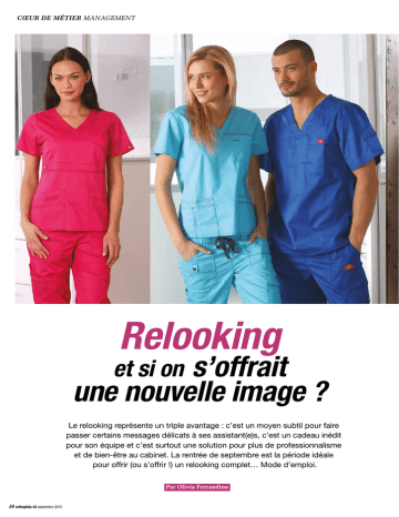 CŒUR DE MÉTIER MANAGEMENT Relooking s’offrait une nouvelle image ? et si on Le relooking représente un triple avantage : c’est un moyen subtil pour faire passer certains messages délicats à ses assistant(e)s, c’est un cadeau inédit pour son équipe et c’est surtout une solution pour plus de professionnalisme et de bien-être au cabinet. La rentrée de septembre est la période idéale pour offrir (ou s’offrir !) un relooking complet… Mode d’emploi. Par Olivia Ferrandino 50 orthophile 43 septembre 2015 MANAGEMENT CŒUR DE MÉTIER F utile le relooking ? Que nenni ! « Contrôler » le look de notre équipe permet rien de moins que contrôler l’image passive que le cabinet envoie à ses patients. Soyons certains que des blouses aux couleurs passées expriment immanquablement une image de lassitude, des blouses tachées ou des vêtements « de ville » un manque d’attention portée à l’hygiène, des couleurs trop vives une impression de surexcitation peu propice à la décontraction… du vert pâle sur un praticien blond au teint clair l’impression d’être malade. Des professionnels peuvent nous aider à éviter les faux pas et à s’assurer de faire une excellente première impression. Savoir ce qui nous va Merci à Olga Taverna Conseillère en image et créatrice d’Alba Conseil pour les images Port. 33 (0)6 26 08 16 34 Tél. 33 (0)3 87 35 73 42 www.albaconseil.fr [email protected] L’habit fait définitivement le moine ! Soigner son apparence envoie des messages parfaitement interprêtés par les patients : tant sur la rigueur, l’asepsie, le sens esthétique et la cohésion d’équipe (ci-dessus, blouses de la collection Mankaïa). Typologie, colorimétrie, maquillage, manucure, communication verbale et non verbale, présentation et comportement : voici le lexique du relooking pour professionnels aujourd’hui. Olga Taverna, ancienne assistante et technico-commerciale pour IvoclarVivadent créatrice d’Alba Conseil s’est appuyée sur ses plus de 30 ans d’expérience dans le domaine du dentaire pour proposer ses services en recrutement et conseil en images. C’est en visitant les cabinets dentaires pendant 20 ans qu’elle a commencé à observer le comportement des assistantes et à imaginer le relooking adapté au dentaire et à l’orthodontie. La séance de relooking qu’elle propose ne dure qu’une (intense) journée durant laquelle hommes et femmes passent par plusieurs étapes indispensables. « Je propose une journée individuelle de conseil en images » explique Olga Taverna, créatrice d’Alba Conseil. Tout d’abord, nous commençons par le coiffeur, ensuite nous passons à la colorimétrie (choix et harmonie des couleurs suivant la typologie selon les quatre saisons). Par exemple, des femmes comme Isabelle Adjani (cheveux noirs, yeux bleus, peau claire) sont « hiver ». Claire Chazal est, elle, « été » (cheveux blonds, yeux bleus, peau claire). L’idée étant de pouvoir trouver les couleurs qui correspondent à la typologie de la personne. Comme le précise Olga Taverna : « instinctivement nous nous habillons dans nos couleurs, mais l’idée, ici, c’est de pouvoir en prendre conscience notamment en faisant référence au cercle chromatique ». Puis, « nous passons à l’étape du maquillage ». Comme en témoigne Vanessa Mangin, assistante dentaire depuis 2006 : « Après tous les conseils qui m’ont été donnés je ne me verrai plus sortir non maquillée, et de façon apprêtée, aujourd’hui. C’est ce qui nous permet d’acquérir notamment un certain bien-être et une réelle confiance en soi. Les retours sont très positifs : mon patron ne m’a pas reconnue avec ma toute nouvelle blouse ! Au final, tout le cabinet a eu droit à sa nouvelle blouse Pastelli : elles sont stylées et dessinent bien la taille. Ça serait à refaire, je le referai ! La séance d’Olga Taverna apprend à l’assistante à adopter un style adapté à son métier, tant en ce qui concerne le maquillage, la coiffure, le look que le comportement ! ». Attentions à l’hygiène ! Comment avoir des mains soignées suivant les règles (ongles courts et sans vernis) ? Comment s’attacher les cheveux d’une façon appropriée et rapide ? Ce sont les questions auxquelles permet de répondre Olga Taverna. Elle rappelle tout d’abord qu’« il faut porter des bijoux propres et adaptés selon les règles d’hygiène, choisir des chaussures spécifiques au cabinet, donner une impression d’hygiène globale dans orthophile 43 septembre 2015 51 CŒUR DE MÉTIER MANAGEMENT Avant / Après Vanessa, 43 ans, assistante dentaire à Metz Avant Après « Une coupe de cheveux qui dégage son visage, des couleurs parfaitement adaptées à sa carnation et quelques conseils de mise en beauté ont suffi à donner à Vanessa une assurance qui donne confiance au premier coup d’œil. » sa présentation pour rassurer le patient ». Elle enseigne notamment aux assistantes dentaires à se maquiller mais aussi à s’attacher les cheveux en leur apprenant des coiffures « faciles à reproduire ». Par exemple, pour le maquillage : « Je peux leur apprendre à agrandir le regard ou comment mettre un eye-liner, poursuit Olga Taverna. » Dernière étape esthétique : savoir comment se limer les ongles pour avoir des mains impeccables sans braver l’interdit du vernis, proscrit. Même chose pour tout ce qui est vêtements, chaussures et bijoux. Olga Taverna précise qu’« il faut que les assistantes donnent l’impression qu’elles portent des chaussures spécifiques pour travailler… et qui ne sortent pas du cabinet. Il ne s’agit pas d’être maniaque pour autant, mais la négligence de ces 52 orthophile 43 septembre 2015 détails peut questionner le patient sur l’hygiène générale du cabinet. » La tenue adéquate véhicule un message fort de l’attention portée par le cabinet à la fois à l’asepsie et à l’esthétique. « Une image vaut mi