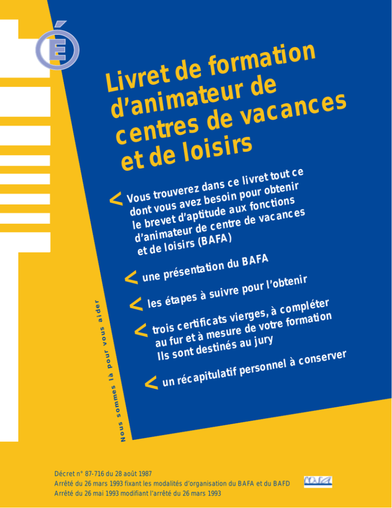 n o i t a m r o f e d t Livre teur de d’anima de vacances centres sirs i o l e d t e ce ret tout v i l e c ns erez da n pour obtenir v u o r t s < Vdoount vous a’vaepztibtuedseoiaux fonacctiaonncses v td le breve ur de centre de te d’anima rs (BAFA) isi et de lo AFA ion du B t a t n e s une pré ’obtenir l r u o p vre es à sui p a t é s le mpléter o c à , s rge n cats vie votre formatio i f i t r e c e trois esure d y m à t e r r au fu és au ju n i t s e d Ils sont nserver o c à l e nn tif perso a l u t i p a un réc < Nous so ur là po mmes vous aider < < < Décret n° 87-716 du 28 août 1987 Arrêté du 26 mars 1993 fixant les modalités d’organisation du BAFA et du BAFD Arrêté du 26 mai 1993 modifiant l’arrêté du 26 mars 1993 BAFAV3_9850_baf 21/06/02 9:56 Page 2 Qu’est-ce que le BAFA ? Le BAFA, c’est le brevet d’aptitude aux fonctions d’animateur. Ce n’est pas un diplôme professionnel, mais il est nécessaire pour encadrer, de façon occasionnelle, des enfants et adolescents dans des centres de vacances et de loisirs (CVL). Au cours de votre formation, vous allez apprendre : • à organiser la vie collective et la vie quotidienne des enfants et des adolescents (rythmes de vie, règles de sécurité…) ; • à mettre en œuvre un projet pédagogique au sein d’une équipe ; • à concevoir et à organiser des activités d’animation… QUI PEUT S’INSCRIRE ? Vous devez avoir au moins 17 ans au premier jour de la formation. COMMENT S’INSCRIRE ? Vous devez vous adresser à la direction départementale de la Jeunesse et des Sports (DDJS) du département dans lequel vous résidez. Elle vous remettra une liste des organismes habilités qui assurent une formation théorique du BAFA. Vous trouverez la liste des DDJS sur internet en consultant le site www.jeunesse-sports.gouv.fr Vous transmettez à la DDJS de votre département 2 enveloppes timbrées à vos nom et adresse, une photographie récente et la photocopie de votre carte nationale d’identité. Les sessions théoriques de formation, d’appronfondissement et de qualification sont assurées par des organismes privés sous le contrôle du ministère de la Jeunesse et des Sports. Elles sont payantes. Renseignez-vous auprès de votre caisse d’allocations familiales (CAF) et de votre direction départementale de la Jeunesse et des Sports (DDJS). Ces organismes vous indiqueront si vous remplissez les conditions pour obtenir une aide financière. COMMENT SUIVRE LA FORMATION ? La formation au BAFA comporte 3 étapes qui doivent se dérouler obligatoirement dans l’ordre suivant : • session théorique de formation générale ; • stage pratique ; • session théorique d’approfondissement ou de qualification. Vous avez 30 mois pour effectuer les 3 étapes de votre formation à partir de la date du premier jour de la session de formation générale. Une fois ce délai dépassé, vous perdez le bénéfice des sessions et stages que vous avez suivis. Vous vous inscrivez directement à la session théorique de formation générale auprès de l’un des organismes figurant sur la liste qui vous a été remise par la direction départementale de la Jeunesse et des Sports (DDJS). Pour pouvoir effectuer le stage pratique, vous devez : • avoir obtenu, de la part du directeur de la session théorique de formation générale, une appréciation satisfaisante sur votre aptitude à encadrer des mineurs ; • avoir fait valider ce certificat par la DDJS du département où a eu lieu la session. 2 BAFAV3_9850_baf 21/06/02 9:56 Page 3 Important : vous devez effectuer votre stage pratique dans les 18 mois qui suivent votre session théorique de formation générale. Si, pour une raison de force majeure, vous ne pouvez pas l’effectuer dans ce délai, vous pouvez demander une dérogation à la DDJS. Vous devez faire cette demande par écrit et un mois au moins avant l’expiration des 18 mois. Une fois que vous avez effectué votre stage pratique, vous pouvez vous inscrire à une session de qualification ou d’approfondissement. Renseignez-vous auprès de la DDJS de votre département. COMMENT SE DÉROULE LA FORMATION ? Session théorique de formation générale C’est la formation de base. Elle dure 8 jours, consécutifs ou non, en internat ou en externat. Lorsque vous avez terminé cette session et obtenu une appréciation satisfaisante, vous êtes considéré comme animateur stagiaire. Vous pouvez alors effectuer votre stage pratique. Stage pratique en qualité d’animateur stagiaire Il dure au minimum 14 jours : • soit dans un centre de vacances déclaré. Vous pouvez fractionner les 14 jours de stage en 2 séjours au maximum ; • soit dans un centre de loisirs habilité. Session de qualification ou d’approfondissement • Session d’approfondissement Elle vous permet d’approfondir vos connaissances sur un public ou une activité d’animation (par exemple : petite enfance, théâtre, jeux de pleine nature…). Elle permet aussi de faire le bilan du stage pratique. Elle dure au minimum 6 jours. • Session de qualification Si vous possédez une compétence technique (canoë-kayak, voile…), cette session vous permet de la confirmer et de la faire reconnaître dans le domaine de l’animation. Elle dure au minimum 8 jours. Si votre niveau technique est jugé insuffisant en fin de session, vous obtiendrez à la place le certificat d’une session d’approfondissement. COMMENT OBTENIR LE DIPLÔME ? Vous devez adresser vos certificats validés à la direction de la Jeunesse et des Sports de votre département de résidence. Elle les soumet au jury départemental du BAFA, qui délibère sur votre dossier et propose que vous soyez reçu, ajourné ou refusé. Renseignez-vous auprès d’elle sur les dates de délibération du jury. Vous êtes reçu vous êtes diplômé du BAFA. Vous êtes ajourné vous avez un délai d’un an pour recommencer les sessions ou le stage jugés insuffisants par le jur