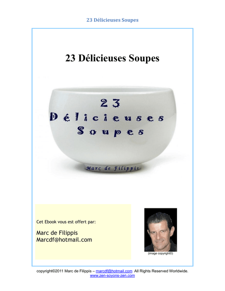 23 Délicieuses Soupes 23 Délicieuses Soupes Cet Ebook vous est offert par: Marc de Filippis [email protected] (image copyright©) copyright©2011 Marc de Filippis – [email protected] All Rights Reserved Worldwide. www.zen-soyons-zen.com 23 Délicieuses Soupes Table des Matières 1. Soupe aux Légumes……………………………………………………………………………………………3 2. Soupe de Poireaux au lait……………………………………………………………………………….…3 3. Soupe de Poireaux aux Pommes de terre……………………………………………………………3 4. Soupe à l'Oseille. ………………………………………………………………………………………………3 5. Soupe au Pourpier à l'Oseille. ……………………………………………………………………………4 6. Soupe aux Herbes. ……………………………………………………………………………………………4 7. Soupe à l'Oseille à la Crème. …………………………………………………………………………….4 8. Soupe à l'Oseille au Vermicelle. ………………………………………………………………………..4 9. Soupe d'Orties blanches au lait…………………………………………………………………………4 10. Soupe à l'Oignon. …………………………………………………………………………………………….4 11. Soupe à l'Oignon au Lait. ……………………………………………………………………………….…5 12. Soupe à l'Oignon au Fromage. ……………………………………………………………………….…5 13. Soupe à l'Oignon au Gratin. ……………………………………………………………………………..5 14. Soupe à l'Oignon et Pommes de terre. ………………………………………………………………5 15. Soupe à l'Oignon au Macaroni. …………………………………………………………………………5 16. Soupe à l'Oignon aux Haricots blancs. ………………………………………………………………5 17. Soupe à l'Oignon aux Lentilles. …………………………………………………………………………5 18. Soupe à l'Oignon au Riz ou au Vermicelle. …………………………………………………………6 19. Soupe aux Choux maigre. …………………………………………………………………………………6 20. Soupe aux petits Navets glaces. ……………………………………………………………………….6 21. Panade au Beurre. ……………………………………………………………………………………………6 22. Panade au Lait. ………………………………………………………………………………………………..6 23. Panade a la Crème aigre. …………………………………………………………………………………7 copyright©2011 Marc de Filippis – [email protected] All Rights Reserved Worldwide. www.zen-soyons-zen.com 23 Délicieuses Soupes 1. Soupe aux Légumes. Choisissez des légumes bien frais tels que carottes, navets, poireaux, oignons, et quelques feuilles de choux, coupez tous ces légumes de la même grosseur, pas trop gros cependant, mettez un bon morceau de beurre dans une casserole ainsi que vos légumes, faites-leur prendre couleur en les remuant avec une cuiller de bois; lorsqu'ils sont un peu colores, couvrez-les avec de l'eau, un peu de sel, faites cuire a couvert de manière que l'arome des légumes soit concentre; lorsque les légumes sont cuits, ajoutez-y du bouillon de légumes si vous en avez, ou de l'eau si vous n'en avez pas; goutez si la soupe est bonne, mettez quelques tranches de pain a potage dans la soupière et servez. 2. Soupe de Poireaux au lait. Prenez une dizaine de poireaux épluchés, nettoyez-les, les ciseler en rondelles, les mettre dans une casserole avec un bon morceau de beurre pour les faire revenir d'une belle couleur blonde; mouillez-les avec moitie eau et lait, y mettre du sel et un peu de poivre; faites bouillir jusqu'a cuisson terminée; goutez si la soupe est de bon gout et servez. 3. Soupe de Poireaux aux Pommes de terre. Coupez en rondelles quelques pommes de terre que vous ajoutez aux poireaux après cuisson; passez les poireaux et les pommes de terre dans une passoire après les avoir égouttés; avec la cuisson, mouillez votre purée en la délayant; ajoutez un peu de lait et d'eau si elle était par trop épaisse et servez. 4. Soupe à l'Oseille. Epluchez, lavez une bonne poignée d'oseille, ciselez-la un peu; mettez un bon morceau de beurre dans une casserole sur le feu, ajoutez-y votre oseille, tournez-la quelques minutes, le temps de la laisser fondre, ajoutez-y un peu de farine, tournez le tout ensemble deux ou trois minutes; mouillez votre soupe avec de l'eau, la saler de bon gout; coupez de petites rondelles dans un pain a potage que vous mettez dans la soupière; trempez en y ajoutant une petite liaison de deux ou trois jaunes délayés avec un peu de crème ou de lait; servez. copyright©2011 Marc de Filippis – [email protected] All Rights Reserved Worldwide. www.zen-soyons-zen.com 23 Délicieuses Soupes 5. Soupe au Pourpier à l'Oseille. Prenez une poignée de pourpier et d'oseille que vous lavez a grande eau après l'avoir épluchée; la ciseler et la mettre dans une casserole avec un bon morceau de beurre; mettez sur le feu et tournez avec une cuiller de bois pendant quelques minutes, ajoutez-y un peu de farine en remuant; mouillez votre soupe avec de l'eau, la saler; au premier bouillon, retirez-la sur le coin du feu; taillez quelques rondelles de pain que vous mettrez dans la soupière, versez votre soupe dessus et servez; comme la précédente, elle peut avoir une