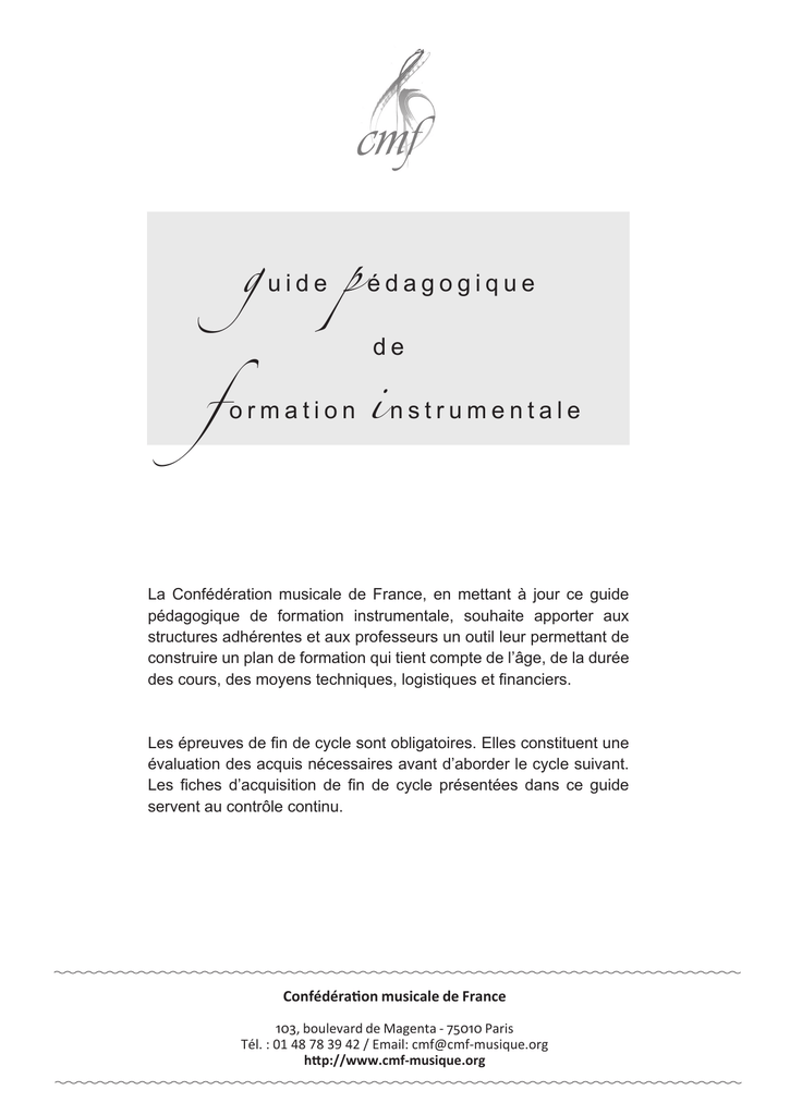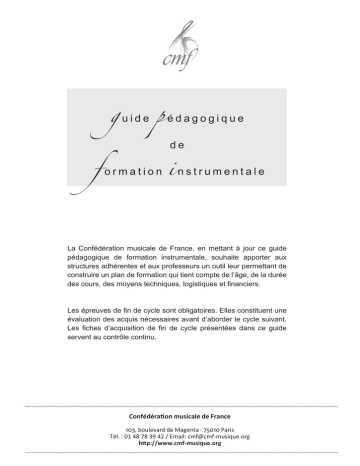 g uide p édagogique de f ormation i nstrumentale La Confédération musicale de France, en mettant à jour ce guide pédagogique de formation instrumentale, souhaite apporter aux structures adhérentes et aux professeurs un outil leur permettant de construire un plan de formation qui tient compte de l’âge, de la durée des cours, des moyens techniques, logistiques et financiers. Les épreuves de fin de cycle sont obligatoires. Elles constituent une évaluation des acquis nécessaires avant d’aborder le cycle suivant. Les fiches d’acquisition de fin de cycle présentées dans ce guide servent au contrôle continu. Confédéra)on musicale de France !"#, boulevard de Magenta ‐ 45"!" Paris Tél. : 01 48 78 39 42 / Email: cmf@cmf‐musique.org h4p://www.cmf‐musique.org Formation instrumentale Cursus Le cursus de la C.M.F permet à chacun d’évoluer à sa vitesse dans un cadre défini, en 3 cycles. Les cycles sont préconisés en plusieurs niveaux. Cependant, c’est le niveau à atteindre pour passer dans le cycle suivant qui est important. L’élève peut ainsi, selon son rythme, atteindre ce niveau en 3, 4 ou 5 ans voire 6 ans. Les niveaux sont indiqués A, B et C. Chaque école peut choisir ses appellations à l’intérieur des cycles en fonction de son organisation. La Confédération Musicale de France propose un réservoir de cinq œuvres par niveau, permettant au professeur de choisir des morceaux pour les contrôles ou les auditions de fin d'année adaptés à la progression de l'élève, ou d'élargir sa connaissance du répertoire. Ils ont pour but d'offrir aux écoles de musique et aux professeurs des œuvres adaptées à leur pédagogie et modulable en fonction de l'évolution plus ou moins rapide de chaque élève. Des contrôles à l'intérieur des cycles peuvent se faire par audition ou examen. Les réservoirs seront renouvelés chaque année à 1/5ème. Le morceau qui figure en haut de la liste en grisé est le nouveau morceau de l'année. Un morceau reste imposé pour les fins de cycle, seuls examens préconisés par la Confédération Musicale de France. Notations Afin de se rapprocher de la notation utilisée dans l'éducation nationale, les examens sont tous notés sur 20, avec le passage à 10. Les appréciations sont: De 1 à 5,9 : très insuffisant; de 6 à 9,9 : insuffisant; de 10 à 12,9 : assez bien ; de 13 à 15,9: bien; de 16 à 20 : très bien (avec félicitations du jury à partir de 18). Diplôme de fin de cycle Pour obtenir les diplômes de fin de cycle, les élèves devront justifier des Unités de valeur (UV) suivantes: - UV instrumentale : 10/20 (y compris avec l'épreuve d'autonomie) - UV de formation musicale : 10/20 - UV de déchiffrage : 10/20 - UV de pratique collective régulière ou de musique de chambre : attestation du directeur musical ou 10/20 ACCORDEON FICHE D’ACQUISITIONS DE FIN DE CYCLE SERVANT AU CONTROLE CONTINU 1er CYCLE POSTURE : - Position du corps tenue de l'instrument et de l'instrumentiste - main droite (poignet) main gauche réglage des courroies (main droite/gauche) TECHNIQUE : - maîtrise du soufflet attaques et terminaison des sons changement de direction du soufflet Articulation Touché : - legato - détaché - staccato Doigtés - main droite main gauche indépendance et synchronisation des 2 mains MUSICALITE : Respect du texte - notes phrasé nuances compréhension du texte tempo articulations connaissance de la gamme de la tonalité principale du morceau joué ENGAGEMENT MUSICAL : - pratique collective (musique de chambre, orchestre, chœur…) l'élève propose des pièces qu'il a envie de jouer Suivant l’évolution de l’élève, le professeur peut établir un tableau de notations éventuellement daté - concernant chaque paramètre. ACCORDEON FICHE D’ACQUISITIONS DE FIN DE CYCLE SERVANT AU CONTROLE CONTINU 2ème CYCLE POSTURE : (approfondissement des acquis du 1er cycle) - - Position du corps tenue de l'instrument et de l'instrumentiste main droite (poignet) main gauche réglage des courroies (main droite/gauche) TECHNIQUE : (approfondissement des acquis du 1er cycle) - Maîtrise du soufflet Connaissance et application des techniques liées au souffle (bollow-shake, ricochet, vibrato) Attaques et terminaison des sons Changement de direction du soufflet Articulation Touché : - legato - détaché - staccato - louré - tenu Autres articulations Doigtés - main droite main gauche indépendance et synchronisation des 2 mains respect du tempo (régularité) Notion à aborder Connaissance et application des techniques contemporaines (percussion, distorsion, etc.) MUSICALITE : (approfondissement des acquis du 1er cycle) Respect du texte - notes phrasé nuances compréhension du texte tempi articulations - compréhension de l'époque utilisation des résonances utilisation des registres connaissance des gammes utilisées dans les œuvres jouées ENGAGEMENT MUSICAL : - pratique collective (musique de chambre, orchestre, …) participation à des stages, des concerts, des auditions, des rencontres, des échanges, des pratiques collectives… aller aux concerts et /ou aux spectacles vivants implication dans la vie de l'établissement l'élève propose des pièces qu'il a envie de jouer Suivant l’évolution de l’élève, le professeur peut établir un tableau de notations éventuellement daté - concernant chaque paramètre. ACCORDEON FICHE D’ACQUISITIONS DE FIN DE CYCLE SERVANT AU CONTROLE CONTINU 3ème CYCLE POSTURE : (approfondissement des acquis du 1er et du 2ème cycle) - Position du corps tenue de l'instrument et de l'instrumentiste - main droite (poignet) main gauche TECHNIQUE : (approfondissement des acquis du 1er et du 2ème cycle) - maîtrise du soufflet connaissance et application des techniques liées au souffle (bollow-shake, ricochet, vibrato) attaques et terminaison des sons changement de direction du soufflet Articulation Touché : - legato - détaché - staccato - louré - tenu Autres articula