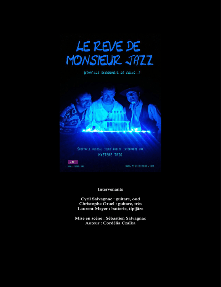 Intervenants Cyril Salvagnac : guitare, oud Christophe Gruel : guitare, très Laurent Meyer : batterie, tipijâze Mise en scène : Sébastien Salvagnac Auteur : Cordélia Czaïka Le rêve de Monsieur Jazz Le savant et musicologue Monsieur Jazz cherche depuis des années, sans succès, l’essence même du Jazz. Dans son laboratoire, aidé de ses deux assistants, Mr Swing et Mr World, il tente jour après jour de trouver pourquoi cette musique n’est pas comme les autres. Les échecs l’ont rendu aigri et très irritable. De plus il s’est mis à détester toutes les musiques. Après de nombreuses expériences sans résultats il a décidé d’aller à la rencontre de l’histoire du Jazz. Tous les moyens sont bons, retours dans le temps, potions magiques, hypnose…. Au fur et à mesure des expériences et grâce au concours de ses assistants il va s’apercevoir que la solution ne peut pas venir de potions ou autre solutions magiques mais bien de soi et de son pouvoir à imaginer et à créer. Libéré de toutes contraintes il va pouvoir enfin exprimer son amour de la musique. Servi par les musiciens de MYSTERE TRIO pratiquant depuis 15 ans un jazz métissé entre swing manouche et musiques du monde, ce spectacle à la mise en scène vivante mettra en valeur le voyage de la musique par la découverte d’instruments aux sonorités dépaysantes. Les morceaux choisis sont issus du dernier album live de MYSTERE TRIO « Restons scène ». Découpage du spectacle en 3 parties : 1ère partie : la naissance du swing 2ème partie : le voyage du jazz et le métissage des cultures 3ème partie : La liberté d'imaginer, de créer en jazz Cyril Salvagnac Né le 13/06/1973, il pratique son instrument en autodidacte depuis l'âge de 9 ans, il joue et compose pour plusieurs groupes, développe des projets musicaux pour la jeunesse au sein de la mairie de Toulouse et a travaillé également pour la compagnie Figaro & Co (Grease, Hair). Il écrit aussi des musique pour la comédie musicale et le théâtre (Le tueur au nez rouge en 2006, Casting de Rennes en 2011 et Le son et lumière de Foix «Histoire d’Oc » en 2012. A la fin des années 90, il tombe sous le charme du jazz manouche, omniprésent dans son jeu depuis. Avec MYSTERE TRIO, il pratique également le oud. Il est également compositeur dans le groupe Anagallis (chanson swing pop) qui sort un premier album « au début » en février 2012 et participe au groupe Romanova quintet qui revisite et modernise le répertoire de Django Reinhardt. Christophe Gruel Né le 06/01/1962, il démarre la guitare en autodidacte à l’âge de 15 ans, bercé par la musique de Yes, Led Zeppelin, Pink Floyd et autres groupes des années 70. Il créé le groupe de rock progressif CASTLE JAM dans lequel il évolue de 1980 à 1987. En 1993, il monte son premier trio, ASHOK CHAKRA, sur les pas de Django Reinhardt. Parallèlement, en 1995, il fait une tournée qui s’achève à l’OLYMPIA, avec le chanteur Joël PREVOST. En collaboration avec Cyril en 1998 il développe des projets musicaux pour la jeunesse au sein de la mairie de Toulouse et a travaillé également pour la compagnie Figaro & Co (Grease, Hair). Il compose au sein de MYSTERE TRIO et joue également du tres. Il accompagne depuis 2 ans les « rencontres internationales du cirque de demain » à Paris et à Montréal durant un mois en Février 2013 Laurent Meyer Né le 27/09/1971, il démarre la batterie à l’âge de 8 ans. Interprète et arrangeur rythmique de talent dans diverses formations funk, jazz, il joue également avec la Cie Figaro & Co, accompagnant des acteurs dans de nombreuses comédies musicales (Les Misérables, L’incroyable Noël de Monsieur Jack, Grease, Hair). En 1998, il obtient un 1er prix à l’unanimité de l’école de batterie Dante Agostini où il a enseigné pendant 6 ans. Dans son jeu souvent atypique on retrouve de nombreuses influences venant à la fois du latin jazz et de l’afro jazz avec une grande maîtrise du swing et des techniques aux balais. Il développe son jeu de percussionniste avec MYSTERE TRIO (cajon, derbouka et Tipijâze). Il fait partie également des groupes Anagallis (chanson swing pop) et Romanova quintet (modern gypsy jazz) et a collaboré sur la musique du son et lumières de la ville de Foix « Histoires d’Oc » en 2012. Mystère Trio : « Le rêve de Mr Jazz » Sébastien Salvagnac Il débute sur scène en tant que chanteur dans différents groupes de Jazz. C’est en 1993 qu'il intègre l’école professionnelle de Théâtre Musical, Figaro and Co pour deux ans d’apprentissage. Par la suite il rentre dans la Compagnie avec laquelle il aborde jusqu’en 1999 les grands classiques de la comédie musicale et du théâtre avec des premiers rôles dans, « West Side Story », « La vie Parisienne », « Le Bourgeois Gentilhomme », « Les Misérables », « Hair »…Puis il rencontre la Compagnie du Quatre avec laquelle il enchaîne plusieurs tournées avec les spectacles Enchantement, Tréteaux à la Campagne et ZappingPong. En 2003 il est metteur en scène et comédien de la pièce The Red Nose Killer présentée au festival du printemps du Rire à Toulouse. En 2004 il réalise la mise en chanson du Spectacle Zapping-Pong pour la Compagnie du Quatre. Après avoir terminé la mise en scène d' «Adam et Juliette», il s'attaque à un tout autre monde avec la coordination artistique du parc Astérix, ou il apprend à gérer d'importantes équipes. Il a dans ce cadre l'occasion de travailler avec Jean-Claude Cotillard. Cette expérience lui permettra de mettre en scène des évènementiels d’envergures internationales dans de grandes salles comme le Zénith à Toulouse ou de faire la mise de spectacles historiques comme « La lune Ecarlate » avec Damien Fontaine, «Histoire d’Oc : la légende des âmes cathares » dans le cadre du son et lumière de Foix. Aujourd'hui après avoir pris le temps de concrétiser des projets plus person