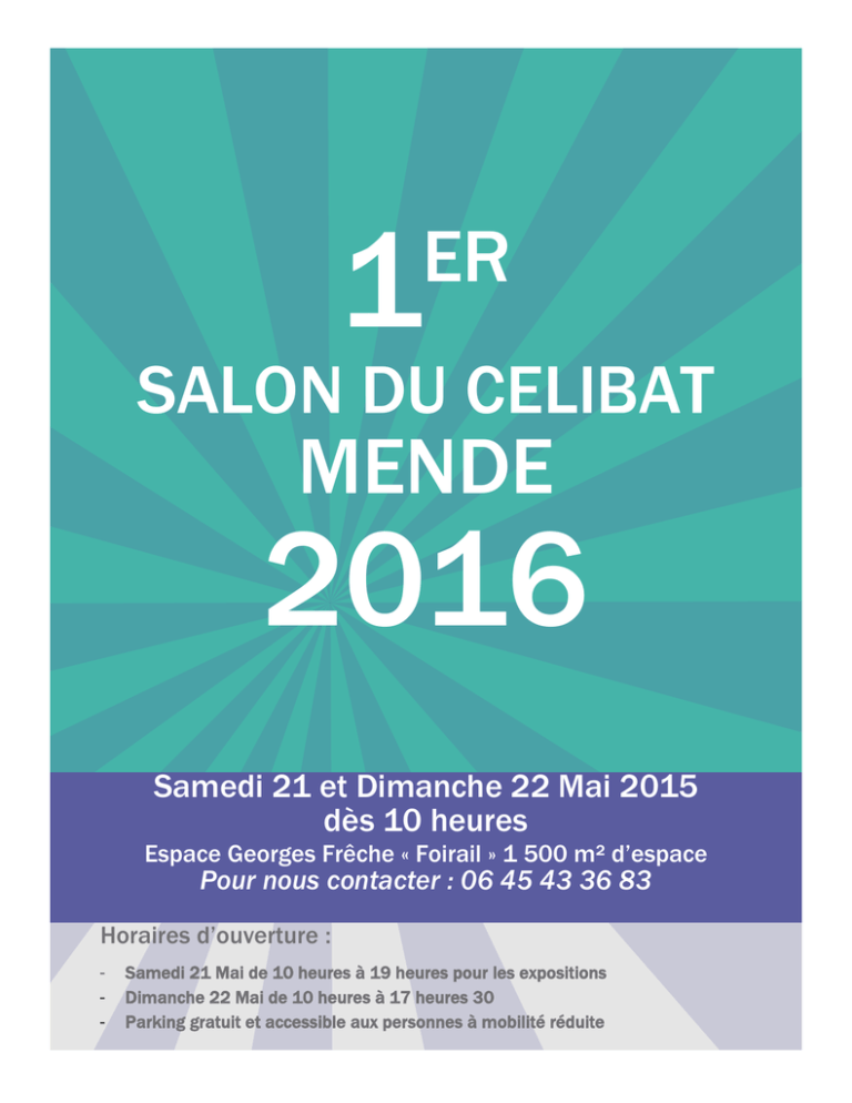 1 ER SALON DU CELIBAT MENDE 2016 Samedi 21 et Dimanche 22 Mai 2015 dès 10 heures Espace Georges Frêche « Foirail » 1 500 m² d’espace Pour nous contacter : 06 45 43 36 83 Horaires d’ouverture : - Samedi 21 Mai de 10 heures à 19 heures pour les expositions Dimanche 22 Mai de 10 heures à 17 heures 30 Parking gratuit et accessible aux personnes à mobilité réduite 1ER SALON DU CELIBAT A NE RATER SOUS AUCUN PRETEXTE PLUS DE 30 EXPOSANTS ET 1 000 VISITEURS ATTENDUS NOMBREUX EVENEMENTS ! (SPEED DATING, SOIREE DANSANTE, DINER SPECTACLE) C’est parti pour le premier salon du célibat à Mende ! Samedi 21 et Dimanche 22 Mai 2016 : deux jours inoubliables dans le très chic espace « Georges-Frêche » situé à la place du Foirail 48 000 Mende. Deux jours durant lesquels le salon espère accueillir plus de 1 000 visiteurs, et 30 exposants. Ce premier salon du célibat organisé par le site de rencontre « la marieuse du village » est pour l’exposant, une occasion de développer sa clientèle. C’est également la possibilité pour les célibataires de se faire accompagner dans la recherche de l’âme sœur. « Conseil », « ateliers et conférences », « Speed dating », « diner rencontre », « soirée dansante », « karaoké spécial célibataires », mini-concert avec le sosie professionnel de Johnny Halliday et plein d’autres surprises attendent les visiteurs de ce premier salon du célibat. Un moment festif à ne rater sous aucun prétexte. N’oubliez pas ! Pour éviter la concurrence, il n’y aura qu’une à deux places par domaine d’activité. En conséquence, seuls les premiers qui auront envoyé leur dossier et payé leur réservation seront retenus. Frais de dossier offert pour les réservations réalisées avant le 15 Février 2016. CONFERENCES ET ANIMATIONS GRATUITES OU PAYANTES SPECTABLE AVEC LE SOSIE DE JOHNNY HALLIDAY ORGANISE PAR LA MARIEUSE DU VILLAGE Site de rencontre à vocation matrimoniale Les raisons d’exposer à cette foire Pour le professionnel, c’est la possibilité de développer sa clientèle ou de vendre ses produits à des personnes plus réceptives. Vous êtes professionnel ? Ce salon est pour vous, l’occasion de : - Rencontrer votre public en direct Vendre vos produits sur place - Proposer vos services sur les lieux. Profitez-en pour remplir votre agenda pour l’année ! Mettez vos compétences au service de ceux qui en ont besoin et qui viendront dans ce salon pour vous rencontrer : - Coaching (séduction, sportif, image, relation sentimentale) Tourisme (agence de voyage de groupe pour célibataires) Beauté (coiffure, esthétique, maquillage, bijoux, vêtements, lingerie sexy et féminine, accessoires de mode, tatouage, sex-toys, etc.) Bien-être (sophrologue, diététicien (ne), sexologue, massage) Gastronomie (traiteurs à domicile, restauration sur place) Activités de loisirs et rencontres (association loisirs pour célibataires, site de rencontre) Voyance (voyance) Devenir exposant au salon du célibat 2016 Pour devenir exposant, il suffit de télécharger le dossier d’inscription, le remplir et le renvoyer accompagné d’un chèque correspondant au prix du stand au plus tard le 15 Février 2016. Pour ceux qui n’ont pas la possibilité de faire un chèque, il est possible de faire un virement sur notre compte bancaire. Envoyer le dossier avant la date limite, c’est l’assurance de : - Participer au salon Choisir son emplacement dans sa rangée Figurer en tête de la liste des exposants au salon du célibat Figurer dans le catalogue des exposants qui sera distribué aux invités Les tarifs pour exposer à Mende (la TVA n’est pas appliquée article 293B CGI) 6 m² : 100 € pour 2 jours 9 m² : 150 € pour 2 jours 15 m² : 200 € pour 2 jours (cet espace sera accordé en fonction de l’activité) 30 m² : 300 € pour 2 jours (uniquement pour le traiteur qui le souhaite) - En option : Conférence 10 € les 30 minutes Stand de : 6 m², de 9 m² ou 15 m² : A la disposition de l’exposant 1 espace nu (pas de cloison) 1 nettoyage par une femme de ménage Parution dans la brochure remise aux visiteurs (1 000 exemplaires) Des chaises peuvent être mises gratuitement à la disposition des exposants. Pour un restaurateur, la cuisine est mise gratuitement à sa disposition. Conseils Pour les exposants ayant de la marchandise à vendre (vêtements, parfums, bijoux, maquillage, lingeries féminines, soin etc.), il est conseillé d’opter pour un stand de 9 m². A savoir : un exposant ne peut proposer sur son stand, un produit ou service qui n’aura pas été validé par l’organisateur du salon. De même, il ne peut partager son stand avec une autre marque de la même branche d’activité dans le seul but de réduire les coûts d’exposition. Pièces à produire pour exposer - Nom et prénom Dénomination sociale et siège sociale de l’entreprise Qualité de l’exposant Pièce d’identité (numéro, autorité, date et lieu de délivrance) Numéro de KBIS ou déclaration CFE Que peut-on faire en tant qu’exposant Proposer sur place des prestations payantes, animer un atelier gratuit ou payant sans oublier de prendre des rendez-vous pour des prestations futures à domicile ou au magasin. - Coiffeur (se) à domicile - Massage (bien-être) - Esthéticienne (maquillage, maquillage permanent, onglerie, sourcils, etc.) - Voyance (savoir son avenir) - Tatouage Donner une conférence pour expliquer les tenants et aboutissants de votre activité, animer un atelier gratuit ou payant et par là même, prendre des rendez-vous pour des prestations futures - Sophrologue - Diététicienne - Coach (en image, en relation sentimentale, en séduction, en développement personnel, sportif) Vendre ses produits sur place et éventuellement donner une conférence pour recruter des vendeurs à domicile indépendants - Lingerie féminine (possibilité de faire un show) - Bijoux (possibilité de faire un atelier de fabrication de bijoux)