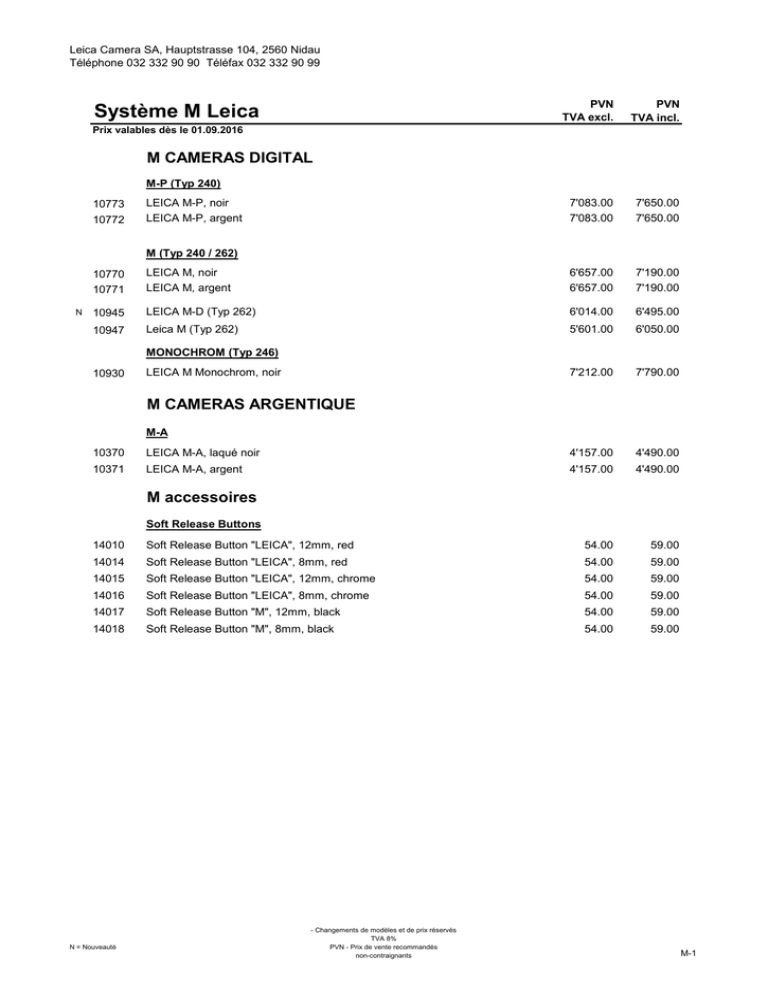 Leica Camera SA, Hauptstrasse 104, 2560 Nidau Téléphone 032 332 90 90 Téléfax 032 332 90 99 Système M Leica PVN TVA excl. PVN TVA incl. 7'083.00 7'083.00 7'650.00 7'650.00 Prix valables dès le 01.09.2016 M CAMERAS DIGITAL M-P (Typ 240) 10773 10772 LEICA M-P, noir LEICA M-P, argent M (Typ 240 / 262) N 10770 10771 LEICA M, noir LEICA M, argent 6'657.00 6'657.00 7'190.00 7'190.00 10945 LEICA M-D (Typ 262) 6'014.00 6'495.00 10947 Leica M (Typ 262) 5'601.00 6'050.00 7'212.00 7'790.00 MONOCHROM (Typ 246) 10930 LEICA M Monochrom, noir M CAMERAS ARGENTIQUE M-A 10370 LEICA M-A, laqué noir 4'157.00 4'490.00 10371 LEICA M-A, argent 4'157.00 4'490.00 M accessoires Soft Release Buttons 14010 Soft Release Button "LEICA", 12mm, red 54.00 59.00 14014 Soft Release Button "LEICA", 8mm, red 54.00 59.00 14015 Soft Release Button "LEICA", 12mm, chrome 54.00 59.00 14016 Soft Release Button "LEICA", 8mm, chrome 54.00 59.00 14017 Soft Release Button "M", 12mm, black 54.00 59.00 14018 Soft Release Button "M", 8mm, black 54.00 59.00 N = Nouveauté - Changements de modèles et de prix réservés TVA 8% PVN - Prix de vente recommandés non-contraignants M-1 Leica Camera SA, Hauptstrasse 104, 2560 Nidau Téléphone 032 332 90 90 Téléfax 032 332 90 99 Système M Leica PVN TVA excl. PVN TVA incl. Prix valables dès le 01.09.2016 M OBJECTIFS N N N N Filtre 11649 LEICA SUPER-ELMAR-M ASPH. 1:3,8/ 18mm 2'847.00 3'075.00 11626 11642 TRI-ELMAR-M ASPH SET TRI-ELMAR-M ASPH incl. Viseur 4,0/ 16-18-21mm E67 4,0/16-18-21mm E67 4'888.00 5'546.00 5'280.00 5'990.00 11647 11145 SUMMILUX-M ASPH. ELMAR-M ASPH. noir anodisé 1:1,4/ 21mm 1:3,4/ 21mm Serie VIII E46 6'842.00 2'648.00 7'390.00 2'860.00 11601 11648 SUMMILUX-M noir anodisé ELMAR-M ASPH. noir anodisé 1:1,4/ 24mm 1:3,8/ 24mm Serie VIII E46 6'750.00 2'351.00 7'290.00 2'540.00 11668 11672 11677 SUMMILUX-M noir anodisé SUMMICRON-M ASPH. noir ELMARIT-M ASPH. Noir 1:1,4/ 28mm 1:2,0/ 28mm 1:2,8/ 28mm E 49 E 46 E 39 5'805.00 3'870.00 2'120.00 6'270.00 4'180.00 2'290.00 11673 11674 SUMMICRON-M ASPH. noir SUMMICRON-M ASPH. argent 1:2,0/ 35mm 1:2,0/ 35mm E 39 E 39 2'902.00 3'046.00 3'135.00 3'290.00 11663 11675 SUMMILUX-M ASPH. noir SUMMILUX-M ASPH. argent 1:1,4/ 35mm 1:1,4/ 35mm E 46 E 46 4'620.00 4'837.00 4'990.00 5'225.00 11602 11667 NOCTILUX-M ASPH noir anodisé NOCTILUX-M ASPH argent 1:0,95/ 50mm 1:0,95/ 50mm E 60 E 60 10'083.00 10'083.00 10'890.00 10'890.00 11891 11892 SUMMILUX-M ASPH. noir SUMMILUX-M ASPH. argent 1:1,4/ 50mm 1:1,4/ 50mm E 46 E 46 3'601.00 3'787.00 3'890.00 4'090.00 11141 11142 11826 APO SUMMICRON-M ASPH noir APO SUMMICRON-M ASPH argent SUMMICRON-M noir 1:2,0/ 50mm 1:2,0/ 50mm 1:2,0/ 50mm E 39 E 39 E 39 7'212.00 7'402.00 2'087.00 7'790.00 7'995.00 2'255.00 11637 APO SUMMICRON-M ASPH. noir 1:2.0/ 75mm E 49 3'509.00 3'790.00 11884 APO-SUMMICRON-M ASPH. noir 1:2,0/ 90mm E 55 3'870.00 4'180.00 11629 MACRO-SET avec MACRO-ELMAR-M 1:4/90mm 1:4,0/ 90mm noir, Adapteur Macro-M, Viseur d'angle M E 39 3'666.00 3'960.00 11670 MACRO-ELMAR-M 3'106.00 3'355.00 14652 MACRO-ADAPTER-M (nur für M Typ 240) 611.00 660.00 11889 APO-TELYT-M noir 1:4,0/ 90mm 1:3,4/ 135 mm E 49 3'509.00 3'790.00 1:2,4/ 35mm 1:2,4/ 35mm 1:2,4/ 50mm 1:2,4/ 50mm 1:2,4/ 75mm 1:2,4/ 75mm 1:2,4/ 90mm 1:2,4/ 90mm E 39 E 39 E 39 E 39 E 46 E 46 E 46 E 46 1'884.00 1'986.00 1'629.00 1'731.00 1'782.00 1'842.00 1'986.00 2'087.00 2'035.00 2'145.00 1'760.00 1'870.00 1'925.00 1'990.00 2'145.00 2'255.00 366.00 396.00 OBJECTIFS SUMMARIT avec Pare-soleil 11671 11679 11680 11681 11682 11683 11684 11685 LEICA SUMMARIT-M 1:2,4/35 mm ASPH., noir LEICA SUMMARIT-M 1:2,4/35 mm ASPH., argent LEICA SUMMARIT-M 1:2,4/50 mm, noir LEICA SUMMARIT-M 1:2,4/50 mm, argent LEICA SUMMARIT-M 1:2,4/75 mm, noir LEICA SUMMARIT-M 1:2,4/75 mm, argent LEICA SUMMARIT-M 1:2,4/90mm, noir LEICA SUMMARIT-M 1:2,4/90 mm, argent 14642 Adaptateur R, noir N = Nouveauté - Changements de modèles et de prix réservés TVA 8% PVN - Prix de vente recommandés non-contraignants M-2 Leica Camera SA, Hauptstrasse 104, 2560 Nidau Téléphone 032 332 90 90 Téléfax 032 332 90 99 Système M Leica PVN TVA excl. PVN TVA incl. 106.00 217.00 217.00 217.00 217.00 246.00 393.00 39.00 72.00 115.00 235.00 235.00 235.00 235.00 266.00 425.00 43.00 78.00 Prix valables dès le 01.09.2016 Trépieds et Têtes à rotule 14100 14108 14109 14110 14112 14113 14114 14115 14116 Petit Trépied de table Tête à rotule 18, petite, argent (pour trépied de table) Tête à rotule 18, petite, noir (pour trépied de table) Tête à rotule 18, grande, argent (pour trépied de table) Tête à rotule 18, grande, noir (pour trépied de table) Tête à rotule 24, noir (pour trépied de voyage) Tête à rotule 38, noir (pour trépied de voyage) Set de 3 plateaux de changement pour tête à rotule 24/38mm Sac de transport, cordura (pour trépied de voyage) Sacs Photo Leica N 14455 Courroie de port confort, noir 137.00 149.00 18746 Sacoche système, taille S, nylon, noir 183.00 198.00 18748 18761 Sacoche système, taille M, nylon, noir Sacoche système, taille S, cuir, gris 254.00 305.00 275.00 330.00 14867 Sac en néoprène, court compartiment avant, noir 65.00 71.00 14868 Sac en néoprène, avec partie avant longue, noir 65.00 71.00 18844 Sac Système en Coton, taille M, gris 415.00 449.00 14892 Sac Système Oberwerth pour Leica M, T, X et Q 1'019.00 1'100.00 N = Nouveauté - Changements de modèles et de prix réservés TVA 8% PVN - Prix de vente recommandés non-contraignants M-3 Leica Camera SA, Hauptstrasse 104, 2560 Nidau Téléphone 032 332 90 90 Téléfax 032 332 90 99 Système M Leica PVN TVA excl. PVN TVA incl. Prix valables dès le 01.09.2016 M ACCESSOIRES (Typ 240) 14499 14494 18753 14498 14634 Accu Chargeur Viseur électronique visoflex (EVF2 pour M et X) Set d'adaptateurs SCA pour poignée multifonction Set adaptateur-microphone 126.00 103.00 416.00 341.00 193.00 137.00 112.00 450.00 369.00 209.00 14675 Film de protection display LEICA M (Typ 240/246) 17.00 19.00 14496 14495