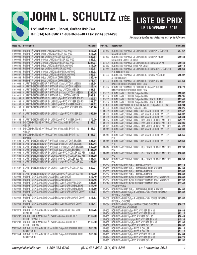JOHN L. SCHULTZ LTÉE. 1723 55ième Ave., Dorval, Québec H9P 2W3 Tél: (514) 631-5502 • 1-800-363-6240 • Fax: (514) 631-6298 LISTE DE PRIX LE 1 NOVEMBRE, 2015 Remplace toutes les listes de prix précédentes. Pièce No. Description Prix Liste Part No. 1100-001 1100-002 1100-005 1100-006 1100-009 1100-502 1100-505 1100-506 1100-507 1100-803 1100-804 1101-003 1101-004 1101-005 1101-009 1101-011 1101-103 1101-104 1101-105 1101-106 $17.76 $17.76 $29.61 $42.33 $224.07 $17.76 $29.61 $42.33 $55.91 $46.49 $73.17 $23.34 $29.44 $41.31 $266.54 $593.91 $25.93 $31.37 $41.62 $56.96 1102-453 ROBINET DE VIDANGE DE CHAUDIÈRE 1/2po PEX D’ÉQUERRE QUART DE TOUR 1102-473 ROBINET DE VIDANGE DE CHAUDIÈRE 1/2po PEX F1960 D’ÉQUERRE QUART DE TOUR 1102-504 ROBINET DE VIDANGE DE CHAUDIÈRE 3/4po CELCON M 1102-653 ROBINET DE VIDANGE 1/2po PEX DROIT 1102-744 ROBINET DE VIDANGE DE CHAUDIÈRE 3/4po CORPS D’ÉQUERRE POIGN NOIR VRAC 1102-903 ROBINET DE VIDANGE DE CHAUDIÈRE 1/2po M A/ÉCROU AUTOBLOQUANT 1102-993 ROBINET DE VIDANGE DE CHAUDIÈRE 1/2po POUSSERRACCORDER CORPS D’ÉQUERRE QUA 1102-994 ROBINET DE VIDANGE DE CHAUDIÈRE 3/4po POUSSERRACCORDER CORPS D’ÉQUERRE QUA 1103-003 ROBINET À BEC COURBE 1/2po LAITON 1103-004 ROBINET À BEC COURBE 3/4po LAITON 1103-053 ROBINET À BEC COURBE 1/2po LAITON QUART DE TOUR 1103-054 ROBINET À BEC COURBE 3/4po LAITON QUART DE TOUR 1103-190 ROBINET D’ÉVIER DE CUISINE INDIVIDUEL 1/2po SORTIE LISSE 1103-203 ROBINET D’ARROSAGE 1/2po CELCON 1104-551 ROBINET À L’ÉPREUVE DU GEL 4po QUART DE TOUR ANTI SIPH 1104-553 ROBINET À L’ÉPREUVE DU GEL 6po QUART DE TOUR ANTI SIPH 1104-555 ROBINET À L’ÉPREUVE DU GEL 8po QUART DE TOUR ANTI SIPH 1104-557 ROBINET À L’ÉPREUVE DU GEL 10po QUART DE TOUR ANTI SIPH 1104-559 ROBINET À L’ÉPREUVE DU GEL 12po QUART DE TOUR ANTI SIPH 1104-561 ROBINET À L’ÉPREUVE DU GEL 14po QUART DE TOUR ANTI SIPH 1104-711 ROBINET À L’ÉPREUVE DU GEL 4po QUART DE TOUR ANTI SIPH PEX 1104-713 ROBINET À L’ÉPREUVE DU GEL 6po QUART DE TOUR ANTI SIPH PEX 1104-715 ROBINET À L’ÉPREUVE DU GEL 8po QUART DE TOUR ANTI SIPH PEX 1104-717 ROBINET À L’ÉPREUVE DU GEL 10po QUART DE TOUR ANTI SIPH PEX 1104-719 ROBINET À L’ÉPREUVE DU GEL 12po QUART DE TOUR ANTI SIPH PEX 1104-721 ROBINET À L’ÉPREUVE DU GEL 14po QUART DE TOUR ANTI SIPH PEX 1105-004 ROBINET D’ARRÊT 3/4po LAITON À VISSER 1105-203 ROBINET D’ARRÊT 1/2po LAITON D’ÉQUERRE À VISSER 1105-503 ROBINET D’ARRÊT 1/2po LAITON À BRASER 1105-504 ROBINET D’ARRÊT 3/4po LAITON À BRASER 1105-603 ROBINET D’ARRÊT A/BOUCHON DE VIDANGE 1/2po À BRASER 1105-604 ROBINET D’ARRÊT A/BOUCHON DE VIDANGE 3/4po À BRASER 1105-614 ROBINET D’ARRÊT A/BOUCHON DE VIDANGE 3/4po COMPRESSION 1105-704 ROBINET D’ARRÊT 3/4po LAITON D’ÉQUERRE À BRASER 1107-001 ROBINET À BILLE 1/4po À VISSER LAITON FORGÉ PASSAGE INTÉGRAL CHROMÉ 1107-002 ROBINET À BILLE 3/8po À VISSER LAITON FORGÉ PASSAGE INTÉGRAL CHROMÉ 1107-034 ROBINET À BILLE 3/4po LAITON FORGÉ CHROMÉ À COMPRESSION A/VIDANGE 1107-103 ROBINET À BILLE 1/2po PVC À VISSER SCH 80 1107-104 ROBINET À BILLE 3/4po PVC À VISSER SCH 80 1107-105 ROBINET À BILLE 1po PVC À VISSER SCH 80 1107-106 ROBINET À BILLE 1-1/4po PVC À VISSER SCH 80 1107-107 ROBINET À BILLE 1-1/2po PVC À VISSER SCH 80 1107-108 ROBINET À BILLE 2po PVC À VISSER SCH 80 1107-123 ROBINET À BILLE 1/2po PVCC À COLLER 1107-124 ROBINET À BILLE 3/4po PVCC À COLLER 1107-133 ROBINET À BILLE 1/2po PVC À VISSER SCH 40 1107-134 ROBINET À BILLE 3/4po PVC À VISSER SCH 40 1107-135 ROBINET À BILLE 1po PVC À VISSER SCH 40 1101-107 1101-108 1101-413 1101-414 1101-493 1101-503 1101-504 1101-506 1101-508 1101-603 1101-604 1101-605 1101-606 1101-607 1101-608 1102-003 1102-004 1102-033 1102-043 1102-044 1102-053 1102-054 1102-063 1102-073 1102-207 1102-208 1102-353 1102-354 ROBINET À VANNE 1/4po LAITON À VISSER 200 WOG ROBINET À VANNE 3/8po LAITON À VISSER 200 WOG ROBINET À VANNE 1po LAITON À VISSER 200 WOG ROBINET À VANNE 1-1/4po LAITON À VISSER 200 WOG ROBINET À VANNE 2-1/2po LAITON À VISSER 200 WOG ROBINET À VANNE 3/8po LAITON À BRASER 200 WOG ROBINET À VANNE 1po LAITON À BRASER 200 WOG ROBINET À VANNE 1-1/4po LAITON À BRASER 200 WOG ROBINET À VANNE 1-1/2po LAITON À BRASER 200 WOG ROBINET À VANNE 1/2po LAITON À COMPRESSION ROBINET À VANNE 3/4po LAITON À COMPRESSION CLAPET DE NON-RETOUR À BATTANT 1/2po LAITON À VISSER CLAPET DE NON-RETOUR À BATTANT 3/4po LAITON À VISSER CLAPET DE NON-RETOUR À BATTANT 1po LAITON À VISSER CLAPET DE NON-RETOUR À BATTANT 2-1/2po LAITON À VISSER CLAPET DE NON-RETOUR À BATTANT 4po LAITON À VISSER CLAPET DE NON-RETOUR EN LIGNE 1/2po PVC À VISSER 200 PSI CLAPET DE NON-RETOUR EN LIGNE 3/4po PVC À VISSER 200 PSI CLAPET DE NON-RETOUR EN LIGNE 1po PVC À VISSER 200 PSI CLAPET DE NON-RETOUR EN LIGNE 1-1/4po PVC À VISSER 200 PSI CLAPET DE NON-RETOUR EN LIGNE 1-1/2po PVC À VISSER 200 PSI CLAPET DE NON-RETOUR EN LIGNE 2po PVC À VISSER 200 PSI DISCONNECTEURS ANTIPOLLUTION 1/2po AVEC ÉVENT - À VISSER DISCONNECTEURS ANTIPOLLUTION 3/4po AVEC ÉVENT - À VISSER DISCONNECTEURS ANTIPOLLUTION 1/2po AVEC ÉVENT - À BRASER CLAPET DE NON-RETOUR À BATTANT 1/2po LAITON À BRASER CLAPET DE NON-RETOUR À BATTANT 3/4po LAITON À BRASER CLAPET DE NON-RETOUR À BATTANT 1-1/4po LAITON À BRASER CLAPET DE NON-RETOUR À BATTANT 2po LAITON À BRASER CLAPET DE NON-RETOUR EN LIGNE 1/2po PVC À COLLER 200 PSI CLAPET DE NON-RETOUR EN LIGNE 3/4po PVC À COLLER 200 PSI CLAPET DE NON-RETOUR EN LIGNE 1po PVC À COLLER 200 PSI CLAPET DE NON-RETOUR EN LIGNE 1-1/4po PVC À COLLER 200 PSI CLAPET DE NON-RETOUR EN LIGNE 1-1/2po PVC À COLLER 200 PSI CLAPET DE NON-RETOUR EN LIGNE 2po PVC À COLLER 200 PSI ROBINET DE VIDANGE DE CHAUDIÈRE 1/2po DROIT ROBINET DE VIDANGE DE CHAUDIÈRE 3/4po DROIT ROBINET DE VIDANGE DE CHAUDIÈRE 1/2po À COMPRESSION ROBINET DE VIDANGE DE CHAUDIÈRE 1/2po CORPS D’ÉQUERRE ROBINET DE VIDANGE DE CHAU