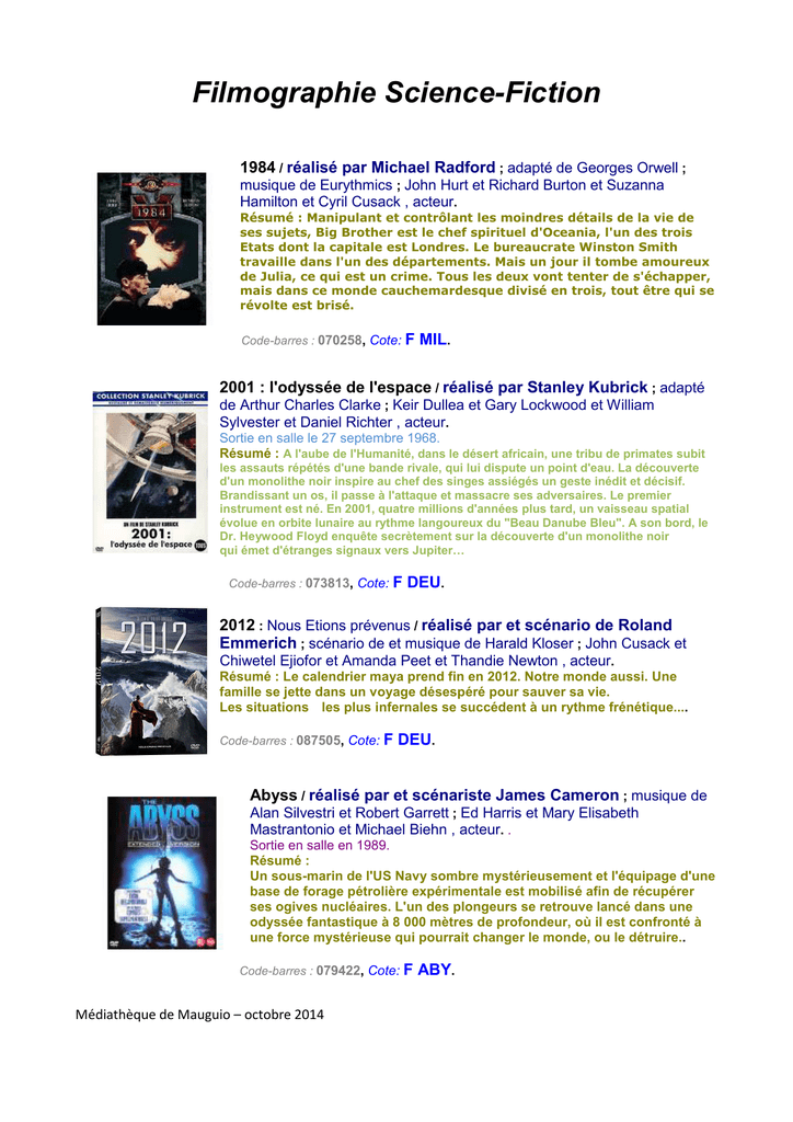 Filmographie Science-Fiction 1984 / réalisé par Michael Radford ; adapté de Georges Orwell ; musique de Eurythmics ; John Hurt et Richard Burton et Suzanna Hamilton et Cyril Cusack , acteur. Résumé : Manipulant et contrôlant les moindres détails de la vie de ses sujets, Big Brother est le chef spirituel d'Oceania, l'un des trois Etats dont la capitale est Londres. Le bureaucrate Winston Smith travaille dans l'un des départements. Mais un jour il tombe amoureux de Julia, ce qui est un crime. Tous les deux vont tenter de s'échapper, mais dans ce monde cauchemardesque divisé en trois, tout être qui se révolte est brisé. Code-barres : 070258, Cote: F MIL. 2001 : l'odyssée de l'espace / réalisé par Stanley Kubrick ; adapté de Arthur Charles Clarke ; Keir Dullea et Gary Lockwood et William Sylvester et Daniel Richter , acteur. Sortie en salle le 27 septembre 1968. Résumé : A l'aube de l'Humanité, dans le désert africain, une tribu de primates subit les assauts répétés d'une bande rivale, qui lui dispute un point d'eau. La découverte d'un monolithe noir inspire au chef des singes assiégés un geste inédit et décisif. Brandissant un os, il passe à l'attaque et massacre ses adversaires. Le premier instrument est né. En 2001, quatre millions d'années plus tard, un vaisseau spatial évolue en orbite lunaire au rythme langoureux du "Beau Danube Bleu". A son bord, le Dr. Heywood Floyd enquête secrètement sur la découverte d'un monolithe noir qui émet d'étranges signaux vers Jupiter… Code-barres : 073813, Cote: F DEU. 2012 : Nous Etions prévenus / réalisé par et scénario de Roland Emmerich ; scénario de et musique de Harald Kloser ; John Cusack et Chiwetel Ejiofor et Amanda Peet et Thandie Newton , acteur. Résumé : Le calendrier maya prend fin en 2012. Notre monde aussi. Une famille se jette dans un voyage désespéré pour sauver sa vie. Les situations les plus infernales se succédent à un rythme frénétique.... Code-barres : 087505, Cote: F DEU. Abyss / réalisé par et scénariste James Cameron ; musique de Alan Silvestri et Robert Garrett ; Ed Harris et Mary Elisabeth Mastrantonio et Michael Biehn , acteur. . Sortie en salle en 1989. Résumé : Un sous-marin de l'US Navy sombre mystérieusement et l'équipage d'une base de forage pétrolière expérimentale est mobilisé afin de récupérer ses ogives nucléaires. L'un des plongeurs se retrouve lancé dans une odyssée fantastique à 8 000 mètres de profondeur, où il est confronté à une force mystérieuse qui pourrait changer le monde, ou le détruire.. Code-barres : 079422, Cote: Médiathèque de Mauguio – octobre 2014 F ABY. Action mutante / réalisé par et scénariste Alex de la Iglesia ; Alex Angulo et Frederique Feder et Antonio Resines , acteur. Résumé : 2012. Crétins et beaux gosses dominent le monde. Seuls les handicapés du groupe Action Mutante luttent pour en finir avec la société qui les marginalise. Décidés à frapper un grand coup, leur leader enlève la fille du millionnaire Orujo et réclame une rançon qui devra lui être remise sur la planète Axturias... Film lauréat de trois Goyas en 1993.. Code-barres : 078936, Cote: F ACT. L'Agence / réalisé par et scénario de George Nolfi ; Matt Damon et Emily Blunt et Michael Kelly , acteur ; musique de Thomas Newman. Sortie en salle en 2010. Résumé : Sommes-nous maîtres de notre destin ? Ou sommes-nous manipulés par des forces invisibles ? David Norris entrevoit l'avenir que le sort lui réserve et se rend compte qu'il aspire à une autre vie que celle qui lui a été tracée. Pour y parvenir, il va devoir poursuivre la femme, dont il est tombé follement amoureux, à travers les rues de New York et ses réseaux souterrains.... Code-barres : 094089, Cote: F AGE. A.I. Intelligence artificielle / réalisé par et scénario de Steven Spielberg ; adapté de Brian Adliss ; musique de John Williams ; Haley Joel Osment et Jude Law et Frances O'Connor et Brendan Gleeson , acteur. Résumé : Dans un XXIe siècle, où la fonte des glaces a submergé la majorité des terres habitables et provoqué famines et exodes, les robots sont devenus une composante essentielle de la vie quotidienne et assurent désormais la plupart des tâches domestiques. Code-barres : 073064, Cote: F A.I. A la croisée des mondes : La boussole d'or / réalisé par et scénariste Chris Weitz ; adapté de Philip Pullman ; musique de Alexandre Desplat ; Nicole Kidman et Dakota Blue Richards et Daniel Craig et Sam Elliott , acteur. Résumé : Lyra, 12 ans, est une orpheline rebelle qui vit à l'Université d'Oxford, dans un monde parallèle qui ressemble au nôtre mais qui a évolué de façon un peu différente. L'organisme gouvernemental global, le Magisterium, fait enlever des enfants pour de sombres expériences. Lorsque Roger, le meilleur ami de Lyra, disparaît à son tour, la petite fille jure d'aller le chercher, jusqu'au bout du monde s'il le faut.... Code-barres : 081557, Cote: Médiathèque de Mauguio – octobre 2014 F CRO. Alien : le 8ième passager / réalisé par Ridley Scott ; scénario de Dan O'Bannon et Ronald Shusett ; musique de Jerry Goldsmith ; Tom Skerrit et Sigourney Weaver et Véronica Cartwright et Harry Dean Stanton et John Hurt et Ian Holm et Yaphet Kotto , acteur. Sortie en salle en 1979. Résumé : Le vaisseau commercial Nostromo et son équipage, sept hommes et femmes, rentrent sur Terre avec une importante cargaison de minerai. Mais lors d'un arrêt forcé sur une planète déserte, l'officier Kane se fait agresser par une forme de vie inconnue, une arachnide qui étouffe son visage… Code-barres : 064065, Cote: F ALI. Les âmes vagabondes / réalisé par et scénariste Andrew Niccol ; adapté de Stephenie Meyer ; Saoirse Ronan et Diane Kruger et Max Irons et Jake Abel , acteur. Sortie en salle en 2013. Résumé : Dans le futur, une race d'extraterrestres pacifiques, les Ames, ont pris le contrôle de la Terre. La plupart des hu