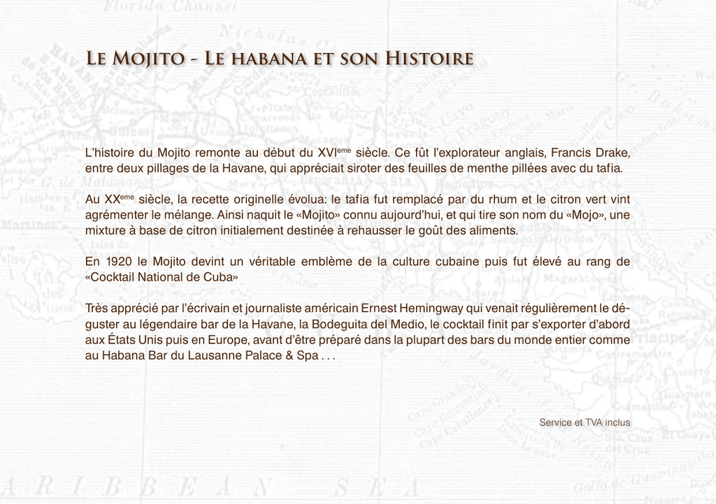 Le Mojito - Le habana et son Histoire L’histoire du Mojito remonte au début du XVIeme siècle. Ce fût l’explorateur anglais, Francis Drake, entre deux pillages de la Havane, qui appréciait siroter des feuilles de menthe pillées avec du tafia. Au XXeme siècle, la recette originelle évolua: le tafia fut remplacé par du rhum et le citron vert vint agrémenter le mélange. Ainsi naquit le «Mojito» connu aujourd’hui, et qui tire son nom du «Mojo», une mixture à base de citron initialement destinée à rehausser le goût des aliments. En 1920 le Mojito devint un véritable emblème de la culture cubaine puis fut élevé au rang de «Cocktail National de Cuba» Très apprécié par l’écrivain et journaliste américain Ernest Hemingway qui venait régulièrement le déguster au légendaire bar de la Havane, la Bodeguita del Medio, le cocktail finit par s’exporter d’abord aux États Unis puis en Europe, avant d’être préparé dans la plupart des bars du monde entier comme au Habana Bar du Lausanne Palace & Spa . . . Service et TVA inclus Les Champagnes Chf Chf 75cl 75cl Les Blancs: 1dl Pommery Brut «Apanage» 21.- 130.- Taittinger Brut «Réserve» 21.- 130.- Moet & Chandon «Nectar Impérial» 22.- 145.- les grandes cuvées Bruno Paillard «Première Cuvée» 130.- Dom Perignon 2003 450.- Moet & chandon Brut Impérial 135.- Krug «Grande Cuvée» 540.- 145.- Louis Roederer Cristal 2005 580.- Veuve Clicquot Brut Louis Roederer Brut Premier 145.- Laurent Perrier «Cuvée Grand Siècle» 280.- Les Rosés: Pommery Apanage Rosé Amour de Deutz «Blanc de Blanc» 2005 280.- 22.- 150.- Moet & Chandon Brut Imperial Rosé 165.Veuve Clicquot Rosé 210.- Laurent Perrier Rosé 205.- Dom Pérignon Rosé Millésimé 19981250.Service et TVA inclus A p é r i Les Vermouths & Amers Chf Martini Rouge Martini Rosé Martini Blanc Noilly Prat Suze Dubonnet Cynar Campari 12.12.12.12.12.12.12.12.- 15% Vol. 4 cl 15% Vol. 4 cl 15% Vol. 4 cl 18% Vol. 4 cl 20% Vol. 4 cl 16% Vol. 5 cl 16.5% Vol. 5 cl 23% Vol. 5 cl Les anisés Pastis 51 Ricard Pernod Pastis Bardouin Absinthe t i f s Les Portos Chf Sandeman Rouge et Blanc 19.5% Vol. 4 cl 13.Taylor’s 10 ans 20% Vol. 4 cl 16.- Taylor’s 20 ans 20% Vol. 4 cl 18.- Dom Rozés 40 ans 20% Vol. 4 cl 30.- Niepoort 2007 20% Vol. 4 cl 18.- Les Sherries Tio Pepe 15% Vol. Dry sack 19.5% Vol. 4 cl 13.- 40% Vol. 4 cl 12.- P.L. Michel Couvreur 20% Vol. 4 cl 18.- 45% Vol. 4 cl 14.- Bristol Harvey’s cream 17.5% Vol. 4 cl 16.- 45% Vol. 4 cl 12.45% Vol. 4 cl 12.- 4 cl 13.- 53% Vol. 4 cl 14.Service et TVA inclus Les Vodkas Les Gins Chf Chf Absolut 40% Vol. 4 cl 18.- Tanqueray 47.3% Vol. 4 cl 19.- Stolichnaya 40% Vol. 4 cl 19.- Whitley Neill 42% Vol. 4 cl 19.- Absolut Level 40% Vol. 4 cl 20.- Caorunn 41.8% Vol. 4 cl 19.- Moskovskaya 40% Vol. 4 cl 20.- Tanqueray Ten 47.3% Vol. 4 cl 20.- Grey Goose 40% Vol. 4 cl 20.- Bombay Sapphire 40% Vol. 4 cl 20.- Smirnoff Black 40% Vol. 4 cl 20.- Hendrick’s 41.4% Vol. 4 cl 20.- Belvedere 40% Vol. 4 cl 20.- Monkey 47 47% Vol. 4 cl 28.- Stolichnaya Elit 40% Vol. 4 cl 28.- Service et TVA inclus Les Rhums Les Cachacas Chf Bacardi Blanco (Porto Rico) 37.5% Vol. 4 cl 18.- Havana Club 3 ans (Cuba) 40% Vol. 4 cl 18.- Chf Cachaça Armazem Viera Turmalina 40% Vol. 4 cl 20.- Cachaça Pitû Brésil 40% Vol. 4 cl 18.- Havana Club 7 ans (Cuba) 40% Vol. 4 cl 22.Pampero Anniversario 40% Vol. 4 cl 20.- Les Tequilas (Vénézuela) José Cuervo Silver 38% Vol. 4 cl 18.- (Trinidad) José Cuervo Reposado 38% Vol. 4 cl 19.- Clément Agricole (Martinique)40% Vol. 4 cl 25.- Patron Silver 100% Agave 40% Vol. 4 cl 30.- Zacapa 23 ans (Guatemala) 40% Vol. 4 cl 26.- Patron X O Café 35% Vol. 4 cl 30.- Riviéra du Mât (Réunion) Aha Toro Reposado 40% Vol. 4 cl 32.- Angostura 1919, 8ans 40% Vol. 4 cl 22.- 40% Vol. 4 cl 35.- Chantal Comte (Guadeloupe) 45% Vol. 4 cl 75.- Aha Toro Anejo 100% Agave40% Vol. 4 cl 39.- Service et TVA inclus L e s W h i s k i e s e c o s s a i s Les Singles Malts Blends: Chf Famous Grouse 40% Vol. 4 cl 18.- J&B Rare 40% Vol. 4 cl 18.- J. Walker Red 40% Vol. 4 cl 18.- Les Lowlands: Chf Glenkinchie 10 ans 43% Vol. 4 cl 22.- Rosebank 1991 55.7% Vol. 4 cl 48.- Les Islands : Blends Deluxe: Talisker 10 ans Isle of Skye 45.8% Vol. 4 cl 22.Chivas Regal 40% Vol. 4 cl 22.- Talisker 18 ans Isle of Skye 45.8% Vol. 4 cl 26.- J. Walker Black 40% Vol. 4 cl 22.- Scapa 16 ans Orney Island 40% Vol. 4 cl 32.- J. Walker Blue 40% Vol. 4 cl 45.- Chivas Royal Salute 40% Vol. 4 cl 45.- Service et TVA inclus L e s W h i s k i e s Les Islay: Chf Laphroaig 10 ans 40% Vol. 4 cl 22.- Lagavulin 16 ans 43% Vol. 4 cl 22.- Ardbeg 10 ans 46% Vol. 4 cl 22.- Adberg Blasda 40% Vol. 4 cl 28.- Port Ellen 30 ans 53.9% Vol. 4 cl 88.- Caol ila 25 ans 43% Vol. 4 cl 44.- Campbeltown: Hazelburn 8 ans 46% Vol. 4 cl 30.- Spring Bang 1997 54.9% Vol. 4 cl 34.- Les Highlands: Oban 14 ans 43% Vol. 4 cl 22.- Glenmorangie 10 ans . 40% Vol. 4 cl 22.- Glenmorangie 18 ans 43% Vol. 4 cl 28.- e c o s s a i s Speysides : Chf Aberlour 10 ans 43% Vol. 4 cl 20.- Dalwinnie 15 ans 43% Vol. 4 cl 22.- Glen Deveron 10 ans 40% Vol. 4 cl 22.- Glenlivet 12 ans 40% Vol. 4 cl 22.- Glenfiddich 12 ans 40% Vol. 4 cl 22.- Glenfiddich 18 ans 40% Vol. 4 cl 25.- Macallan 12 ans 40% Vol. 4 cl 30.- Macallan 14 ans (Hart Brothers) 53.5% Vol. 4 cl 30.Macallan 15 ans 43% Vol. 4 cl 38.- Macallan 18 ans 43% Vol. 4 cl 40.- Linkwood 1995 46% Vol. 4 cl 36.- Service et TVA inclus Les Whiskeys americains Kentucky : Chf Les Whiskeys irlandais Chf Four Roses 40% Vol. 4 cl 22.- Jameson 40% Vol. 4 cl 18.- Woodford Réserve 43.2% Vol. 4 cl 22.- Tullamore Dew 40% Vol. 4 cl 18.- Maker’s Mark 45% Vol. 4 cl 22.- Bushmills’ Black Bush 40% Vol. 4 cl 20.- Booker’s 62.8% Vol. 4 cl 38.- Redbreast 40% Vol. 4 cl 22.- Jack Daniel’s Sour Mash 40% Vol. 4 cl 18.- Les Whiskeys japonais Pikesville Rye Whiskey 40% Vol. 4 cl 22.- Nikka 12 ans 40% Vol. 4 cl 26.- Nikka 17 ans 43% Vol. 4 cl 30.- Nikka 21 ans 43% Vol. 4 cl 42.- Tennessee 