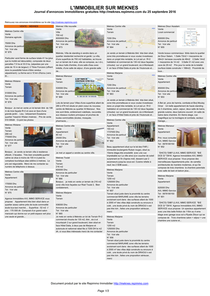 L'IMMOBILIER SUR MEKNES Journal d'annonces immobilieres gratuites http://meknes.repimmo.com du 25 septembre 2016 Retrouvez nos annonces immobilières sur le site http://meknes.repimmo.com VENTE - MEKNES Meknes Centre ville Vente Domaine agricole 75000 Dhs Annonce de particulier Tel : Voir site N° 879 Particulier vend ferme de surface totale 41 ha (plus que la moitié est labourable), composée de deux parcelles 7.5 ha et 33.5 ha, (séparées par une piste de 10 m de largeur): 2 Titres Fonciers (offrent donc la possibilité future d’être vendus séparément). La ferme est à 10 km d'Azrou (vers El... Meknes Wislane Vente Terrain Meknes Ville nouvelle Vente Villa 700 m2 8000000 Dhs Annonce de particulier Tel : Voir site N° 873 Meknes Centre ville Vente Terrain Meknes Diour Assalam Vente Local commercial 7200 Dhs Annonce de particulier Tel : Voir site N° 864 800000 Dhs Annonce de particulier Tel : Voir site N° 855 Meknès, Villa de standing à vendre dans un quartier résidentiel recherché et gardé. La villa, d'une superficie de 700 m2 habitables, se trouve sur un terrain de 4 ares. elle se compose, au r-d-c, de deux halls d'entrée, d'une salle d'eau avec toilette, d'une salle de séjour, d'une grande salle de... Je vends un terrain à Meknès titré très bien situé, zone très prometteuse si vous voulez investissez dans un projet très rentable, le Lot est un R+2 habitation et commercial de 130 m2 deux façades (chouka) sur un grand boulevard, sis à Montazah II en face d’Hôtel Dalia et près de l’Autoroute et... Vends locaux commerciaux titrés dans le quartier de Diour Salam. 1.Salle 72m2 + mezzanine de 28m2+ terrasse couverte de 48m2 2.Salle 14m2 + mezzanine de 14 m2 3.Salle 31 m2 avec une cave de 29 m2 Prix pour la vente de la totalité (surface totale construite = 188m2) Proximité de tous... Meknes Marjane Vente Terrain Meknes Mansour Vente Terrain 7200 Dhs Annonce de particulier Tel : Voir site N° 863 530000 Dhs Annonce de particulier Tel : Voir site N° 869 510000 Dhs Annonce de particulier Tel : Voir site N° 878 Bonjour Je met en vente un lot terrain titré de 108 m de trois façade R+2 et cave en face d'une grande jardin . Lieu : lotissement Essalama quartier Yasamin Wislan /meknes . Prix de vente 510 000dh Ci-joint les photos Lots de terrain pour Villas d'une superficie allant de 285 à 479 m2 situés en plein coeur du nouveau centre de Meknès au quartier Al Mansour. Nos lots sont titrés, entièrement viabilisés, raccordés aux réseaux routiers principaux et proches de toutes commodités (écoles, mosquée, pharmacie,... Meknes Wislane Vente Terrain 268 m2 770000 Dhs Annonce de particulier Tel : Voir site N° 877 Meknes Centre ville Vente Appartement 80 m2 25000 Dhs Annonce de particulier Tel : Voir site N° 867 Bonjour, Je vends ce terrain villa à residence elfarah, 3 facades. Très bien ensoleillé,quartier calme se situe à moins de 100 m à pied du complexe touristique alae eddine à meknes. Le prix est négociable. Merci de me contacter au numéro de téléphone ci dessus. Je met un appart a vendre au centre ville. Meknes Centre ville Vente Appartement 170000 Dhs Annonce de particulier Tel : Voir site N° 875 Agence Immobilière AVL IMMO SERVICE vous propose Appartement très bien situé dans un quartier assez calme près de toute commodité école bus-taxi marché… Superficie : 52 m2 // prix : 170 000 dh Composé d’un grand salon marocain qui donne sur un petit espace vert plus une seule et grande... Meknes Toulal Vente Terrain 216 m2 600000 Dhs Annonce de particulier Tel : Voir site N° 866 Bonjour, je mets en vente un terrain de 216 m2 zone villa trois façades sur Riad Toulal 2, Bien cordialement, Meknes Marjane Vente Terrain 936000 Dhs Annonce de particulier Tel : Voir site N° 865 Je mets en vente à Meknès un lot de Terrain R+2 commercial chouka de 130 m2, titré , sis à al mountazah 2 sur grand boulevard, bien situé en face Hôtel Dalia, à deux pas de Marjane et autoroute et nationnal rabat fés à 7200 DH le m2 dh, si vous êtes intéressés merci de me contacter Je vends un terrain à Meknès titré très bien situé, zone très prometteuse si vous voulez investissez dans un projet très rentable, le Lot est un R+2 habitation et commercial de 130 m2 deux façades (chouka) sur un grand boulevard, sis à Montazah II en face d’Hôtel Dalia et près de l’Autoroute et... Meknes Centre ville Vente Appartement 193 m2 1737000 Dhs Annonce de particulier Tel : Voir site N° 862 Beau appartement situé sur le bd des FAR ( immeuble boulangerie Ruban rouge), situé au 10eme étage,très ensoleillé avec une vue imprebable sur La ville ainsi q'un coucher de soleil surprenant en fin d'apres midi, desservi par 2 ascenseurs jusqu'au sous-sol. Cuisine refaite à neuf, les 2 SDB aussi... Meknes Marjane Vente Terrain 1200 m2 1250000 Dhs Annonce de particulier Tel : Voir site N° 857 Terrain situé juste dans la proximité du centre commercial MARJANE zone villa les terrains avoisinant sont dans des surfaces allant de 1000 à 2000 m² des villas déjà construits ou encours à coté , une école privé du nom de DRAOUI n est pas très loin , faites une proposition sérieuse , merci Meknes Marjane Vente Terrain 1200 m2 1250000 Dhs Annonce de particulier Tel : Voir site N° 856 Terrain situé juste dans la proximité du centre commercial MARJANE zone villa les terrains avoisinant sont dans des surfaces allant de 1000 à 2000 m² des villas déjà construits ou encours à coté , une école privé du nom de DRAOUI n est pas très loin , faites une proposition sérieuse , merci Document produit par le site Repimmo Immobilier http://meknes.repimmo.com Page 1/3 Meknes Centre ville Vente Appartement 850000 Dhs Annonce de particulier Tel : Voir site N° 853 A Bel air, prox de hamria, combata et Borj Moulay Omar Un belle appartement de haute standing de 3 chambres, salon, sejour, deux salle de bains, grande cuisine, deux balcons couvert. Un salle de baine da