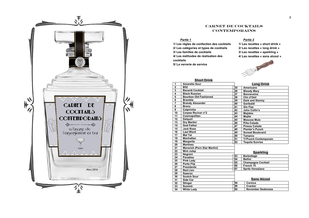 2 CARNET DE COCKTAILS CONTEMPORAINS Partie 1 1/ Les règles de confection des cocktails 2/ Les catégories et types de cocktails 3/ Les familles de cocktails 4/ Les méthodes de réalisation des cocktails 5/ La verrerie de service Partie 2 1/ Les recettes « short drink » 2/ Les recettes « long drink » 3/ Les recettes « sparkling » 4/ Les recettes « sans alcool » Short Drink Mars 2016 1 2 3 4 5 6 7 8 9 10 11 12 13 14 15 16 17 18 19 20 21 22 23 24 25 26 27 28 29 30 31 32 33 34 Amaretto Sour B52 Bacardi Cocktail Black Russian Bourbon Old Fashioned Bramble Brandy Alexander Bronx Caïpirinha Corpse Reviver n°2 Cosmopolitan Daïquiri Dry Martini God Father Jack Rose Last Word Maï Taï Manhattan Margarita Martinez Maverick (Porn Star Martini) Mint Julep Negroni Paradise Pink Lady Porto Flip Presidente Red Lion Sazerac Scotch Sour Side Car Stinger Summit White Lady Long Drink 35 36 37 38 39 40 41 42 43 44 45 46 47 48 49 50 51 52 Americano Bloody Mary Bonneveine Clin d’Oeil Dark and Stormy Garibaldi Gin Fizz John Collin’s Mojidos Mojito Moscow Mule Piña Colada Pineau Colada Planter’s Punch Sunset Boulevard Tampico Ti’Punch Contemporain Tequila Sunrise 53 54 55 56 57 Barbottage Bellini Champagne Cocktail French 75 Spritz Veneziano Sparkling Sans Alcool 58 59 60 Corsica Cracker November Seabreeze 3 4 1/ LES RÈGLES DE CONFECTION DES COCKTAILS 2/ LES CATÉGORIES ET TYPES DE COCKTAILS A/ UNE SEULE EAU-DE-VIE DE BASE (VODKA, GIN, TEQUILA, WHISKY, COGNAC …) Règle de confection nationale, ne pas être surpris de rencontrer à l’international des recettes comportant plusieurs eauxde-vie. (Ex : VESPER, ANGEL FACE, BETWEEN THE FACE, LONG ISLAND ICE TEA) Peut-être est-ce tout simplement une histoire culturelle : la France, pays « viticole », a l’habitude « d’analyser » les boissons pour y retrouver des parfums de, des nuances de, des pointes de, des arrières goûts de … Les pays anglo-saxons n’ont pas cette habitude et se contentent d’un résultat tout simplement « bon ». B/ PAS PLUS DE 6 INGRÉDIENTS Aujourd’hui, les règles de confection à la française imposent l’utilisation de 6 ingrédients (liquides et solides) maximum. L’exception culturelle du premier point explique aussi cette règle. C/ NE PAS DÉPASSER 7 CL D’ALCOOL Là encore, cette règle est nationale. Il ne faudra pas être surpris de trouver 2 mesures d’eau-de-vie (soit 8 cl), dans des recettes internationales. 7 cl d’alcool limiteront l’alcoolisation de la clientèle, ou permettront la vente d’un second verre. L’intérêt est donc double ! D/ LA RÈGLE DE L’ÉQUILIBRE ENTRE LES 3 S Sweet : c’est le sucré, la douceur. Il peut être apporté par une liqueur, une crème, un fruit, un sirop ou tout simplement du sucre. Sour : c’est l’acidité, le lien du cocktail. Souvent apporté par un agrume ou d’autres fruits (ex : Cranberry). Strong : c’est la force du cocktail. L’eau-de-vie est le principal apport de la puissance. Un bon équilibre entre ces trois « S » sera un gage de qualité des recettes. Si l’un prend le dessus, il en résulte un déséquilibre forcément gênant ! E/ DÉCORATION COMESTIBLE La décoration (ou garniture) doit apporter un plus visuel, rester simple, évoquer si possible les produits utilisés dans le cocktail ou encore s’accorder au goût de votre recette. Dans tous les cas, elle devra être comestible. Ne pas utiliser de décoration alcoolisée pour un cocktail sans alcool. F/ L’ORDRE DE CONFECTION Quand on réalise une recette, on applique toujours une règle qui va toujours du moins alcoolisé au plus alcoolisé. Certains diront : du moins cher au plus cher. G/ DIXIÈMES OU CENTILITRES ? Rédiger une recette en dixièmes permet de la faire voyager (le centilitre n’est pas une unité universelle) et permet de l’adapter à la verrerie. Un long drink de 12 cl sera modifié en fonction de la contenance du verre de service. Cela facilite aussi la réalisation de plusieurs litres de préparation lors de buffets ou conventions … Les recettes de ce carnet sont exprimées dans la forme la plus simple : le cl. À l’international, beaucoup de recettes sont exprimées en ml. H/ NE PAS FAIRE DE MÉLANGE AU HASARD Si rien n’est vraiment « interdit », tous les produits ne se mélangent pas entre eux. L’acidité ne fera pas bon ménage avec le jaune d’œuf par exemple. I/ S’ADAPTER À LA VERRERIE Comme nous le verrons par la suite, il existe des règles concernant les short et long drinks. Certains établissements choisissent d’utiliser une verrerie dont la contenance est plus importante que celle dite « classique », que ce soit pour un rendu visuel ou pour justifier un prix de vente assez élevé. Dans tous les cas, il faudra adapter la recette à cette verrerie. LES CATÉGORIES DE COCKTAILS - LES SHOOTERS : portant le même nom que le verre qui sert à leur service, ils mesurent de 3 à 6 cl. - LES SHORTS DRINKS : catégorie reine des cocktails, ils mesurent généralement 7cl. La tendance actuelle propose des recettes jusqu'à 10 cl. Ils sont généralement assez alcoolisées. - LES LONGS DRINKS : à partir de 12 cl, on retrouve en général des mélanges moins alcoolisés et servis en tumbler sur glace ou dans une verrerie plus fantaisie. - LES SPARKLINGS : de l’anglais effervescent, ils regroupent les cocktails « au champagne » servis en flûte. - LES HOT DRINKS : cocktails servis chauds. LES TYPES DE COCKTAILS - LES BEFORE DINNER : traduit par « apéritifs ». Le but de ces cocktails est d’ouvrir l’appétit des consommateurs. Souvent composés d’ABV ou de bitters. - LES AFTER DINNER : traduit par « digestifs ». Ces recettes ont été créées pour faciliter la digestion. Souvent composées d’eau-de-vie et de liqueur. - LES ALL DAY COCKTAILS (ou fancy) : Par extension, cette famille de cocktails doit reprendre les mélanges n’ayant pas pour but de mettre en appétit ou de faciliter la digestion. On considè