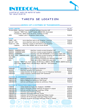 INTERCOM Locat ion et vent e de mat ér iel audio Tél : 04.67.70.97.72 T A R I F S DE LO CA T I O N MICROS UHF & SYSTEMES DE TRANSMISSION AUDIO LIMITED P.U. H T TX-DX 2020U : émetteur cravate/récepteur portable Diversity UHF …………………………………………….. 75,00 € - Capsules : TR50 Tram, Cos11PT Sanken, ME102/104, Countryman - Accessoires : câbles divers de sortie, d'entrée et d'alim. APR1 : coupleur, pour 2 récepteurs Audio Limited …………………………………………………………….. 79,00 € SHURE SM58 - U2D Beta 87 - U2D Pocket U1 – U2D - Capsules : micro émetteur main et son récepteur Diversity ……………………………………… 79,00 € : micro émetteur main et son récepteur Diversity ……………………………………… 79,00 € : émetteur cravate ou instrument et son récepteur ……………………………………. 79,00 € : serre tête WCM16, omni ou cardio WL184 SENNHEISER EM3031 - SKM5000/SK50 : émetteur cravate ou main/récepteur UHF …………………………… 79,00 € EM3032 - SKM5000/SK50 : émetteur cravate ou main/récepteur double UHF ……………. 158,00 € EM3031 - SKM5000N : émetteur main tête NEUMANN et récepteur simple UHF… 84,00 € EK 4015 / 3041 – SKM5000/SK50 : émetteur cravate ou main/récepteur portable (piles) UHF.. 79,00 € ASA 3000 : Multi coupleur Sennheiser, 2 x 1 x 8 ……………………………………… 79,00 € A12AD : paire d'antennes boostées pour EM 3031/3032 UHF …………. 79,00 € DPA : 4066, serre tête et 4061 micro omni DPA …..….…………………. 30,00 € - Capsules : TR50 Tram, Cos11 Sanken, WL184 Shure, MKE2 G, ME102, ME104, MKE40 Sennheiser - Serre tête : WCM16 Shure, OPUS54 Beyer, NB2/102 – 104 Sennheiser, VISITE GUIDEE SKM1030 SK2020 HDE1030 HDE2020 : micro émetteur de conférence Sennheiser............................................................... 55,00 € : émetteur de poche UHF Sennheiser............................................................................ 55,00 € : casque écouteur de réception mono, bi ou tri fréquences Sennheiser…………..... 8,00 € : casque récepteur stéthoscopique UHF Sennheiser…………………………………………..... 8,00 € SYSTEME DE CONFERENCE LBB3534/50 : pupitre président de conférence, DNC Philips ………………………………………………….. LBB3531/50 : pupitre délégué de conférence, DNC Philips ……………………………………………………….. LBB3500/05 : unité de contrôle pour système de conférence, Philips ……………………………………. 28,00 € 26,00 € 79,00 € SYSTEME DE TRADUCTION SIMULTANEE CABINE : cabine double de traduction, Audipack – ISO9002 …………………………………………. LBB3520/10 : pupitre interprète, Philips numérique 15 langues et casques ………………………… LBB3500/05 : unité de contrôle infrarouge numérique, Philips ……………………………………………… LBB3508/00 : interface audio/numérique Philips ………………………………………………………………………. LBB4502/16 : émetteur infrarouge numérique, Philips ……………………………………………………………. LBB4511/00 : radiateur 12,5 W infrarouge numérique Philips et pieds …………………………………. LBB4512/00 : radiateur 25 W infrarouge numérique Philips et pieds ……………………………………. LBB4540/00 : récepteur de poche infrarouge numérique Philips et casques ……………………….. 110,00 € 42,00 € 79,00 € 55,00 € 69,00 € 59,00 € 90,00 € 4,00 € MICROPHONES DYNAMIQUES et DIFFERENCIEL AKG, D112 : micro cardioïde pour prise de son d'instruments graves ……………………… BEYER, M160 : micro cardioïde pour prise de son de choeur, piano et cordes ……………… BEYER, M88 : micro de reportage et chant ……………………………………………………………………….. COLES, 4104 : micro différentiel pour commentaire en milieu bruyant ………………………… SENNHEISER, MD421 : micro de reportage ………………………………………………………………………………….…… SHURE, SM58 : micro de scène et chant ……………………………………………………………………………… 15,00 € 15,00 € 15,00 € 39,00 € 15,00 € 15,00 € ELECTROSTATIQUES et STEREO AT857 : micro conférence sur col de cygne et pied lourd XLR………..….. AKG, C451/SE300B : micro cardio pour conférence et prise de son instrumental…. AKG, C414 : micro de chant ……………………………………………………………………………. AKG, C535 : micro de chant ………………………………………………………………………..……. SENNHEISER, MKH 40/50/60 : micro cardio, super et hypercardioïde ……………………………………. SENNHEISER, MKH 416 : micro demi-canon ………………………………………………………..………………… SENNHEISER, MKH 418 S : micro stéréo …………………………………………………………………………………. SHURE SM98 : micro miniature pour prise de son saxophone et caisse claire SCHOEPS, CMC6/MK 2/4/21/41 : micro omni, cardio, infracard., hypercard ……………………………… SCHOEPS, BLM03 : micro plaque type PZM …………………………………………………………….. SCHOEPS, MS : micro stéréo avec décodeur et bonnette Rycote …………………… SCHOEPS, XY, AB, ORTF : couple stéréo SCHOEPS et Rycote ………………………………………….. SCHOEPS, KC5/TC5 : câble actif pour micro SCHOEPS ……………………………………………… SCHOEPS, RC700 : perchette et perche active pour micro SCHOEPS …………