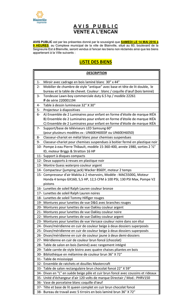 AVIS PUBLIC VENTE À L’ENCAN AVIS PUBLIC est par les présentes donné par le soussigné que SAMEDI LE 14 MAI 2016 à 9 HEURES, au Complexe municipal de la ville de Blainville, situé au 60, boulevard de la Seigneurie Est à Blainville, seront vendus à l'encan les biens non réclamés ainsi que les biens appartenant à la Ville suivants : LISTE DES BIENS DESCRIPTION 1- Miroir avec cadrage en bois laminé blanc 30" x 44" 2- Mobilier de chambre de style "antique" avec base et tête de lit double, le bureau et la table de chevet. Couleur : blanc / coquille d'œuf (bois laminé) 3- Tondeuse Lawn-boy commerciale duty 6.5 hp / modèle 22261 # de série 220001194 4- Table à dessin lumineuse 32" X 30" 5- Projecteur à diapositives 6- A) Ensemble de 2 Luminaires pour enfant en forme d'étoile de marque IKÉA B) Ensemble de 2 Luminaires pour enfant en forme d'étoile de marque IKÉA C) Ensemble de 2 Luminaires pour enfant en forme d'étoile de marque IKÉA 7- Support/base de téléviseurs LED Samsung 60" (pour plusieurs modèles ex : UN60EH6003F ou UN60EH6050) 8- Classeur-chariot en métal blanc pour chemises suspendues 9- Classeur-chariot pour chemises suspendues à boitier fermé en plastique noir 10- Pompe à eau Pierre Thibault, modèle 15-360-400, année 1980, sorties 2 ½" ID, moteur Briggs & Stratton 16 HP 11- Support à disques compacts 12- Deux supports à revues en plastique noir 13- Montre Guess waterpro couleur argent 14- Compacteur (jumping jack) Wacker BS60Y, moteur 2 temps 15- Compresseur d'air Makita à 2 réservoirs, Modèle : MAC5500G, Moteur Honda 4 temps GX160, 5,5 HP, 12,5 CFM à 100 PSI, 130 PSI Max, Pompe V2 pistons 16- Lunettes de soleil Ralph Lauren couleur bronze 17- Lunettes de soleil Ralph Lauren noires 18- Lunettes de soleil Tommy Hilfiger rouges 19- Montures pour lunettes de vue D&G avec branches rouges 20- Montures pour lunettes de vue Oakley couleur argent 21- Montures pour lunettes de vue Oakley couleur noire 22- Montures pour lunettes de vue Oakley couleur argent 23- Montures pour lunettes de vue Versace couleur noire dans son étui 24- Divan/méridienne en cuir de couleur beige à deux dossiers superposés 25- Divan/méridienne en cuir de couleur beige à deux dossiers superposés 26- Divan/méridienne en cuir de couleur jaune à deux demi-dossiers 27- Méridienne en cuir de couleur brun foncé (chocolat) 28- Table de salon en bois (laminé) avec rangement intégré 29- Table carrée de style bistro avec quatre chaises pliantes en bois 30- Bibliothèque en mélamine de couleur brun 36" X 72" 31- Table de mississippi 32- Ensemble de ratchets et douilles Mastercraft 33- Table de salon rectangulaire brun chocolat foncé 22" X 59" 34- Divan en "L" en suède beige pâle et cuir brun foncé avec coussins et rideaux 35- Unité d'échangeur d'air 120 volts de marque Directair / Mod.: PHRV150 36- Vase de porcelaine blanc coquille d'œuf 37- Tête et base de lit queen complet en cuir brun chocolat foncé 38- Bureau de travail avec 5 tirroirs en bois laminé brun 36" X 72" 3940414243444546474849505152535455565758596061626364656667- Tableau décoratif imprimé – Cathédrale sur rue Deux chaises de type bistro en cuir blanc Caméra NIKON Coolpix S8100 - 12.1 mega-pixel - zoom 10X - full HD movie Jumping jack Mikasa, modèle MT75-HS, # de série H2926, année inconnue Scie à béton neuve, Stihl modèle TS700, # de série 175 104 810 Scie à chaine neuve, Stihl modèle MS880 magnum, # de série 175 052 449 Purificateur d'air de bureau + filtreur, 3M modèle OAC150, # de série EO500439 Casquette de la LNH "Flyers de Philadelphie" Ponceuse électrique 6" de marque JOBMATE modèle 39-9002-2 avec 4 boites de papier sablé Ponceuse électrique 5" de marque DEWALT modèle D26451 Pistolet à peinture pour retouche de marque HUSKY Sac de sport bleu et noir "Easton" avec outils divers Sac de voyage nylon noir sur roulettes Hache mastercraft avec manche 36" Sac à dos en nylon noir de marque "Swiss army" DEUX 20 litres de Nettoyeur à freins et pièces (brake cleaner) TROIS lumières halogène pour chasse-neige (côté droit) Grote # 64251 Micro-onde Sanyo, modèle EM-606TW, 600 Watts, couleur blanc Air climatisé Simplicity, modèle SAC8250D, 8250 BTU, blanc Classeur mobile vertical à 2 tirroirs, mélamine brun acajou Film "300" sur DVD Grand vase en terre cuite 32" de style "Égyptien" Présentoir à livres pour enfant avec dessin d'ours Petit théâtre de marionnettes Petite bibliothèque en bois (mini-présentoir à livres) Grande armoire avec classeur intégré en bas (deux tiroirs) Lutrin en bois Réfrigérateur Inglis blanc modèle IST163301 28"large X 28"profond X 66"haut Ensemble de quatre coupes-chaines LISTE DES BICYCLETTES DESCRIPTION 1- Vélo de montage Infinity Quart, couleur bleu foncé/gris, 21 vitesses suspension avant # de série D411616OMOICC07A05606 2- Vélo CCM, couleur rouge/blanc style montagne Vandal # de série AL10B069154 3- Vélo Venture Typhoon, couleur bleu/jaune, 18 vitesses avec cornes aux poignées et support à l’arrière # de série L971201465 4- Vélo Mountain Tour Canyon Runner , couleur bleu, 18 vitesses # de série RB562075 5- Vélo CCM, 21 vitesses, couleur bleu/blanc/noir modèle Elypse avec suspension à l’avant # de série PRR0418186 6- Vélo Triumph Laser DX, couleur bleu/rouge/blanc 18 vitesses, # de série B479398 7- Vélo Hawaï couleur bleu # de série 3E00789 8- Vélo Oryx 24 vitesses, couleur noir avec lettrage blanc/bleu # de série PROSO90223297 9- Vélo Avico couleur rose, 1 vitesse, # de série G1311046613 10- Vélo de montagne Supercycle MRX-5000, couleur jaune/rouge double suspension, 21 vitesses a grip shift # de série L990907074 11- Vélo de montagne Infinity Viper, couleur noir/gris, 21 vitesses # de série TR101135051 12- Vélo Supercycle SC1800, couleur or, 18 vitesses # de série RB0716950 13- Vélo Protour, couleur bleu/rose/blanc, 18 vitesses # de série WPB14048 14- Vélo FSX252, 6 vitesses, couleur noir/gris/r