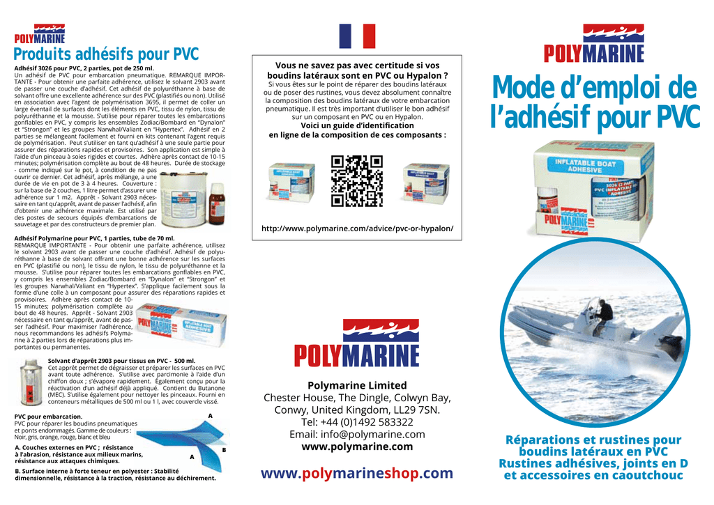 POLYMARINE Produits adhésifs pour PVC Adhésif 3026 pour PVC, 2 parties, pot de 250 ml. Un adhésif de PVC pour embarcation pneumatique. REMARQUE IMPORTANTE - Pour obtenir une parfaite adhérence, utilisez le solvant 2903 avant de passer une couche d’adhésif. Cet adhésif de polyuréthanne à base de solvant offre une excellente adhérence sur des PVC (plastifiés ou non). Utilisé en association avec l’agent de polymérisation 3695, il permet de coller un large éventail de surfaces dont les éléments en PVC, tissu de nylon, tissu de polyuréthanne et la mousse. S’utilise pour réparer toutes les embarcations gonflables en PVC, y compris les ensembles Zodiac/Bombard en “Dynalon” et “Strongon” et les groupes Narwhal/Valiant en “Hypertex”. Adhésif en 2 parties se mélangeant facilement et fourni en kits contenant l’agent requis de polymérisation. Peut s’utiliser en tant qu’adhésif à une seule partie pour assurer des réparations rapides et provisoires. Son application est simple à l’aide d’un pinceau à soies rigides et courtes. Adhère après contact de 10-15 minutes; polymérisation complète au bout de 48 heures. Durée de stockage - comme indiqué sur le pot, à condition de ne pas ouvrir ce dernier. Cet adhésif, après mélange, a une durée de vie en pot de 3 à 4 heures. Couverture : sur la base de 2 couches, 1 litre permet d’assurer une adhérence sur 1 m2. Apprêt - Solvant 2903 nécessaire en tant qu’apprêt, avant de passer l’adhésif, afin d’obtenir une adhérence maximale. Est utilisé par des postes de secours équipés d’embarcations de sauvetage et par des constructeurs de premier plan. Adhésif Polymarine pour PVC, 1 parties, tube de 70 ml. REMARQUE IMPORTANTE - Pour obtenir une parfaite adhérence, utilisez le solvant 2903 avant de passer une couche d’adhésif. Adhésif de polyuréthanne à base de solvant offrant une bonne adhérence sur les surfaces en PVC (plastifié ou non), le tissu de nylon, le tissu de polyuréthanne et la mousse. S’utilise pour réparer toutes les embarcations gonflables en PVC, y compris les ensembles Zodiac/Bombard en “Dynalon” et “Strongon” et les groupes Narwhal/Valiant en “Hypertex”. S’applique facilement sous la forme d’une colle à un composant pour assurer des réparations rapides et provisoires. Adhère après contact de 1015 minutes; polymérisation complète au bout de 48 heures. Apprêt - Solvant 2903 nécessaire en tant qu’apprêt, avant de passer l’adhésif. Pour maximiser l’adhérence, nous recommandons les adhésifs Polymarine à 2 parties lors de réparations plus importantes ou permanentes. Solvant d’apprêt 2903 pour tissus en PVC - 500 ml. Cet apprêt permet de dégraisser et préparer les surfaces en PVC avant toute adhérence. S’utilise avec parcimonie à l’aide d’un chiffon doux ; s’évapore rapidement. Également conçu pour la réactivation d’un adhésif déjà appliqué. Contient du Butanone (MEC). S’utilise également pour nettoyer les pinceaux. Fourni en conteneurs métalliques de 500 ml ou 1 l, avec couvercle vissé. A PVC pour embarcation. PVC pour réparer les boudins pneumatiques et ponts endommagés. Gamme de couleurs : Noir, gris, orange, rouge, blanc et bleu A. Couches externes en PVC ; résistance à l’abrasion, résistance aux milieux marins, résistance aux attaques chimiques. A B. Surface interne à forte teneur en polyester : Stabilité dimensionnelle, résistance à la traction, résistance au déchirement. B Vous ne savez pas avec certitude si vos boudins latéraux sont en PVC ou Hypalon ? Si vous êtes sur le point de réparer des boudins latéraux ou de poser des rustines, vous devez absolument connaître la composition des boudins latéraux de votre embarcation pneumatique. Il est très important d’utiliser le bon adhésif sur un composant en PVC ou en Hypalon. Voici un guide d’identification en ligne de la composition de ces composants : POLYMARINE Mode d’emploi de l’adhésif pour PVC http://www.polymarine.com/advice/pvc-or-hypalon/ POLYMARINE Polymarine Limited Chester House, The Dingle, Colwyn Bay, Conwy, United Kingdom, LL29 7SN. Tel: +44 (0)1492 583322 Email: [email protected] www.polymarine.com www.polymarineshop.com Réparations et rustines pour boudins latéraux en PVC Rustines adhésives, joints en D et accessoires en caoutchouc Pic: Trousse de réparation professionnelle Polymarine pour surfaces en PVC, avec accessoire de lissage REMARQUE IMPORTANTE : Avant de commencer un collage, vous devez vous assurer que le lieu de travail est bien aéré, chaud et sec. Si l’air est trop humide, n’essayez pas d’utiliser cet adhésif , sinon il risque de subir une efflorescence. N’utilisez pas un chauffage au gaz ou une source de chaleur à flamme nue car les solvants sont très inflammables. N’utilisez pas cet adhésif si son mélange a eu lieu il y a plus de 4 heures. 5. Laissez sécher pendant au moins 6 heures. 75mm 6. Une fois le séchage terminé, gonflez le boudin pneumatique et vérifiez-en l’étanchéité. La rustine interne doit être étanche à l’air. 30mm RUSTINE INTERNE: 1. Repérez la zone à réparer et découpez votre rustine à la taille requise. Elle doit avoir une superficie suffisante pour recouvrir la partie endommagée, plus 30 mm sur chaque côté. Assurez-vous que tous les coins sont bien arrondis. 2. À l’aide de votre chiffon, essuyez la surface de la rustine et du boudin pneumatique qui doit recevoir la couche RUSTINE EXTERNE: 7. Préparez la surface extérieure du boudin externe ainsi que votre rustine externe. Apposez un ruban de marouflage tout autour de la rustine en laissant un vide de 3 mm pour tenir compte de l’étirement du matériau, ce qui permettra d’éviter tout chevauchement de l’adhésif. 12 1 2 3 RÉPARATION D’UN TROU: Si le boudin est endommagé sur plus de 75 mm, quel que soit le sens, il faut apposer une “rustine interne”. La procédure 