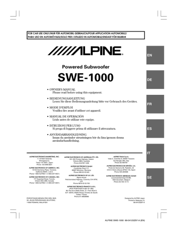 FOR CAR USE ONLY/NUR FÜR AUTOMOBIL GEBRAUCH/POUR APPLICATION AUTOMOBILE/ PARA USO EN AUTOMÓVILES/SOLO PER L’UTILIZZO IN AUTOMOBILE/ENDAST FÖR BILBRUK R EN Powered Subwoofer SWE-1000 DE • OWNER'S MANUAL Please read before using this equipment. • BEDIENUNGSANLEITUNG Lesen Sie diese Bedienungsanleitung bitte vor Gebrauch des Gerätes. FR • MODE D'EMPLOI Veuillez lire avant d’utiliser cet appareil. • MANUAL DE OPERACIÓN Léalo antes de utilizar este equipo. • ISTRUZIONI PER L’USO Si prega di leggere prima di utilizzare il attrezzatura. ES • ANVÄNDARHANDLEDNING Innan du använder utrustningen bör du läsa igenom denna användarhandledning. IT ALPINE ELECTRONICS MARKETING, INC. 1-1-8 Nishi Gotanda, Shinagawa-ku, Tokyo 141-0031, Japan Phone 03-5496-8231 ALPINE ELECTRONICS OF AMERICA, INC. 19145 Gramercy Place, Torrance, California 90501, U.S.A. Phone 1-800-ALPINE-1 (1-800-257-4631) ALPINE ELECTRONICS OF CANADA, INC. 777 Supertest Road, Toronto, Ontario M3J 2M9, Canada Phone 1-800-ALPINE-1 (1-800-257-4631) ALPINE ELECTRONICS OF AUSTRALIA PTY. LTD. 161-165 Princes Highway, Hallam Victoria 3803, Australia Phone 03-8787-1200 ALPINE ITALIA S.p.A. Viale C. Colombo 8, 20090 Trezzano Sul Naviglio (MI), Italy Phone 02-484781 ALPINE ELECTRONICS GmbH Frankfurter Ring 117, 80807 München, Germany Phone 089-32 42 640 ALPINE ELECTRONICS DE ESPAÑA, S.A. Portal de Gamarra 36, Pabellón, 32 01013 Vitoria (Alava)-APDO 133, Spain Phone 945-283588 ALPINE ELECTRONICS OF U.K. LTD. Alpine House Fletchamstead Highway, Coventry CV4 9TW, U.K. Phone 0870-33 33 763 ALPINE ELECTRONICS (BENELUX) GmbH Leuvensesteenweg 510-B6, 1930 Zaventem, Belgium Phone 02-725-13 15 ALPINE ELECTRONICS FRANCE S.A.R.L. (RCS PONTOISE B 338 101 280) 98, Rue de la Belle Etoile, Z.I. Paris Nord Il, B.P. 50016, 95945 Roissy Charles de Gaulle Cedex, France Phone 01-48638989 PERCETAKAN MEWAH PEK SDN. BHD. 39, JALAN PERUSAHAAN JELUTONG, 11600 PENANG, MALAYSIA Designed by ALPINE Japan Printed in Malaysia (Y) 68-04123Z97-A ALPINE SWE-1000 68-04123Z97-A (EN) SE AVERTISSEMENT AVERTISSEMENT Ce symbole désigne des instructions importantes. Le non-respect de ces instructions peut entraîner de graves blessures, voire la mort. NE PAS DESASSEMBLER NI MODIFIER L’APPAREIL. Il y a risque d’accident, d’incendie ou de choc électrique. GARDER LES PETITS OBJETS COMME LES PILES HORS DE PORTEE DES ENFANTS. N’ACTIVER AUCUNE FONCTION SUSCEPTIBLE DE DETOURNER VOTRE ATTENTION DE LA CONDUITE DU VEHICULE. Les fonctions requérant une attention prolongée ne doivent être exploitées qu’à l’arrêt complet du véhicule. Toujours arrêter le véhicule à un endroit sûr avant d’activer ces fonctions. Il y a risque de provoquer un accident. NE PAS INSTALLER LE MONITEUR PRES DU COUSSIN D’AIR DU PASSAGER. Si l’appareil n’est pas installé correctement, il risque d’empêcher le fonctionnement du coussin d’air, et si le coussin se déploie, l’appareil risque d’être projeté dans l’habitacle, causant un accident et des blessures. NE PAS COINCER LES CABLES AVEC DES OBJETS VOISINS. Il y a risque d’incendie ou de décharge électrique. Positionner les câbles conformément au manuel de manière à éviter toute obstruction en cours de conduite. Les câbles qui obstruent ou dépassent à des endroits tels que le volant, le levier de changement de vitesses, la pédale de frein, etc., peuvent s’avérer extrêmement dangereux. A UTILISER UNIQUEMENT SUR DES VOITURES A MASSE NEGATIVE DE 12 VOLTS. NE PAS OBSTRUER LES SORTIES D’AIR NI LES PANNEAUX DU RADIATEUR. (Vérifiez auprès de votre concessionnaire si vous n’en êtes pas certain.) Il y a risque d’incendie, etc. Une surchauffe interne peut se produire et provoquer un incendie. L’ingestion de tels objets peut entraîner de graves blessures. En cas d’ingestion, consulter immédiatement un médecin. UTILISER DES FUSIBLES DE L’AMPERAGE APPROPRIE. AVANT TOUTE CONNEXION, DEBRANCHER LE CABLE DE LA BORNE NEGATIVE DE LA BATTERIE. Il y a risque de choc électrique ou de blessure par courts-circuits. NE PAS DENUDER LES CABLES ELECTRIQUES. Ne jamais enlever la gaine isolante pour alimenter un autre appareil. Il y a risque de dépassement de la capacité de courant et, partant, d’incendie ou de choc électrique. NE PAS INSTALLER A DES ENDROITS SUSCEPTIBLES D’ENTRAVER LA CONDUITE DU VEHICULE, COMME LE VOLANT OU LE LEVIER DE VITESSES. La vue vers l’avant pourrait être obstruée ou les mouvements gênés, etc., et provoquer un accident grave. NE PAS ENDOMMAGER DE CONDUITES NI DE CABLES LORS DU FORAGE DES TROUS. GARDER LE VOLUME À FAIBLE NIVEAU DE MANIÈRE À POUVOIR ENTENDRE LES BRUITS EXTÉRIEURS PENDANT LA CONDUITE. Des niveaux de volume excessifs qui couvrent les sirènes des ambulances ou les signaux routiers (passages à niveau, etc.) peuvent être dangereux et provoquer un accident. UN NIVEAU DE VOLUME TROP ÉLEVÉ À L’INTÉRIEUR DU VÉHICULE PEUT ÉGALEMENT AVOIR DES EFFETS IRRÉVERSIBLES SUR VOTRE AUDITION. UTILISER CET APPAREIL POUR DES APPLICATIONS MOBILES DE 12 V. Toute utilisation autre que l’application désignée comporte un risque d’incendie, de choc électrique ou de blessure. EFFECTUER CORRECTEMENT LES CONNEXIONS. Il y a risque de blessures ou de dommages à l’appareil. Lors du forage de trous dans le châssis en vue de l’installation, veiller à ne pas entrer en contact, endommager ni obstruer de conduites, de tuyaux à carburant ou de fils électriques. Le nonrespect de cette précaution peut entraîner un incendie. NE PAS UTILISER DES ECROUS NI DES BOULONS DU CIRCUIT DE FREINAGE OU DE DIRECTION POUR LES CONNEXIONS DE MASSE. Les boulons et les écrous utilisés pour les circuits de freinage et de direction (ou de tout autre système de sécurité) ou les réservoirs ne peuvent JAMAIS être utilisés pour l’installation ou la liaison à la masse. L’utilisation de ces organes peut désactiver le système de contrôle du véhicule et causer u