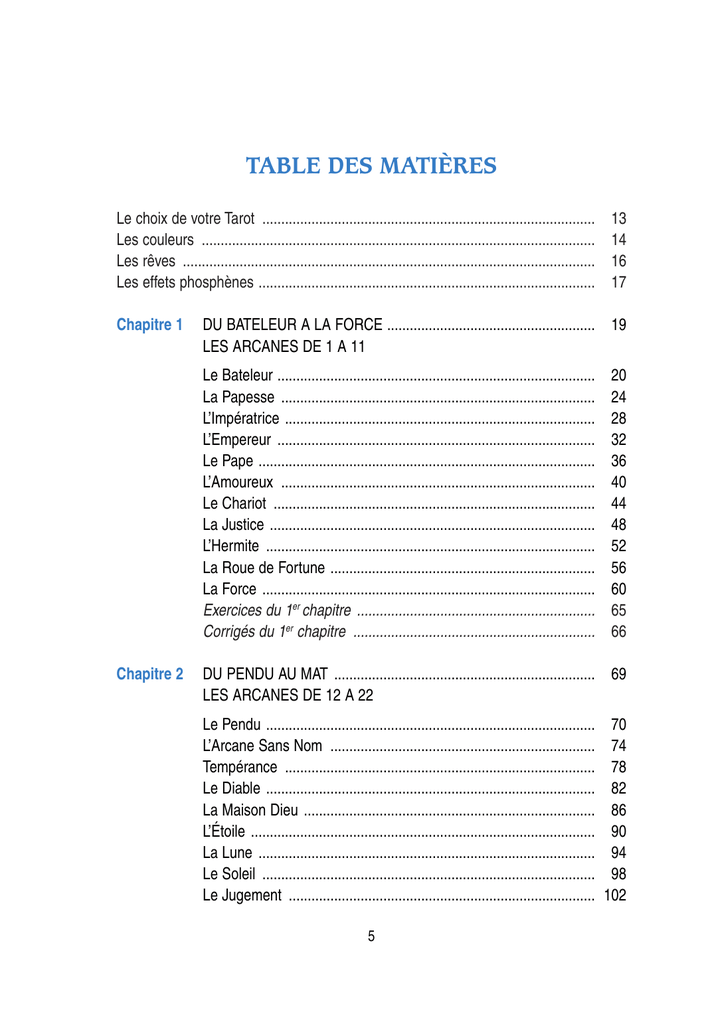 TABLE DES MATIÈRES Le choix de votre Tarot ........................................................................................ Les couleurs ........................................................................................................ Les rêves ............................................................................................................. Les effets phosphènes ......................................................................................... Chapitre 1 DU BATELEUR A LA FORCE ....................................................... 19 LES ARCANES DE 1 A 11 Le Bateleur .................................................................................... La Papesse ................................................................................... L’Impératrice .................................................................................. L’Empereur .................................................................................... Le Pape ......................................................................................... L’Amoureux ................................................................................... Le Chariot ..................................................................................... La Justice ...................................................................................... L’Hermite ....................................................................................... La Roue de Fortune ...................................................................... La Force ........................................................................................ Exercices du 1er chapitre ............................................................... Corrigés du 1er chapitre ................................................................ Chapitre 2 13 14 16 17 20 24 28 32 36 40 44 48 52 56 60 65 66 DU PENDU AU MAT ..................................................................... 69 LES ARCANES DE 12 A 22 Le Pendu ....................................................................................... L’Arcane Sans Nom ...................................................................... Tempérance .................................................................................. Le Diable ....................................................................................... La Maison Dieu ............................................................................. L’Étoile ........................................................................................... La Lune ......................................................................................... Le Soleil ........................................................................................ Le Jugement ................................................................................. 5 70 74 78 82 86 90 94 98 102 Le Monde ...................................................................................... Le Mat ........................................................................................... La coupe : le tirage simplifié ......................................................... Attitudes à adopter pour pratiquer la coupe ................................. Exemple et développement .......................................................... Exercices du 2e chapitre ............................................................... Corrigés du 2e chapitre ................................................................. Chapitre 3 LA COUPE ET LES ARCANES OCCULTES ............................... 125 LES LAMES GÉNÉRIQUES LES ARCANES DE SUBSTITUTION La coupe ....................................................................................... Les lames génériques et les lames de substitution ...................... Bien prendre conscience du pour et du contre ............................. L’importance des personnages ..................................................... Application concrète de cette théorie – Exemples ........................ Tirages sans lames génériques et sans lames remplaçantes – Exemple et analyse ................................................................. Recommandations Importantes .................................................... Exercices du 3e chapitre ............................................................... Corrigés du 3e chapitre ................................................................. Chapitre 4 106 110 114 114 117 119 121 127 128 130 131 132 135 140 142 144 LES ESPACES -TEMPS ............................................................... 149 LES POLARITÉS LA COUPE A DEUX NIVEAUX Les étapes de l’année ................................................................... Les étapes de la journée .............................................................. Les directions géographiques ....................................................... Les espaces-temps ....................................................................... La rythmique des lames ............................................................... Le libre arbitre ............................................................................... Les polarités des lames ................................................................ La coupe à deux niveaux .............................................................. Exercices du 4e chapitre ............................................................... Corrigés du 4e chapitre ................................................................. 6 150 150 151 151 155 158 159 163 171 173 Chapitre 5 LES POLARITÉS EN ACTION ..................................................... 177 LES ASSOCIATIONS DE LAMES CONTRADICTOIRES ET DYNAMIQUES LES PARTICULARITÉS DE LA COUPE LA COUPE A TROIS NIVEAUX Les polarités .................................................................................. Les polarités et le sexe des enfants à venir .