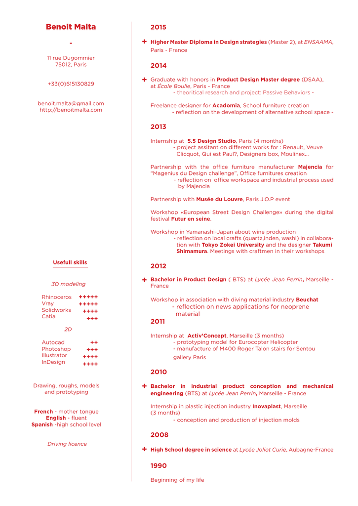 Benoit Malta 2015 + 11 rue Dugommier 75012, Paris +33(0)615130829 Higher Master Diploma in Design strategies (Master 2), at ENSAAMA, Paris - France 2014 + [email protected] http://benoitmalta.com Graduate with honors in Product Design Master degree (DSAA), at École Boulle, Paris - France - theoritical research and project: Passive Behaviors Freelance designer for Acadomia, School furniture creation - reflection on the development of alternative school space - 2013 Internship at 5.5 Design Studio, Paris (4 months) - project assitant on different works for : Renault, Veuve Clicquot, Qui est Paul?, Designers box, Moulinex... Partnership with the office furniture manufacturer Majencia for “Magenius du Design challenge”, Office furnitures creation - reflection on office workspace and industrial process used by Majencia Partnership with Musée du Louvre, Paris J.O.P event Workshop «European Street Design Challenge» during the digital festival Futur en seine. Workshop in Yamanashi-Japan about wine production - reflection on local crafts (quartz,inden, washi) in collaboration with Tokyo Zokei University and the designer Takumi Shimamura. Meetings with craftmen in their workshops Usefull skills 3D modeling Rhinoceros Vray Solidworks Catia 2012 + +++++ +++++ ++++ +++ Workshop in association with diving material industry Beuchat 2011 2D Autocad Photoshop Illustrator InDesign - reflection on news applications for neoprene material Internship at Activ’Concept, Marseille (3 months) - prototyping model for Eurocopter Helicopter - manufacture of M400 Roger Talon stairs for Sentou ++ +++ ++++ ++++ Drawing, roughs, models and prototyping Bachelor in Product Design ( BTS) at Lycée Jean Perrin, Marseille France gallery Paris 2010 + Bachelor in industrial product conception and mechanical engineering (BTS) at Lycée Jean Perrin, Marseille - France Internship in plastic injection industry Inovaplast, Marseille (3 months) - conception and production of injection molds French - mother tongue English - fluent Spanish -high school level 2008 Driving licence + High School degree in science at Lycée Joliot Curie, Aubagne-France 1990 Beginning of my life
