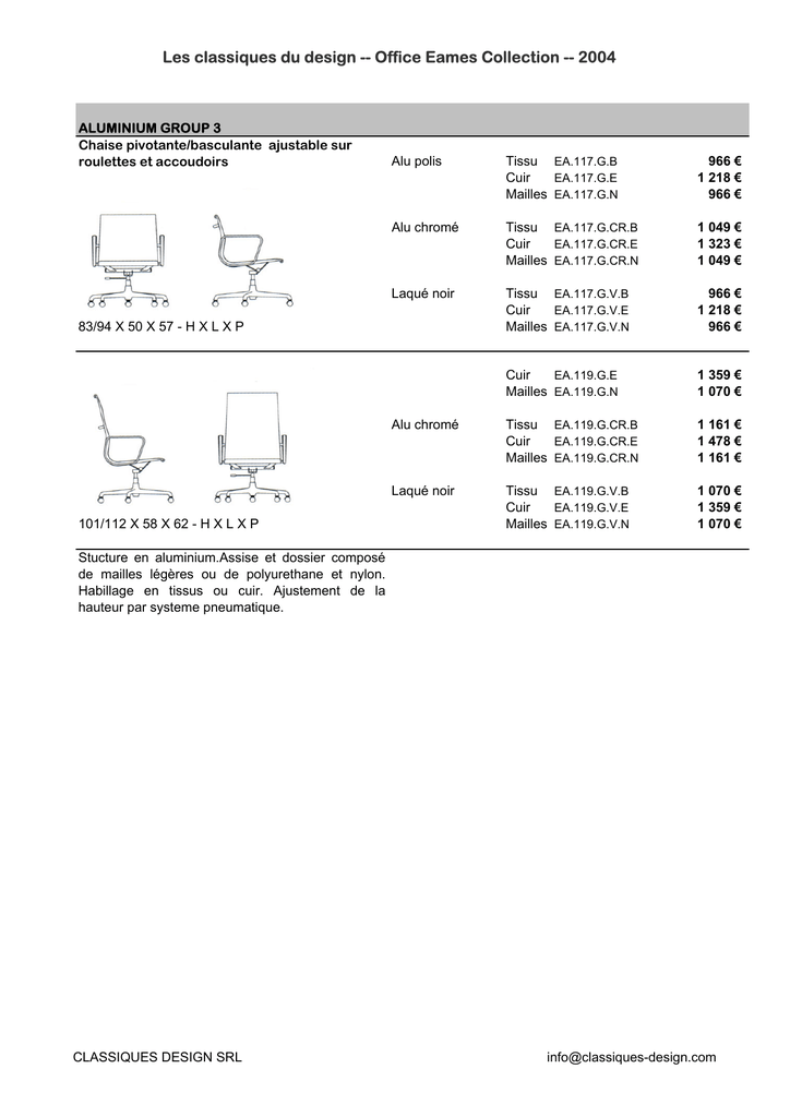 Les classiques du design -- Office Eames Collection -- 2004 ALUMINIUM GROUP 3 Chaise pivotante/basculante ajustable sur roulettes et accoudoirs Alu polis Tissu EA.117.G.B Cuir EA.117.G.E Mailles EA.117.G.N 966 € 1 218 € 966 € Alu chromé Tissu EA.117.G.CR.B Cuir EA.117.G.CR.E Mailles EA.117.G.CR.N 1 049 € 1 323 € 1 049 € Laqué noir Tissu EA.117.G.V.B Cuir EA.117.G.V.E Mailles EA.117.G.V.N 966 € 1 218 € 966 € EA.119.G.E Cuir Mailles EA.119.G.N 1 359 € 1 070 € Alu chromé Tissu EA.119.G.CR.B Cuir EA.119.G.CR.E Mailles EA.119.G.CR.N 1 161 € 1 478 € 1 161 € Laqué noir Tissu EA.119.G.V.B Cuir EA.119.G.V.E Mailles EA.119.G.V.N 1 070 € 1 359 € 1 070 € 83/94 X 50 X 57 - H X L X P 101/112 X 58 X 62 - H X L X P Stucture en aluminium.Assise et dossier composé de mailles légères ou de polyurethane et nylon. Habillage en tissus ou cuir. Ajustement de la hauteur par systeme pneumatique. CLASSIQUES DESIGN SRL [email protected]