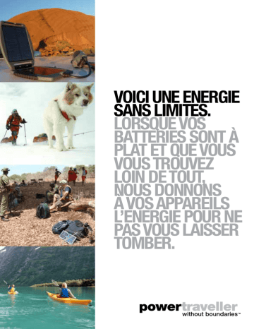 VOICI UNE ENERGIE SANS LIMITES. LORSQUE VOS BATTERIES SONT À PLAT ET QUE VOUS VOUS TROUVEZ LOIN DE TOUT, NOUS DONNONS À VOS APPAREILS L’ENERGIE POUR NE PAS VOUS LAISSER TOMBER. BIENVENUE DANS NOTRE MONDE De l’Antarctique au Sahara, de l’Everest à l’Amazonie, nos produits ont été utilisés dans les endroits les plus isolés, dans les environnements les plus hostiles de notre planète et sur lesquels nos aventuriers et explorateurs ont toujours pu compter. Conçus selon des critères militaires, les chargeurs Powertraveller vous donnent la garantie de continuer à travailler et rester en contact quelque soit votre prochain exploit. 02 03 Index des Produits Capacité de la batterie mAh 04 Chargeur Solaire iPhones/ Smart Phones Mobiles iPods/ MP3/MP4 PDA PSP/Consoles de jeux portatives Sat-Navs iPads Netbooks/ ultraportables Ordinateurs portables Voitures/ Motos/ Bateaux Appareils photos/ Caméras Hand-held Cameras/ Action Cameras lampes Voir frontales Page powergorilla 21000 06 solargorilla – 07 minigorilla 9000 10 powermonkey extreme 9000 11 SOLARMONKEY ADVENTURER 2500 14 powermonkey explorer 2200 15 POWERMONKEY DISCOVERY 3500 18 powermonkey classic 2200 19 solarmonkey & solarnut 150 20 powerchimp * 21 powerchimp LITE * 21 startmonkey200 10500 22 startmonkey400 21000 23 motormonkey – 26 LIGHTMONKEY – 27 Idéal Compatible Charge solaire Quand il est utilisé avec le motormonkey (non-inclus) Lorsqu’il est utilisé avec un adaptateur gorilla-pad (non-inclus) *Dépend de la capacité de la batterie utilisée La qualité des rayons UV affecte la performance des panneaux solaires. Pour une charge optimale placez toujours votre chargeur à l’extérieur, car les fenêtres de maison et vitres de voitures contiennent souvent des filtres UV. 05 PUISSANT 500mAh ROBUSTE 9000mAh Haute technologie 2500mAh 5V à 24V Chargeur powergorilla 2200mAh SOLIDE Résistant à l’eau 5V & 20V PANNEAU SOLAIRE SOLArgorilla 21000mAh 3500mAh 150mAh VOUS POUVEZ: RECHARGER ORDINATEURs 750mAh PORTABLEs, NETBOOKS, IPADS, 10500mAh IPHONES, SMARTPHONES, GPS, IPODS, E-readers, MP3 ET 6000mAh PLUS CARACTERISTIQUES • 2-6H d’alimentation pour votre netbook/ ordinateur portable • Rechargeable sur secteur ou avec le solargorilla (non inclus) • Adaptateurs fournis pour la majorité des ordinateurs portables ou des téléphones portables (câble pour Apple Magsafe et pour iPad non inclus) • Port USB 5v pour charger simultanément les petits appareils • Housse en néoprène fournie • Préchargé et prêt à l’emploi • Technologie solaire MPPT VOUS POUVEZ: RECHARGER ORDINATEURs PORTABLEs, NETBOOKS, IPADS, IPHONES, SMARTPHONES, GPS, IPODS, MP3 ET PLUS CARACTERISTIQUES • Résistant à l’eau • LED verte, indicateur de rechargement. • Utilisé avec le powergorilla ou le minigorilla, il se convertit en centrale d’énergie portative complète • Adaptateurs fournis pour la majorité des ordinateurs portables ou des téléphones portables (câble pour Apple Magsafe et pour iPad non inclus) • Recharge un ordinateur portable directement avec les rayons du soleil • Housse en néoprène fournie Génère entre 5v et 20v d’énergie directement du soleil Le powergorilla est l’accessoire idéal de rechargement pour le Toughbook Panasonic. Panneaux solaires nonréfléchissants Port DC de sortie pour ordinateurs portables Design à clapet Recharge jusqu’à 20 fois via USB iPhones & smartphones, téléphones portables, iPods et MP3 06 En aluminium et bandes latérales en caoutchouc anti-choc Protection en caoutchouc robuste 07 Rester en contact lorsque je pars en expédition dans le désert. “ Je peux.“ Ripley Davenport – Explorateur 08 09 500mAh 500mAh 9000mAh COMPACT 2500mAh ROBUSTE 2200mAh HAUTE TECHNOLOGIE 5V à 19V CHARGEUR 3500mAh minigorilla 150mAh 9000mAh ÉTANCHE 2500mAh ROBUSTE 2200mAh CHARGEUR SOLAIRE powermonkey 3500mAh extreme 150mAh 750mAh 10500mAh VOUS POUVEZ: 6000mAh RECHARGER NETBOOKS, IPADS, IPHONES, SMARTPHONES, GPS, IPODS, MP3, E-readers ET PLUS En aluminium et bandes latérales en caoutchouc antichoc 750mAh CARACTERISTIQUES • Chargeur portatif pour netbooks, jusqu’à 6h d’autonomie • Se recharge sur secteur ou avec le solargorilla (non inclus) • Adaptateurs fournis pour la majorité des ordinateurs portables ou des téléphones portables (câble pour Apple Magsafe et pour iPad non inclus)) • Port USB 5v pour charger simultanément les petits appareils • DC pour netbook • Préchargé et prêt à l’emploi • Technologie solaire MPPT Port DC de sortie pour Netbooks et port USB 5v CARACTERISTIQUES • Recharge un mobile jusqu’à 12 fois et un iPhone jusqu’à 6 fois • Recharge un iPad • Deux options de charge de sortie USB et DC pour une charge simultanée • Contrôle de l’allumage / arrêt par simple friction • Arrêt automatique quand votre appareil est rechargé • Se recharge de 3 façons – sur secteur, port USB ou avec le panneau solaire fourni • Pré chargé et prêt à l’emploi • Technologie solaire MPPT 10500mAh VOUS POUVEZ: 6000mAh RECHARGER IPADS, IPHONES, SMARTPHONES, GPS, IPODS, MP3, e-Reader ET PLUS Anti-choc et étanche Faible perte d’énergie conserve 75% de sa capacité de charge même si inutilisé après un an Léger et compact Batterie Lithium-polymère rechargeable à haute densité 10 11 Prendre des photos peu “ Je peux. importe où je me trouve sans Nick Garbutt - Photographe 12 “ dépendre de l’électricité. 13 2500mAh 9000mAh FIN CHARGEUR SOLAIRE AVEC BATTERIE INTEGREE SOLARMONKEY ADVENTURER 2200mAh LÉGER 3500mAh ROBUSTE 150mAh CHARGEUR SOLAIRE powermonkey 750mAh explorer 2500mAh 2200mAh 3500mAh 150mAh 750mAh 10500mAh 6000mAh 10500mAh 6000mAh VOUS POUVEZ: RECHARGER IPADS, IPHONES, SMARTPHONES, GPS, e-Reader ET PLUS CARACTERISTIQUES • Chargeur solaire puissant avec batterie intégrée • Résistant à l’eau et antichoc • Se recharge de 3 façons – sur secteur, port USB ou avec le panneau