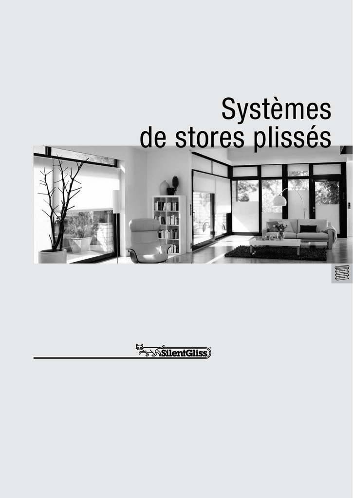 Systèmes de stores plissés 1 8510 2 Silent Gliss ® Systèmes de stores plissés Silent Gliss® 8510 Caractéristiques •Solution très fonctionelle et décorative pour ombrager des pièces dans les domaines privés et professionnels • Pour toutes les formes de fenêtres verticales, horizontales, jardins d’hiver et applications particulières • Grâce au petites dimensions des paquets, le plissé est idéal en cas de place limitée. Il peut être monté dans le cadre de la fenêtre • Diverses possibilités de commande: avec poignée, tirage à cordon, chaînette, manivelle ou électrique • Dispositifs pour la sécurité des enfants disponibles en option • Tous les profils en aluminium sont enduits à la poudre, couleurs standards blanc, gris- argent ou anthracite. Les pièces d’accessoires sont adaptées à la couleur des profils. • Un large assortiment de tissus (y compris des qualités traitées TOPAR et obscurcissantes) en 3 groupes de transparences différentes, sont à votre disposition • Largeur des plis 20 mm • Tous les modèles sont confectionnés sur mesure, prêts à la pose Silent Gliss ® 8510 3 Aperçu des groupes de produits Designation des modèles B B 20 1re lettre 2e lettre Chiffre Version de fenêtre/type de plissé Commande Forme de la fenêtre/forme du tissu A Plissé pour pose libre à la verticale O Tirage à cordon 10 Rectangles, 1 tissu fixé d’un côté B Fenêtres verticales, pivotantes ou basculantes avec inclinaison jusqu’à 15°, plissé avec guidage latéral K Chaînette 20 Rectangles, 1 tissu position libre B Poignée* 30 Rectangles, 2 tissus D Fenêtres à ouverture rotative ou basculante ou à balançoire avec inclinaison jusqu’à 60° R Manivelle 40 Fenêtres avec parties obliques E Electrique 50 Fenêtres en formes spéciales P Fenêtres pour plafonds avec inclinaison de 45° jusqu’à 90° F Fixe 60 Trapèzes 70 Triangles 80 Formes pentagonales et hexagonales 8510 * Standard: poignée en métal En option: poignée en matière synthétique (ajustable), indispensable lors de l’utilisation d’une tige de commande 4 Silent Gliss ® Aperçu des groupes de produits Modèles A B D P Modèles A Modèles B Modèles D Modèles P • • • • • • • pour pose libre à la verticale pour fenêtres rectangulaires et formes spéciales stores plissés suspendus librement (sans guidage latéral à cordon) diverses possibilités de commande à choix (dépendant du type choisi): chaînette, tirage à cordon ou électrique • • • pour fenêtres verticales (inclus fenêtres pivotantes et basculantes avec inclinaison jusqu’à 15° max.) pour fenêtres rectangulaires et formes spéciales avec guidage latéral à cordon diverses possibilités de commande à choix (dépendant du type choisi): poignée, tirage à cordon, chaînette ou électrique • • • les modèles D se prêtent à la pose sur des fenêtres à ouverture rotative ou basculante ou à balançoire (avec inclinaison jusqu’à 60° max.) seulement pour fenêtres rectangulaires avec guidage latéral par fil d’acier commande par une poignée • • • spécialement développé pour fenêtres horizontales ou en pente, sur coupoles ou jardins d’hiver. Inclinaison de 45° jusqu’à 90° (=horizontal) pour fenêtres rectangulaires et formes spéciales avec guidage latéral par fil d’acier permanent différentes commandes à choix (dépendant du type choisi): poignée, manivelle ou électrique 8510 Silent Gliss ® 5 Modes de commandes Modèles Types 10 / 20 / 30 A Plissé pour pose libre à la verticale O 40 Tirage à cordon 70 K 10 Chaînette E 10 Electrique B 8510 B Poignée Modèles avec guidage latéral pour fenêtres verticales 10 / 15 / 20 / 24 / 30 / 35 80 / 81 / 85 / 86 10 / 16 / 20 / 30 / 35 O 60 / 61 Tirage à cordon 75 K 10 / 16 Chaînette E 10 / 16 Electrique F 50 / 51 / 55 / 56 Fixe 6 Silent Gliss ® Modes de commandes Modèles D B Types 10 / 15 / 20 / 30 / 35 Poignée Fenêtres à ouverture rotative ou basculante ou à balançoire 10 / 15 / 30 / 35 40 / 41 / 45 / 46 P B 60 / 61 / 65 / 66 Poignée Fenêtres horizontales ou en pente, sur coupoles ou jardins d’hiver 70 / 71 / 75 / 76 80 / 81 / 85 / 86 10 / 11 / 15 / 16 E 8510 60 / 61 / 65 / 66 Electrique 70 / 71 / 75 / 76 10 / 11 / 15 / 16 R 60 / 61 / 65 / 66 Manivelle 70 / 71 / 75 / 76 Silent Gliss ® 7 Prise des mesures / Indications générales Mesurez les largeurs et les hauteurs plusieurs fois s.v.p., pour constater d’éventuels tolérances de la fenêtre ou du fond du montage. Utilisez ensuite pour le montage plafond (à l’intérieur du cadre) la plus petite mesure, respectivement pour le montage face (sur le cadre) les mesures de la largeur et de la hauteur. D’éventuels déductions ou suppléments doivent être effectués par vous-mêmes. Tenez compte d’éventuels ferrements de fenêtres en cas de montage sur le cadre de fenêtre. Indication importante pour le montage avec supports de serrage pour fenêtres en matière plastique (option M4) En cas d’utilisation de supports de serrage pour fenêtre en matière plastique, la largeur peut être mesurée à souhait; mais tenez compte des ferrements de fenêtres. Pour tous les modèles tendus, 2 cm doivent être déduits de la hauteur du battant de fenêtre pour obtenir la hauteur du système de stores plissés pour la commande. Pour les modèles suspendus libres, il faut déterminer la hauteur à commander individuellement, mais il faut déduire en haut 1 cm en hauteur. Fenêtres à ouverture rotative ou basculante ou à balançoire Les indications suivantes suffisent: - fabricant, marque de la fenêtre - modèle de la fenêtre p.ex. Velux GGU 104 (fabricant/marque “Velux”, modèle “GGU 104”) haut gauche droite bas 8510 Intérieur de la pièce 8 Silent Gliss ® Prise des mesures / Montage plafond Formes rectangulaires Déterminez les mesures du vide et faites les déductions vous-mêmes. Nous vous recommandons une déduction d