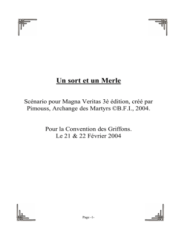 Un sort et un Merle Scénario pour Magna Veritas 3è édition, créé par Pimouss, Archange des Martyrs ©B.F.I., 2004. Pour la Convention des Griffons. Le 21 & 22 Février 2004 Page -1- I) Préambule : Les joueurs reviennent de mission en Roumanie. Celle-ci ne s’est pas bien passé du tout : leur mission était d’arrêter les agissements d’un sorcier, qui sévissait là-bas. Dans leur grand malheur le sorcier dénommé Nicolae Dumitrescu réussie à s’enfuir avec l’un de ses anciens grimoires. Donc échec partiel de la mission. Quand à Nicolae Dumitrescu, il a rejoint Londres pour étudier le vieux livre qu’il a ramené de Roumanie. Ayant eu du mal à déchiffrer le grimoire, il fit appelle à deux anges d’Yves (Sarah Expand & Eugénie Devport) en les invoquant. Au bout de quelques jours, Nicolae comprit que ce qu’il détenait, était inespéré pour un simple sorcier comme lui. Ce livre contenait le rituel exact pour libérer MERLIN. Dans sa quête de puissance, Nicolae entreprit d’exécuter le rituel. Après avoir suivit scrupuleusement les indications du rituel, Nicolae « échoua (pour lui) » dans cette quête. Donc il continue à essayer de déchiffrer le livre (avec ses acolytes) pour pouvoir enfin libérer Merlin. En faite Merlin est apparu dans une annexe désinfectée d’un manoir en banlieue de Londres, chose que Nicolae n’avait pas prévu. D’où son insistance à poursuivre ses recherches. Quant Merlin vit qu’il était de nouveau libre et en bonne santé, il entreprit plusieurs choses : - La première chose qu’il fit c’est de se protéger, en invoquant 2 démons : Walter O’Grady (Démon de Baal, Grade 3) et Elliot Parker (Démon de Morax, Grade 2). Pour éviter que les Anges et/ou les Démons remettent la main sur lui ! Mais cette protection ne lui suffisait pas, car il restait le grimoire, possédé par Nicolae, dans lequel le rituel d’emprisonnement y est inscrit. o Donc la mission spéciale d’Elliot est de retrouver le grimoire afin de le ramener à Merlin. o Quand à Walter, sa mission est bien entendue de protéger Merlin. - La deuxième chose qu’il fit c’est de prendre le contrôle du propriétaire du manoir, où il décida d’élire domicile. Par chance le propriétaire, un multimilliardaire dénommé Nasser Ilban faisant partie de la Jet Set, et qui se trouve être un Ange d’Hassan. - Et pour finir il se créa une nouvelle identité : Peter Kindy. Le but de Merlin est de récupérer son grimoire détenu par Nicolae. Mais le problème c’est qu’il ne s’est pas où le trouver pour le moment. Car pour pouvoir localiser son grimoire, Merlin doit rester concentré sur celui-ci. Malheureusement pour l’instant son apprentissage du monde nouveau lui prend beaucoup de temps, donc ses méditations pour localiser son grimoire sont assez éparses. Page -2- II) Introduction : Nous retrouvons notre équipe de choc de retour de cette mission la tête très basse. Les joueurs non pas étaient du tout récompensés et que même deux d’entre eux on était limité (Charles de La Rivière (ange de Walther) & Victor Gaillardou (ange de Joseph)) pour une durée indéterminée. De ce faite le chef de l’équipe qui était l’ange de Walther a été rétrogradé temporairement à fin de méditer sur ses erreurs. Donc c’est à vous de choisir le nouveau chef de mission parmi le reste de l’équipe évidemment l’ange de Joseph est exclu aussi pour ce poste pour cela nous avons comme candidats au poste : Angelina Vasquez (ange de Blandine), Mickëy Ripley (ange de Jean-Luc), André Michaux (ange de Laurent) et pour finir Giovanni Rigatelli (ange de Jordi). Note : Vous devez impérativement avoir l’Ange de Walther et l’Ange de Joseph comme personnage au tour de votre table. Leur contact habituel est un certain prêtre qui se nomme le Père François Morgue, celui-ci sévit à Champeaux, en Seine-et-Marne à côté de Melun (Annexe 1). De retour de leur « splendide mission » en Roumanie, les joueurs sont convoqués quelques semaines plus tard, à l’église de Champeaux. Là le Père François Morgue leurs confie une mission dite de « routine ». Arrivés au presbytère le père leur remettra un fax qu’il a reçu du Père Agley (Annexe 2) officiant dans l’église St Andrew, à Londres. Celui-ci, lors de sa messe dominicale, a eu une visite un peu inattendue. Un homme nu a pénétré lors de l’office, une arme blanche à la main, faisant peur à ses ouailles. Certains furent blessés, ce qui entraîna l’arrestation de l’individu (Elliot Parker). Leur contact leurs remet un billet aller-retour Paris-Londres en Eurostar à chacun. Quand à l’hôtel, ils verront sur place avec le Père Agley. Après ça il les congédie en leurs souhaitant bonne chance et que cette fois ils réussissent. III) Que s’est-il passé à l’Eglise St Andrew ? : Peter Kindy, dans la recherche de son grimoire, envoya Elliot à Londres afin d’effectuer une mission de reconnaissance. Suite à un relâchement de l’emprise de Merlin sur Elliot, celui-ci péta un plomb et alla faire son gigolo dans l’Eglise de St Andrew. Dont vous connaissez la suite. Dès que Peter s’aperçue du relâchement de l’emprise sur Elliot et des problèmes que cela avait entraîné, il décida de faire intervenir Nasser. Celui-ci de son côté fit appelle à son avocat Brad Colway. Afin de faire libérer Elliot pour vice de procédure, celui-ci soudoya « divinement » les autorités compétentes. Tout ceci avant l’arriver des joueurs à Londres. Page -3- IV) A l’Eglise St Andrew : Un peu d’histoire : Cette église échappa au Grand Incendie, mais fut cependant reconstruite. Le site a été successivement occupé par des églises de style saxon, roman, puis gothique. Au 17e siècle, Christopher Wren dessina une longue basilique de pierre avec deux niveaux de fenêtres. Notez la pierre de la Résurrection (mur extérieur Nord) et les figures de deux enfant