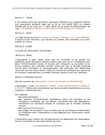 STATUTS TYPE DE CLUBS D'EDUCATION CANINE ET D'UTILISATION ARTICLE 1 – FORME Il est formé entre les personnes physiques adhérant aux présents statuts une association déclarée régie par la loi du 1er juillet 1901 (en Alsace Moselle par la loi civile du 1er août 2003) et.qui prend la dénomination de Club LES BARGES CANINS, CLUB D’EDUCATION CANINE ET D’AGILITY ARTICLE 2 – SIEGE Le siège social est fixé à la Mairie de Barges 5 Grande rue 21910 BARGES. Il pourra à tout moment, par décision du Comité, être transféré à un autre endroit en France. ARTICLE 3 – DUREE La durée de l'Association est illimitée. ARTICLE 4 - OBJET L'Association a pour objet d'une part de conseiller et de guider ses adhérents dans l'éducation de leurs chiens pour que ceux-ci s'intègrent bien dans l'environnement social, et d'autre part d'assurer la promotion et la bonne pratique des activités canines reconnues par la Société Centrale Canine pour permettre le développement des aptitudes des différentes races afin que les chiens soient mieux en mesure de participer aux épreuves et concours organisés par la Société Centrale Canine et par ses membres. ARTICLE 5- MOYENS D'ACTION Elle est membre de l'Association Canine Territoriale de BOURGOGNE. L'association "Club LES BARGES CANINS, CLUB D’EDUCATION CANINE ET D’AGILITY" diffuse des informations par tous procédés (publications sur tous supports, conférences etc.) Elle organise : • des démonstrations, • des séances d'entraînement spécifiques selon les activités et les disciplines pratiquées par les chiens, encadrées par des éducateurs, entraîneurs et moniteurs formés et reconnus par la Société Centrale Canine, • des épreuves et concours. • des stages de formation (mis en place par les Commissions Nationales) et d’initiation dont l'organisation lui est déléguée par l'association canine territoriale. L'Association peut mettre ses infrastructures à la disposition de l'Association Canine Territoriale et des Associations de race . A.G EXTRAORDINAIRE DU 6 FEVRIER 2016 Page 1 sur 10 ARTICLE 6 – COMPOSITION : L'Association se compose membres d'honneur. d'adhérents, d'adhérents bienfaiteurs, de Pour être adhérent, il faut en faire la demande, en joignant le montant de la première cotisation (et du droit d'entrée éventuel) et certifier sur l'honneur, n'avoir jamais été condamné pour sévices et/ou mauvais traitement à animaux. Le Comité statue, au besoin à bulletin secret, et n'est pas tenu de faire connaître les raisons de sa décision. Si l'adhésion est acceptée, la qualité de membre est attribuée rétroactivement au jour du dépôt de la demande. Si l'adhésion est refusée, le montant de la première cotisation est restitué sans délai. Un adhérent est qualifié de bienfaiteur s'il acquitte une cotisation égale au moins au double de la cotisation fixée par le Comité. Le titre de "membre d'honneur" peut être décerné par le Comité à toute personne ayant rendu des services à l'Association. Les membres d'honneur peuvent être consultés mais ne sont ni éligibles ni électeurs. ARTICLE 7 RESSOURCES Les ressources de l’Association sont : ◦Les droits d’entrée et des cotisations versés par ses membres, ◦Les revenus des biens ou valeurs qu'elle possède ◦Les subventions et dons qui lui sont accordées ◦Les droits perçus pour participer aux manifestations qu'elle organise, ◦Et plus généralement toutes ressources autorisées par la loi. ARTICLE 8 - COTISATIONS ET DROIT D'ENTREE Le Comité fixe chaque année le montant du droit d'entrée Le montant des cotisations est fixé chaque année par le Comité. La cotisation est due pour l’année en cours par tout membre admis avant le 1er octobre. A partir du 1er octobre, les cotisations recueillies lors d’adhésions nouvelles seront comptées pour l’année suivante mais l'ancienneté sera décomptée depuis la demande d'adhésion. Ensuite, la cotisation est payable dans le courant du premier trimestre de chaque année. Deux personnes vivant ensemble peuvent ne payer qu'une cotisation réduite dont le montant est fixé par le Comité. Elle dispose, chacune, du droit de voter à l'assemblée générale. STATUTS TYPE DE CLUBS D'EDUCATION CANINE ET D'UTILISATION - A.G EXTRAORDINAIRE DU 6 FEVRIER 2016 Page 2 sur 10 ARTICLE 9 – PERTE DE LA QUALITE DE MEMBRE a) Démission : Les membres de l'association peuvent démissionner; la preuve de cette démission peut être faite par tous moyens. b) La Radiation de plein droit sera acquise sans formalité : Si un adhérent ne remplit plus les conditions requises pour être membre, Si la cotisation n'est pas payée dans le mois de la réception d'un avertissement recommandé avec accusé de réception, En tout état de cause, et même si aucun avertissement n'a été adressé, le non paiement de la cotisation de l'année au plus tard lors de l'assemblée générale de l'année suivante, entraînera la radiation de plein droit sans formalité. Dans tous les cas, les radiations de plein droit seront notifiées. c) Exclusion Le non respect des présents statuts, du règlement intérieur et plus généralement des règlements de la Cynophilie Française définis par la Société Centrale Canine, une faute grave contre l'honneur ou une attitude démontrant que l'adhérent n'a plus la volonté de collaborer à l'objet social peut entraîner l'exclusion suivant les règles définies au règlement intérieur de sorte que soient respectés les droits de la défense. Le Conseil de Discipline pourra infliger les sanctions suivantes: · avertissement · exclusion temporaire ou définitive de l'association · demande à l'Association canine territoriale d'engager la procédure de retrait de licence à titre temporaire ou définitif. La décision du Conseil de discipline peut être soumise à la censure de l'Association canine territoriale statuant en qualité de Juridiction d'appel. La décision de 